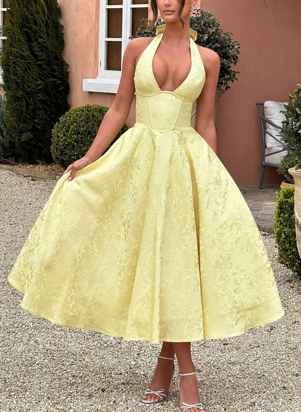 유럽과 미국의 크로스보더 브이넥 홀터넥 자카드 드레스, 고급 이브닝 드레스, 봄 여름 기질의 민소매 백리스 허리 롱 스커트