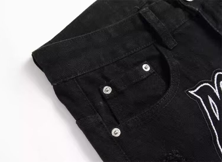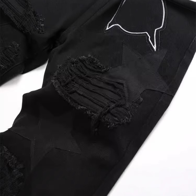 하이 스트리트 블랙 리핑 청바지 남자 5 점 스타 패치 루즈 스트레이트 비 탄성 올 매치 캐주얼 롱 트렌디 팬츠스토어 가기