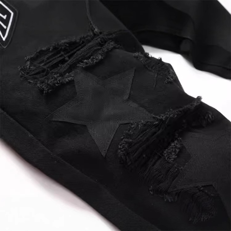 하이 스트리트 블랙 리핑 청바지 남자 5 점 스타 패치 루즈 스트레이트 비 탄성 올 매치 캐주얼 롱 트렌디 팬츠