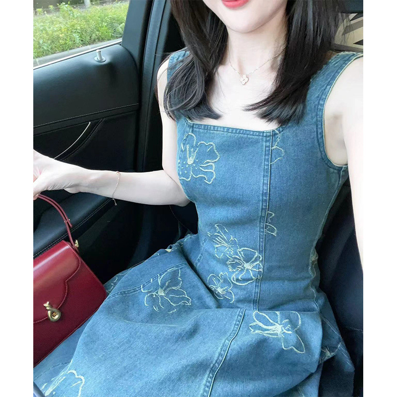 여름 새로운 스타일 간단하고 관대 한 레트로 Guofeng 데님 조끼 원피스 여성의 우아한 긴 원피스