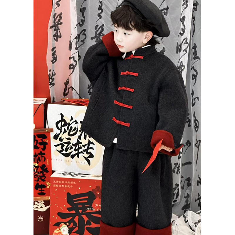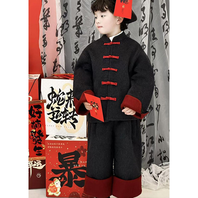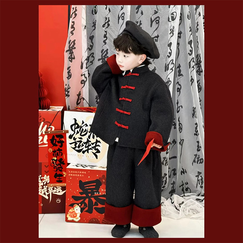 남아 아기 세련되고 축제적인 새해복 세트 2026년 신상 겨울 아동복 중소형 아동용 코트와 바지 투피스 세트