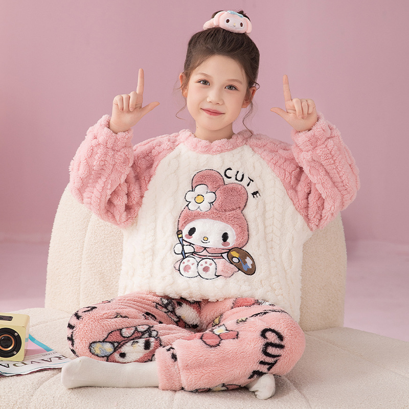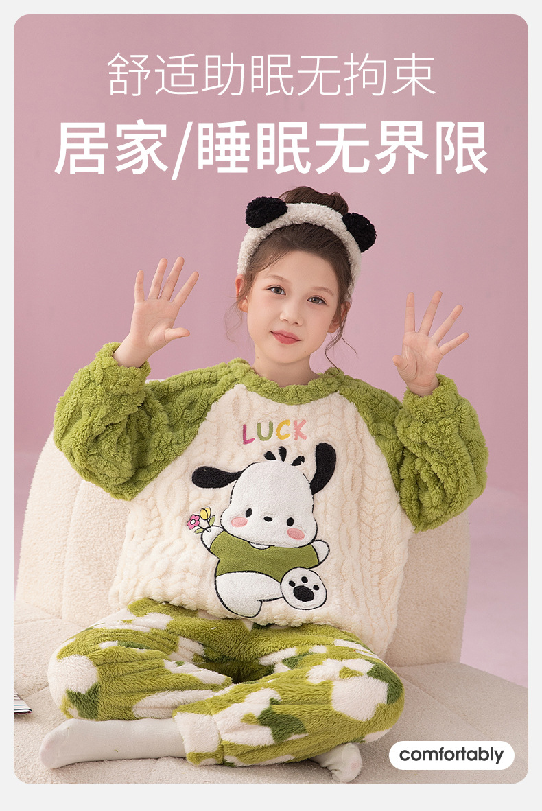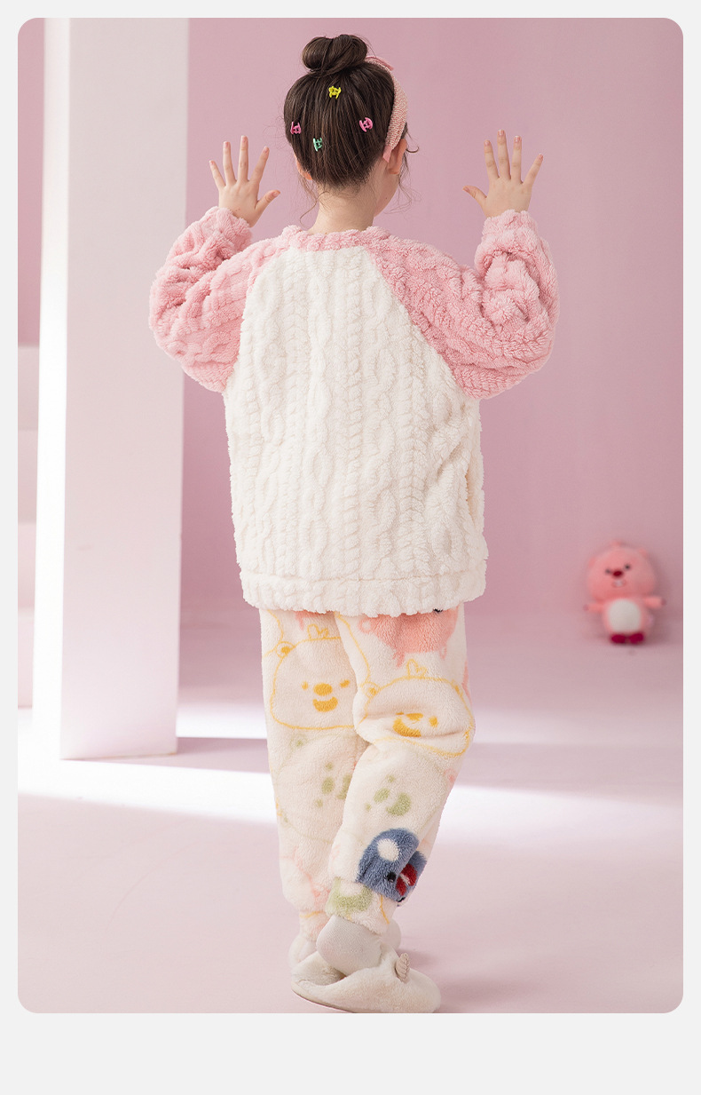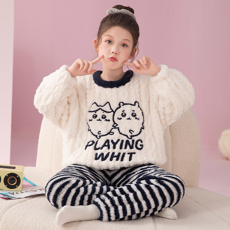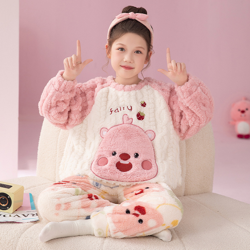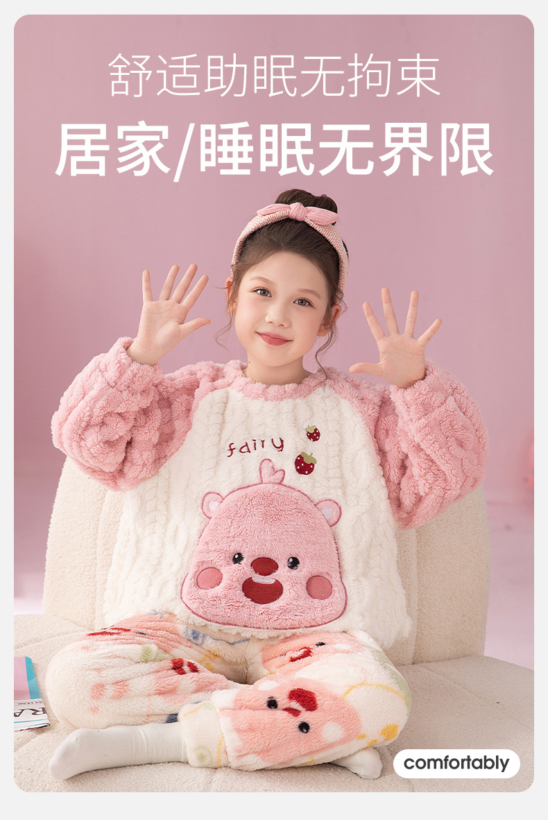 어린이 잠옷 소녀의 2024 새로운 가을과 겨울 산호 양털 큰 어린이 두꺼운 기모 스타일러스 소녀의 집 옷