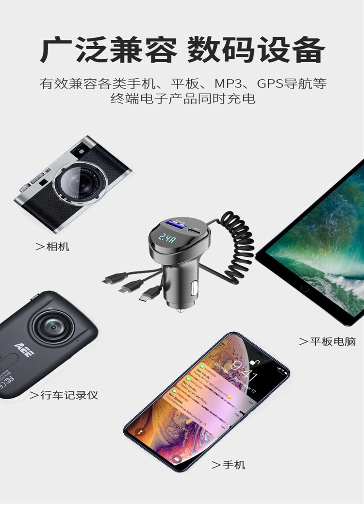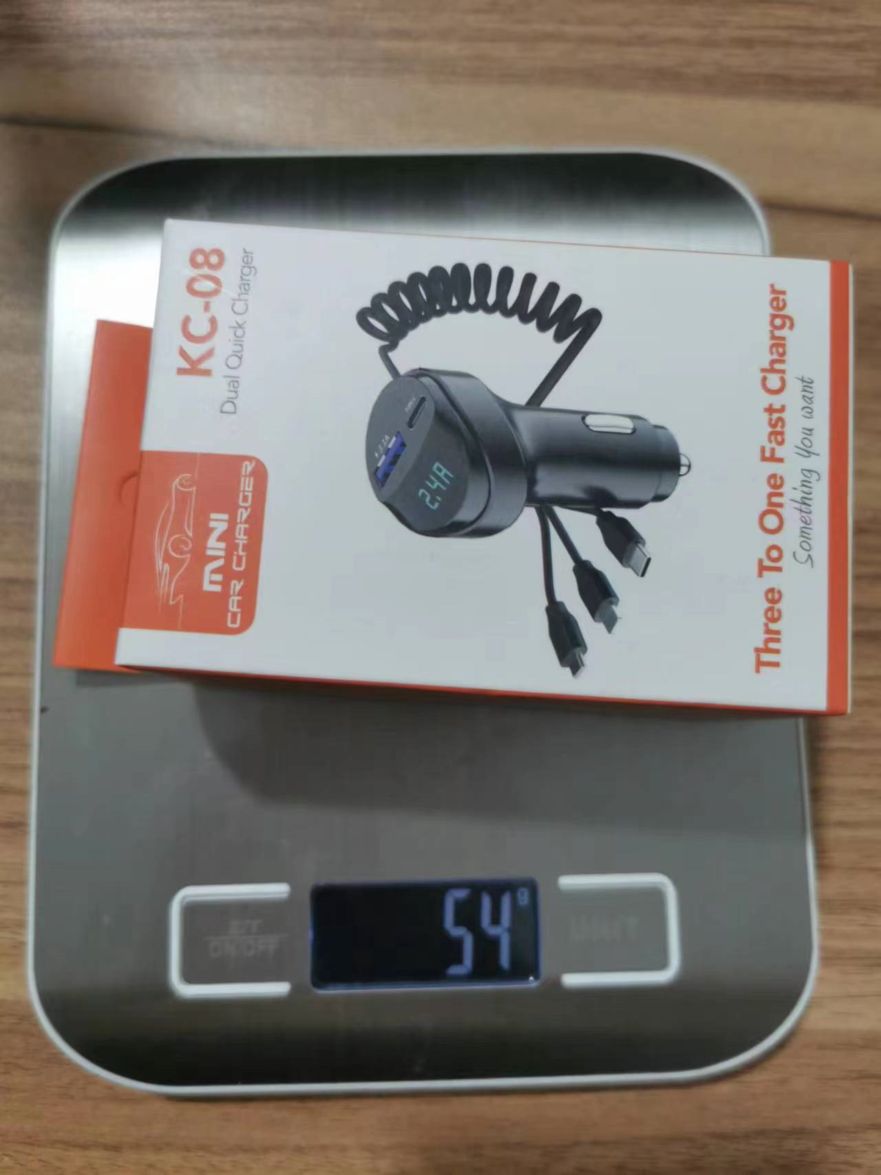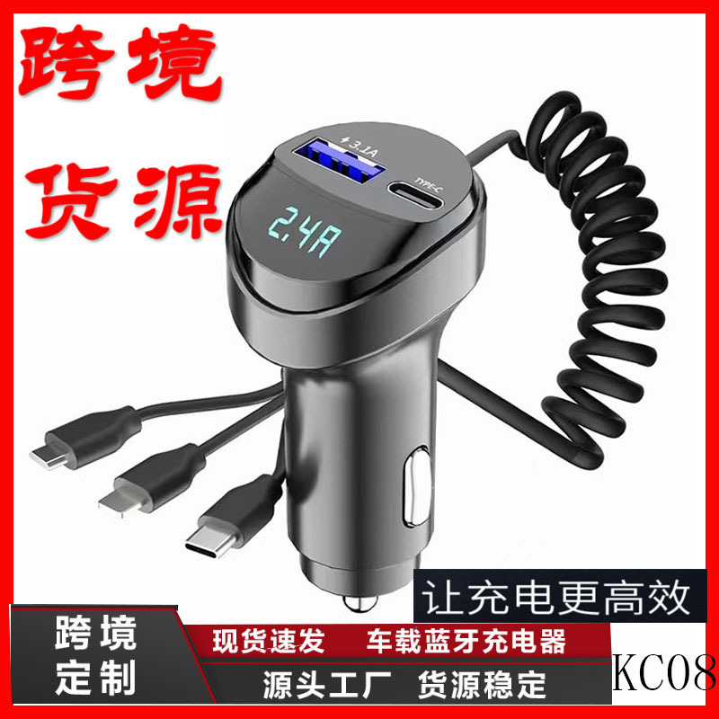 개인 모델 KC08 자동차 충전기 3 대 1 텔레스코픽 충전 케이블 전압 디스플레이 TYPE-C 자동차 충전기로 빠른 충전