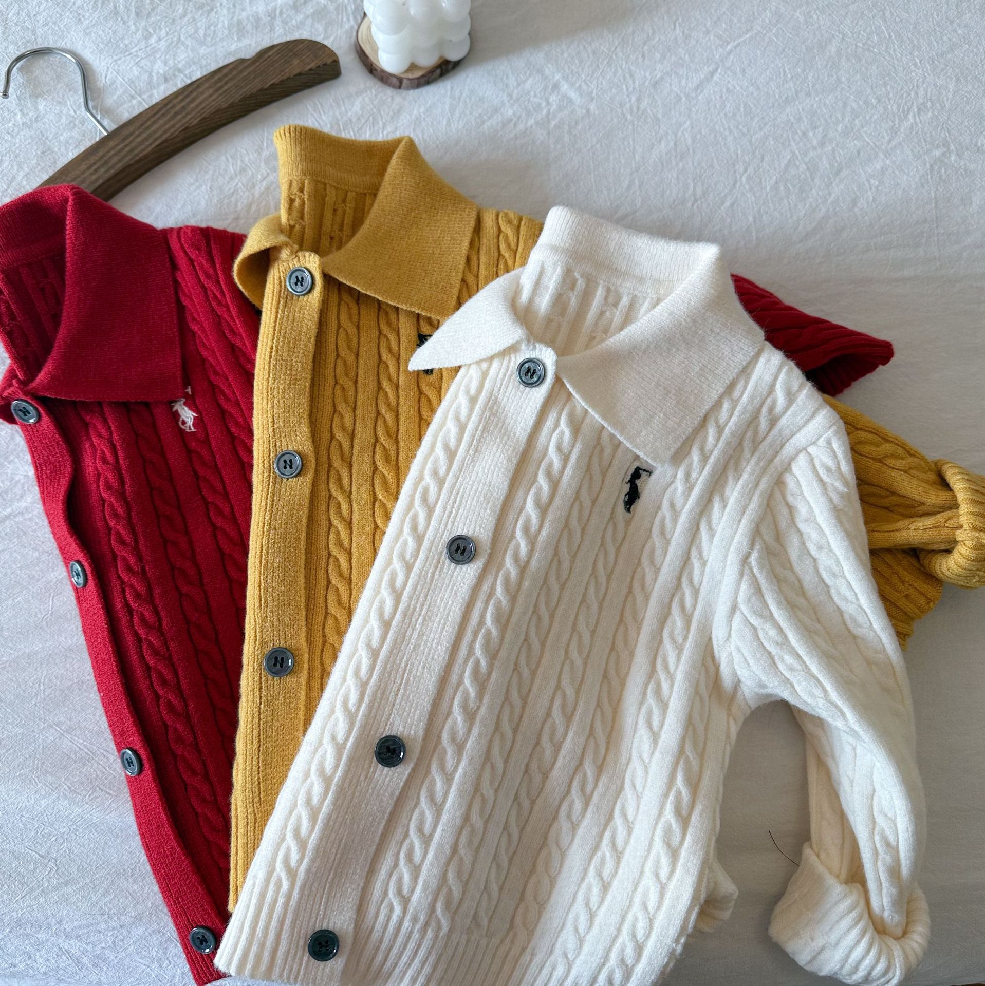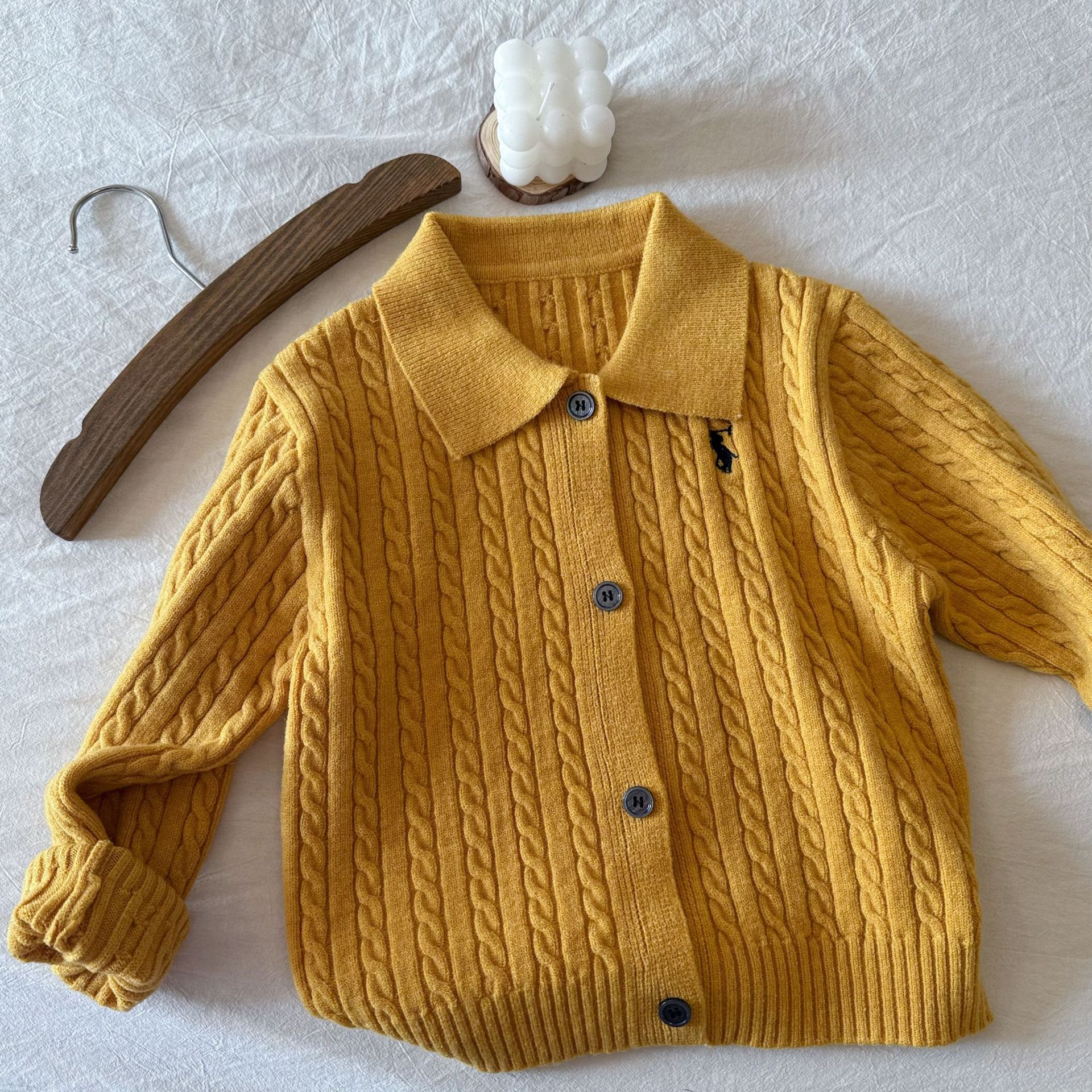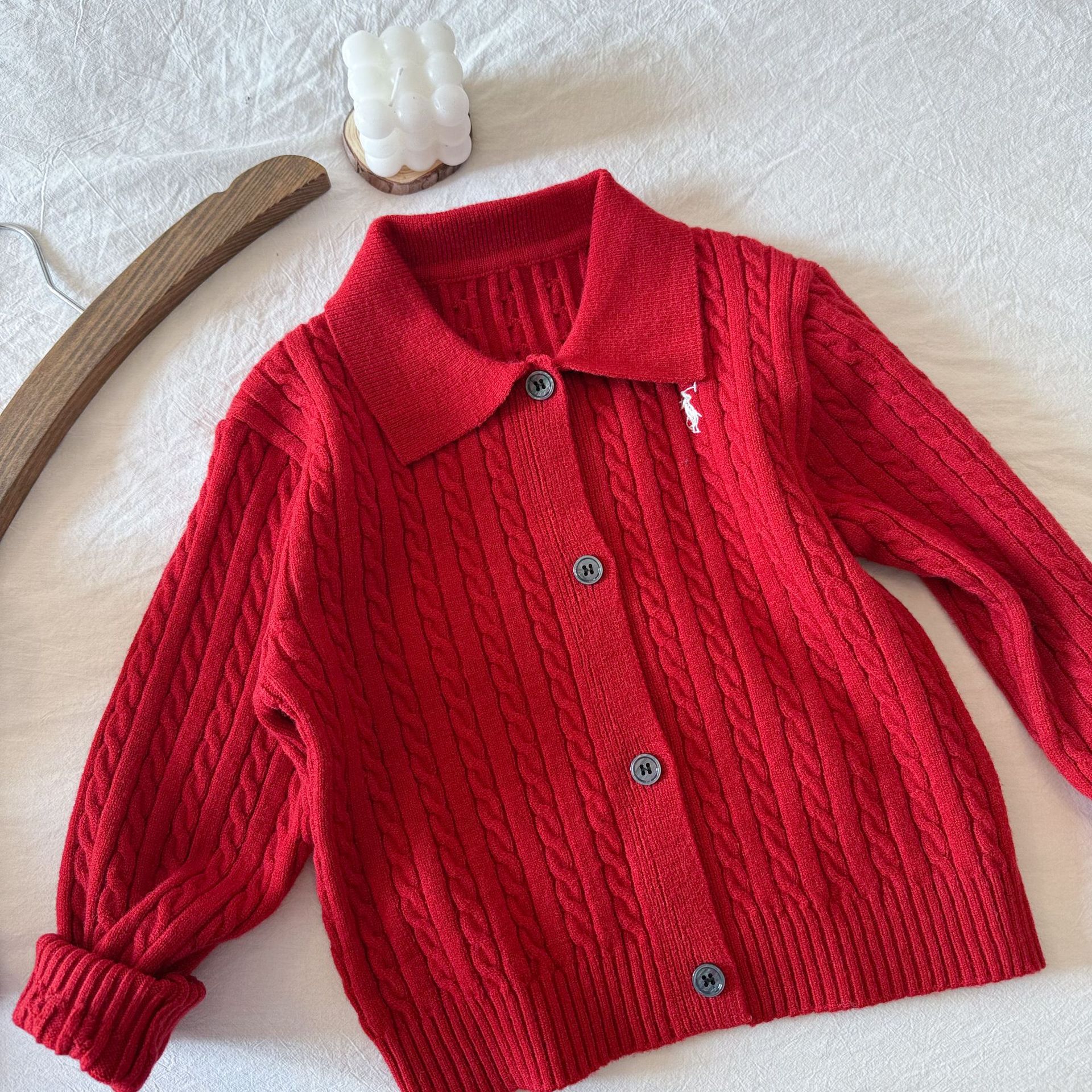 어린이 스웨터 2025 봄 새 도착 소년 소녀를위한 자수 립 니트웨어 아기 트위스트 카디건 신년 옷