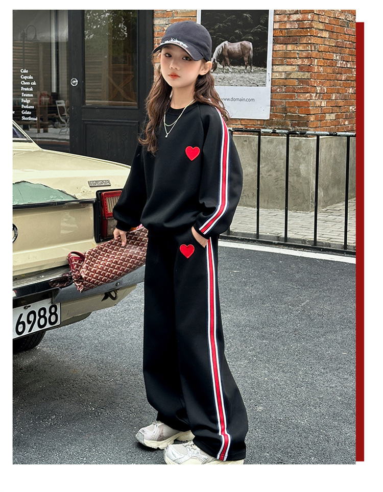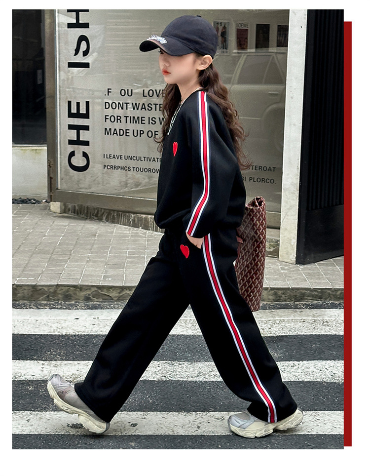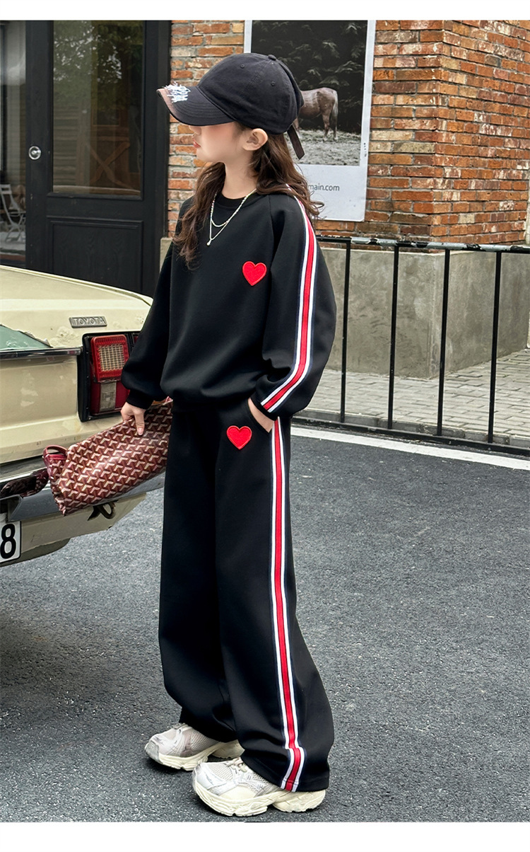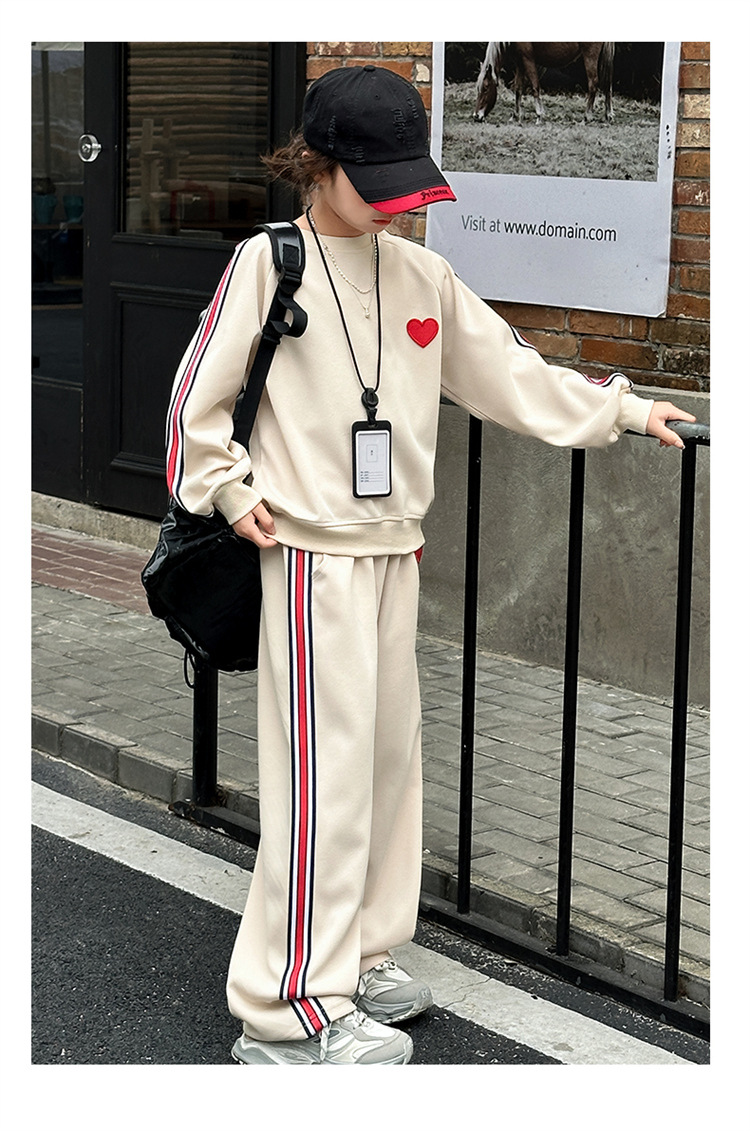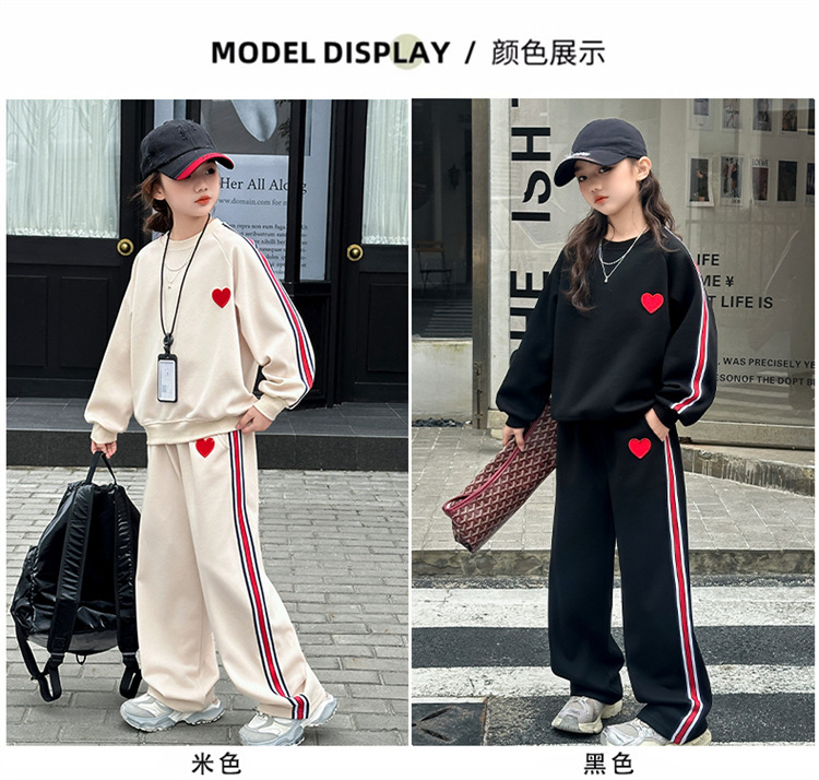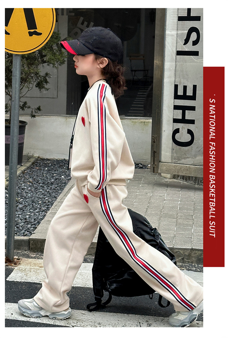 소녀의 봄철 스포츠 세트 2025 새로운 서양식 소녀의 봄 캐주얼 땀 큰 어린이 넓은 다리 바지 투피스 세트스토어 가기