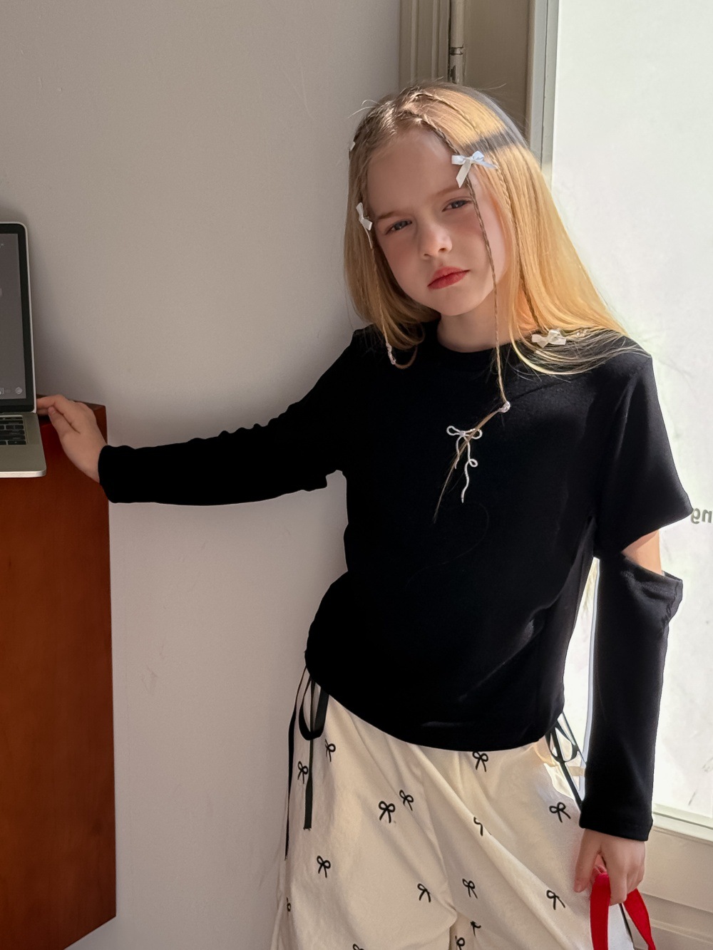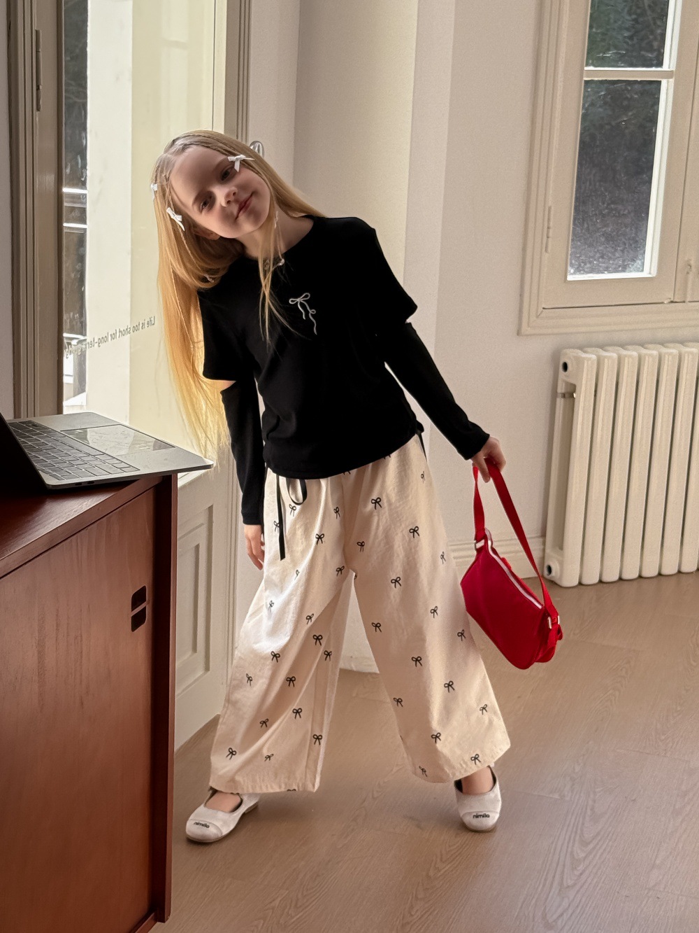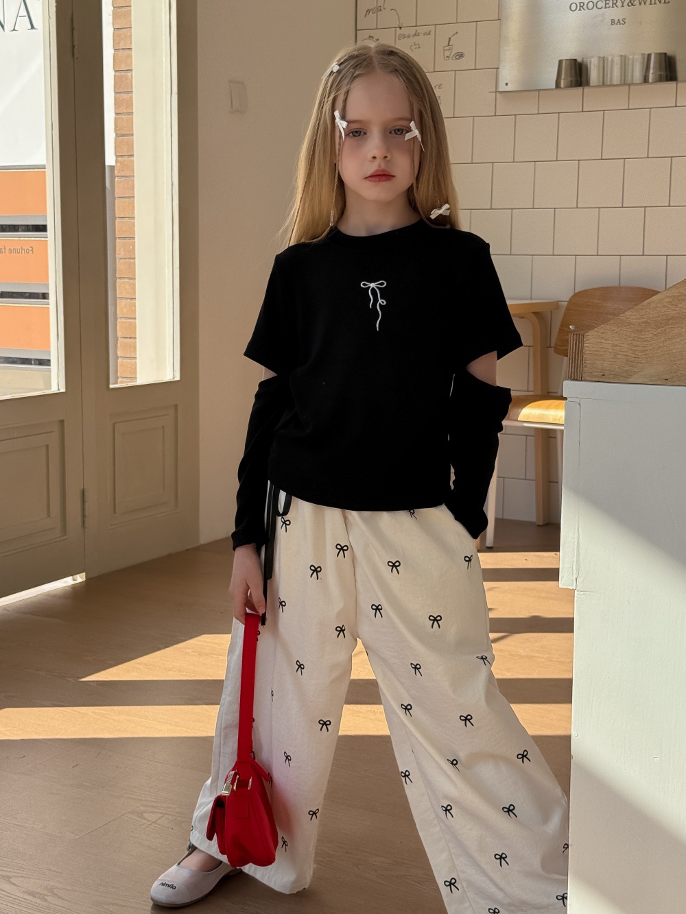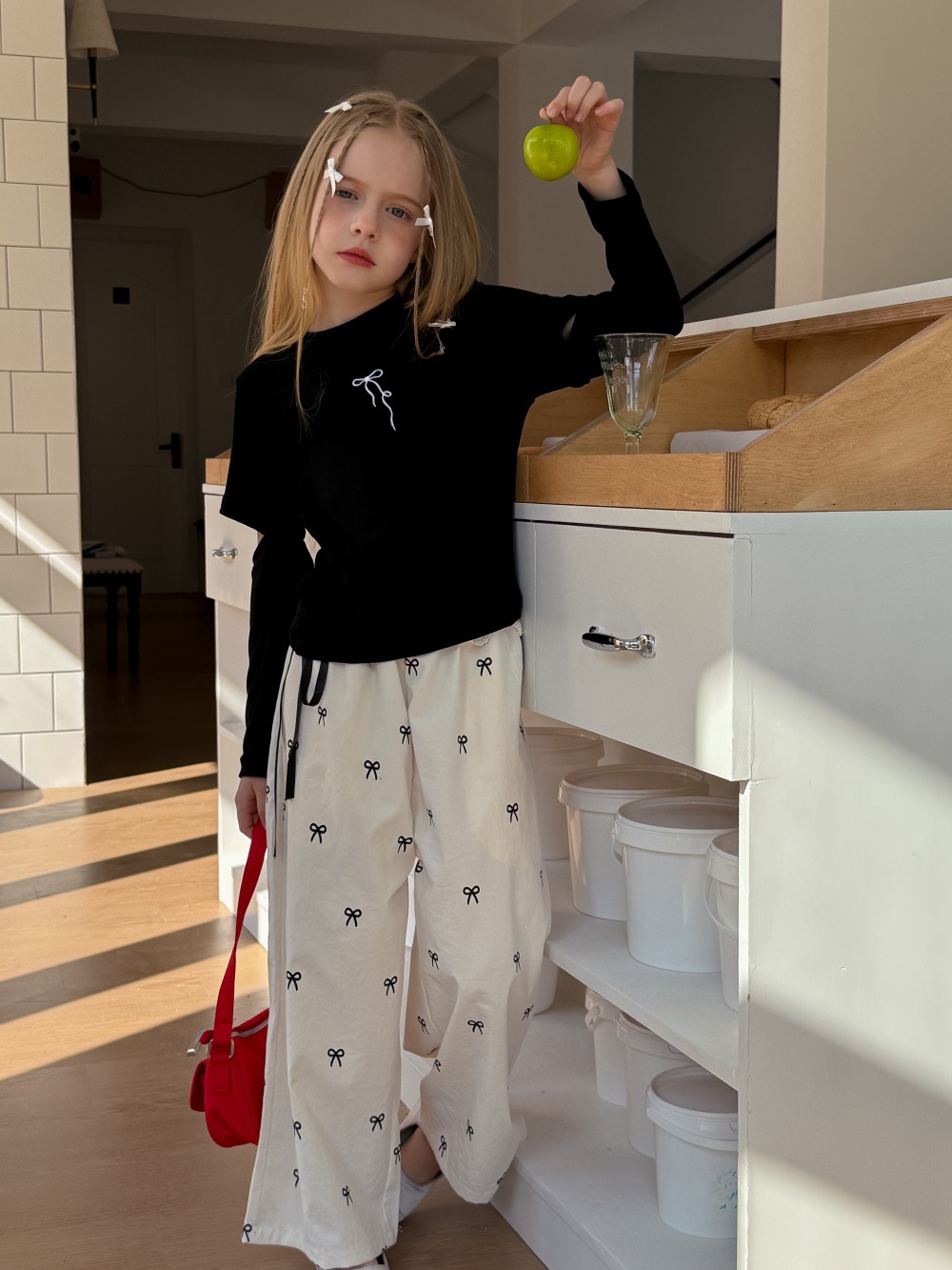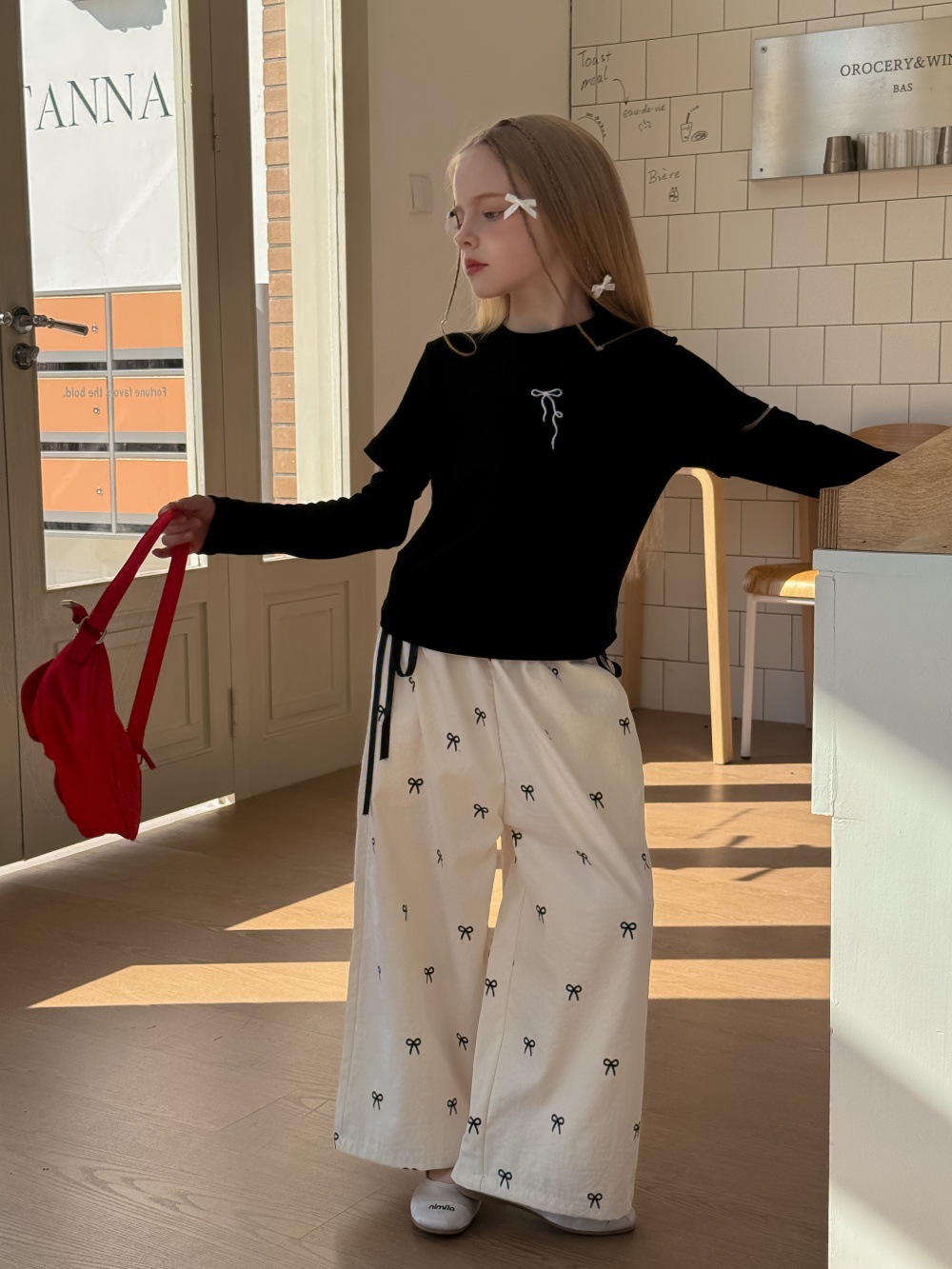 2025 봄과 가을 새로운 스타일 Bowknot 요소 소녀의 미국 슬림 피트 셔츠 어린이 중대형 어린이 스트레치 티셔츠