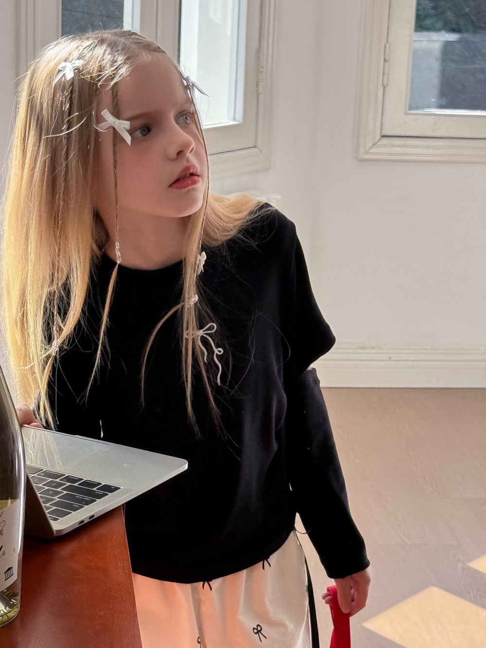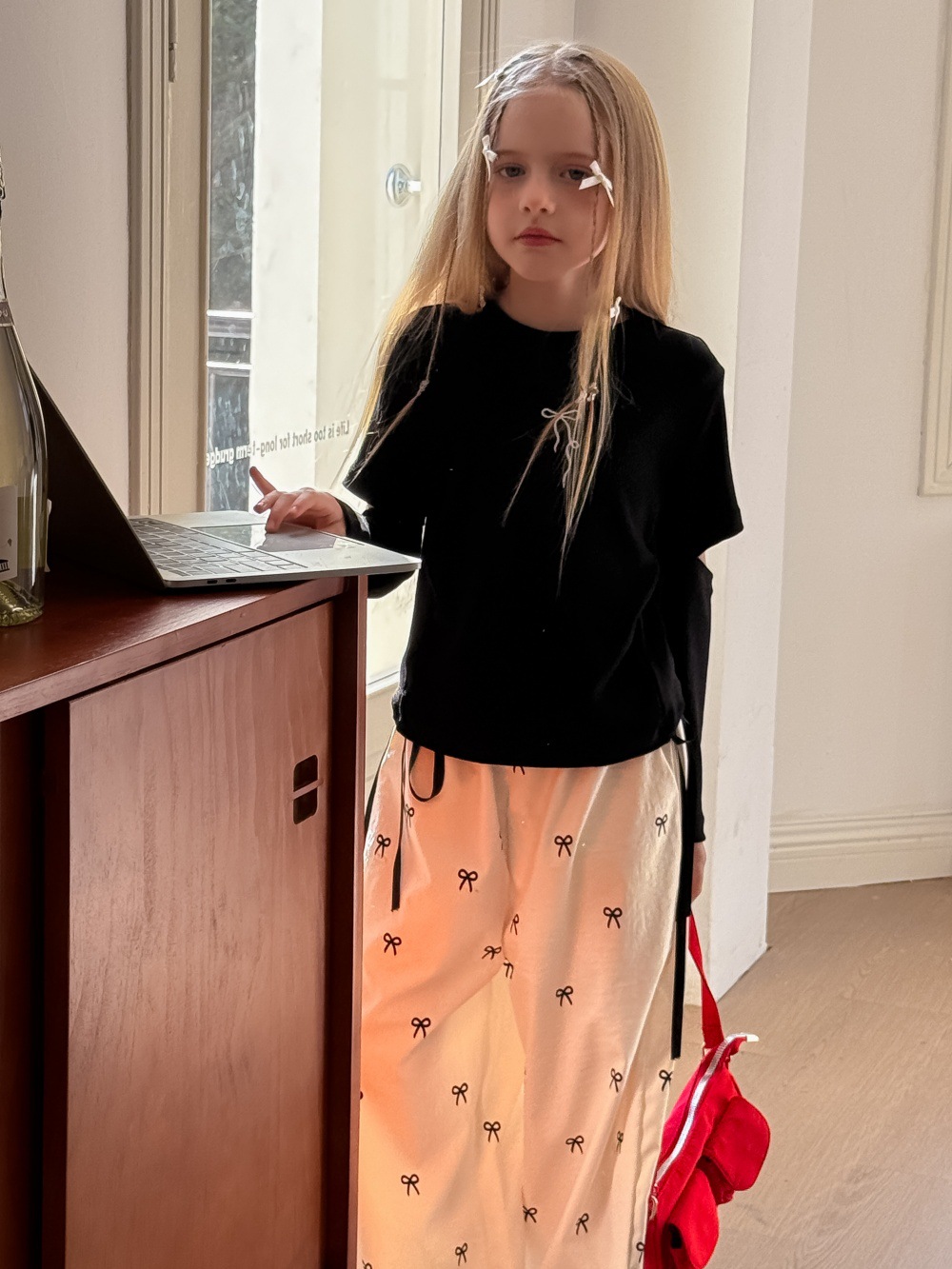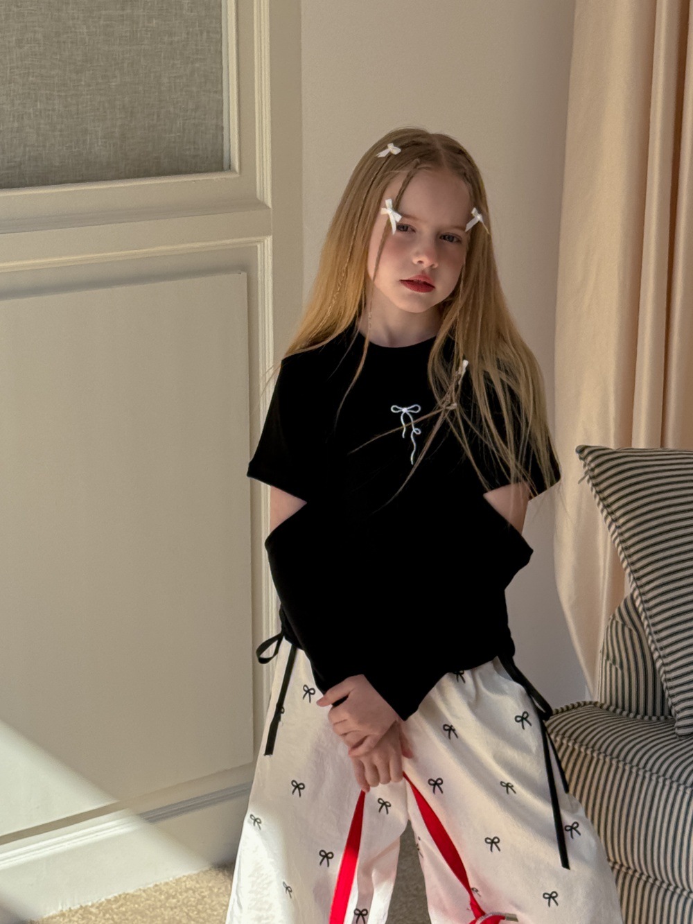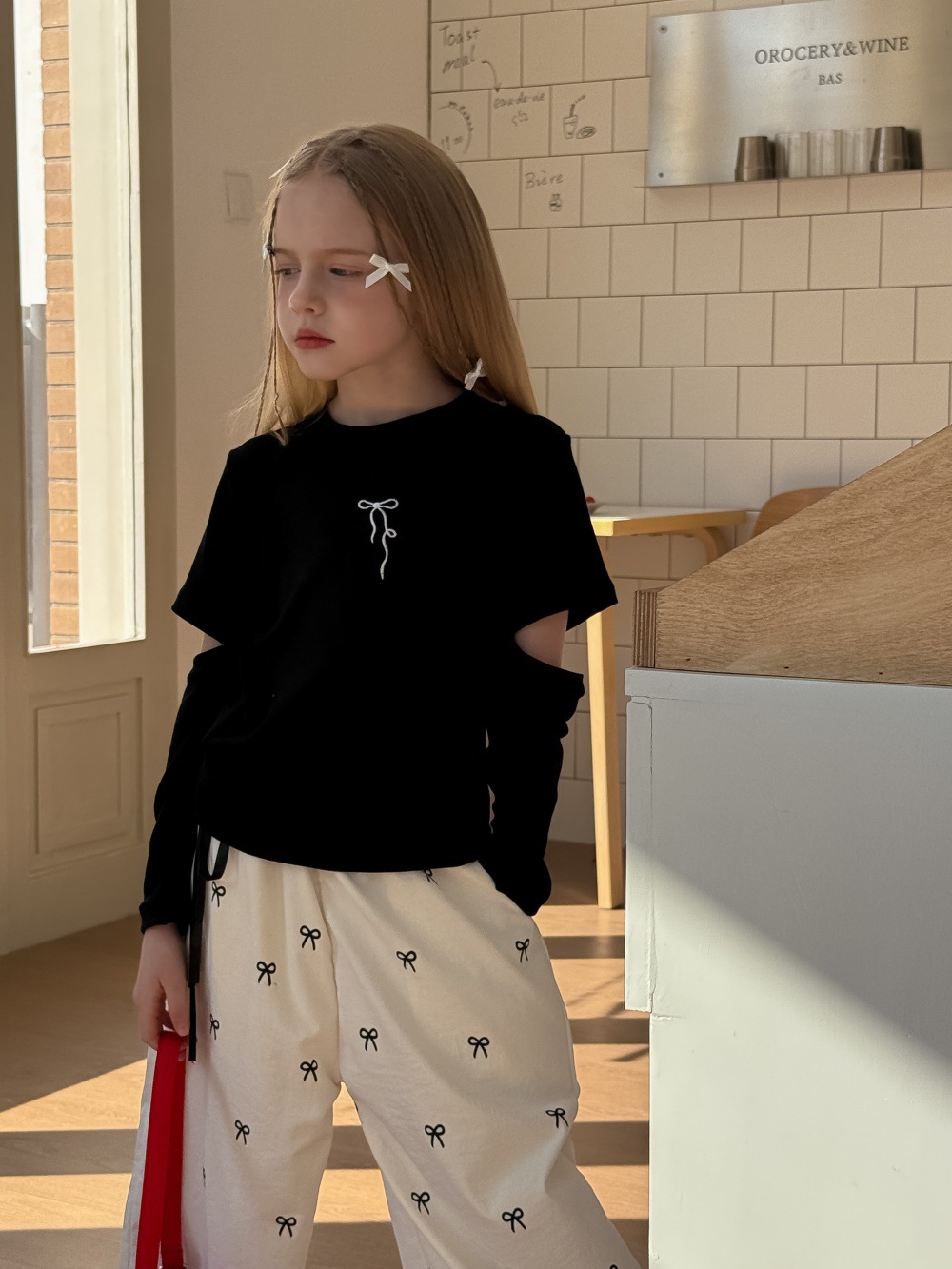 2025 봄과 가을 새로운 스타일 Bowknot 요소 소녀의 미국 슬림 피트 셔츠 어린이 중대형 어린이 스트레치 티셔츠스토어 가기