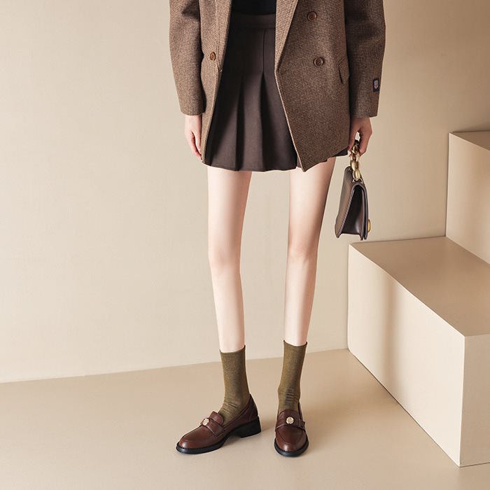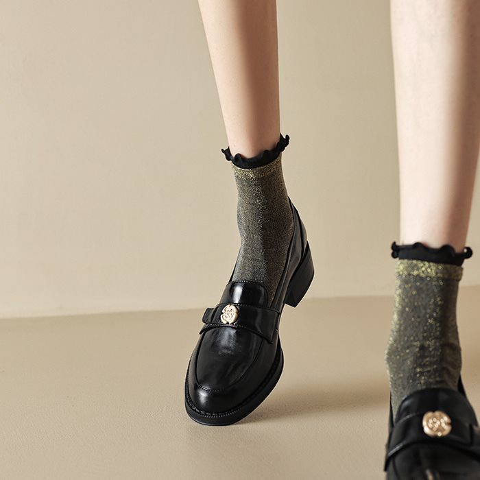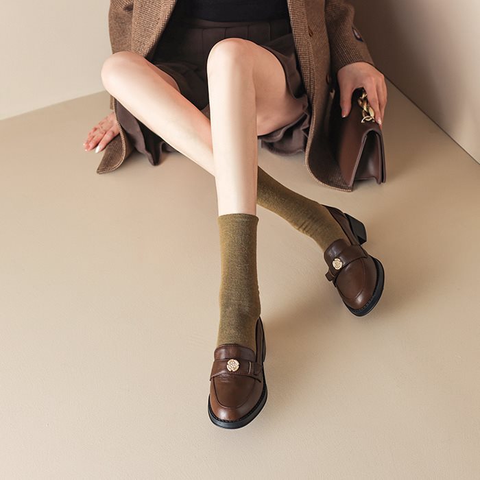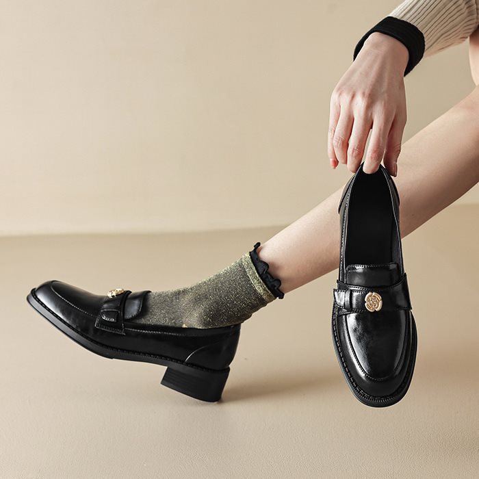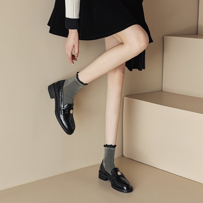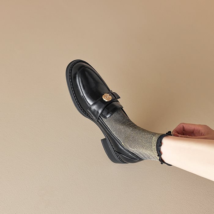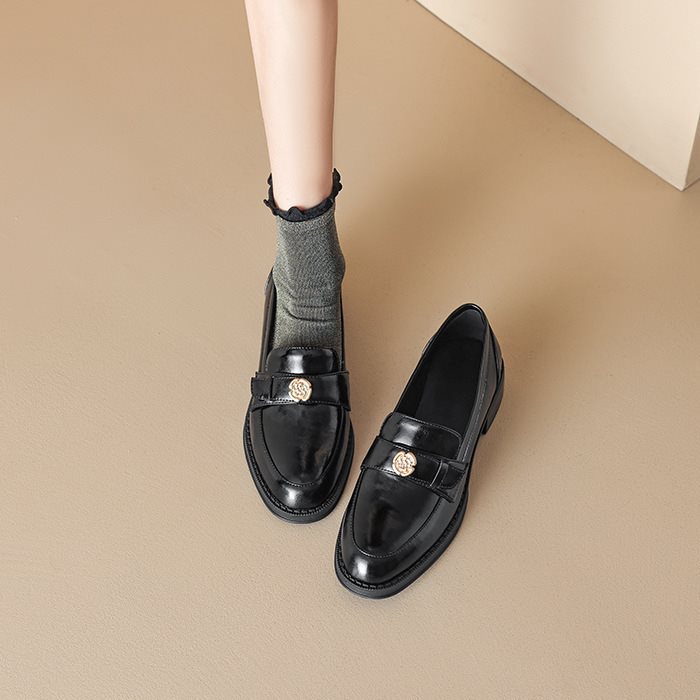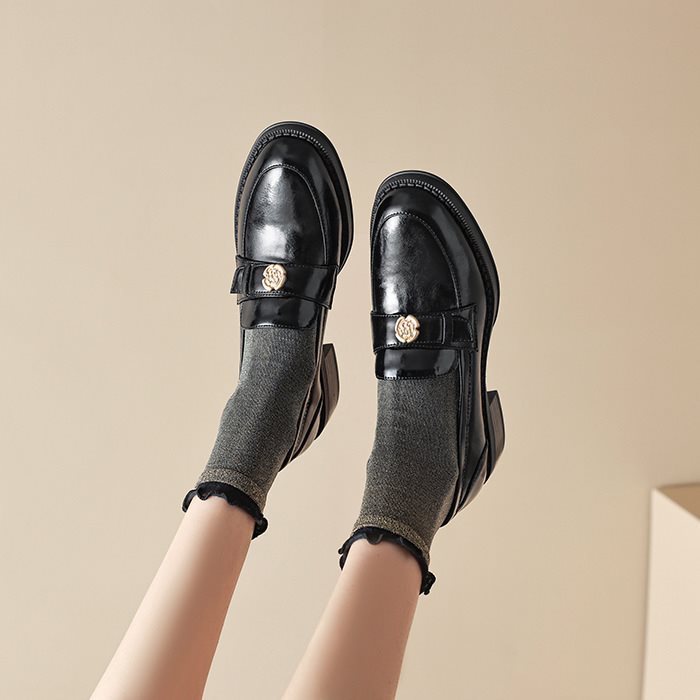 영국 파리 작은 가죽 신발 왼쪽 은행 특허 가죽 두꺼운 힐 골드 버클 블랙 싱글 레이어 신발 로퍼 여성 다크 브라운 라운드 토 재고