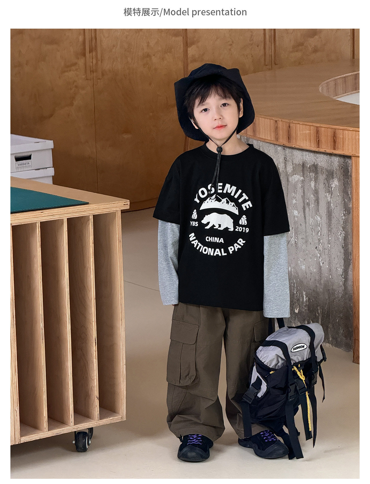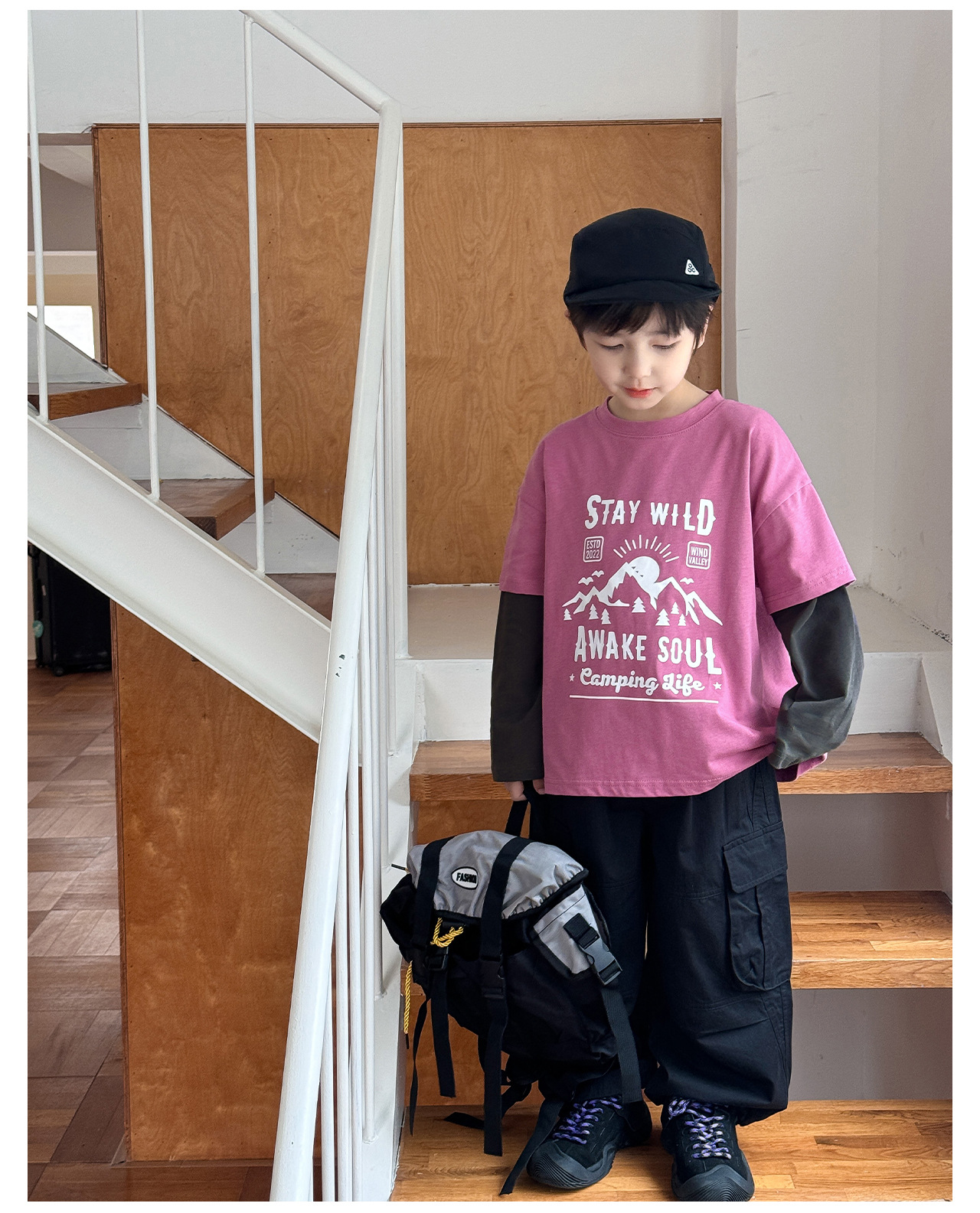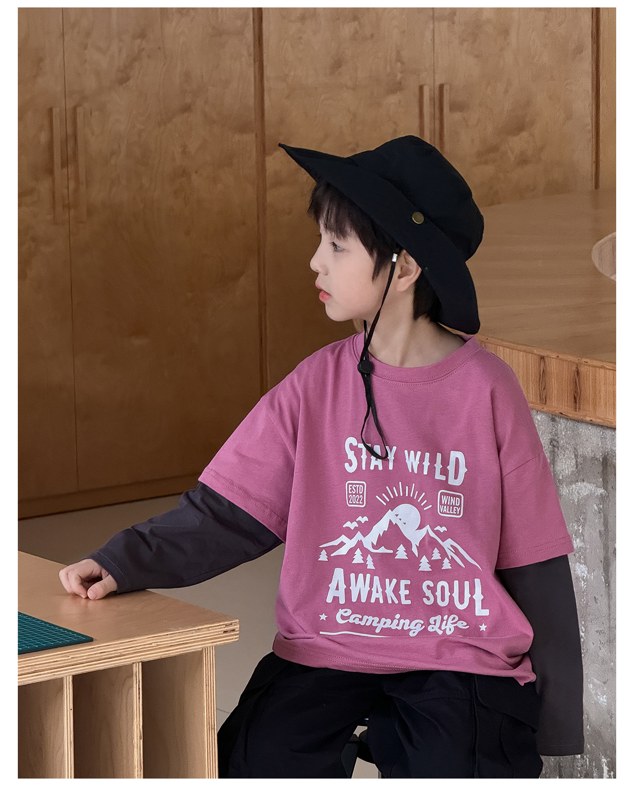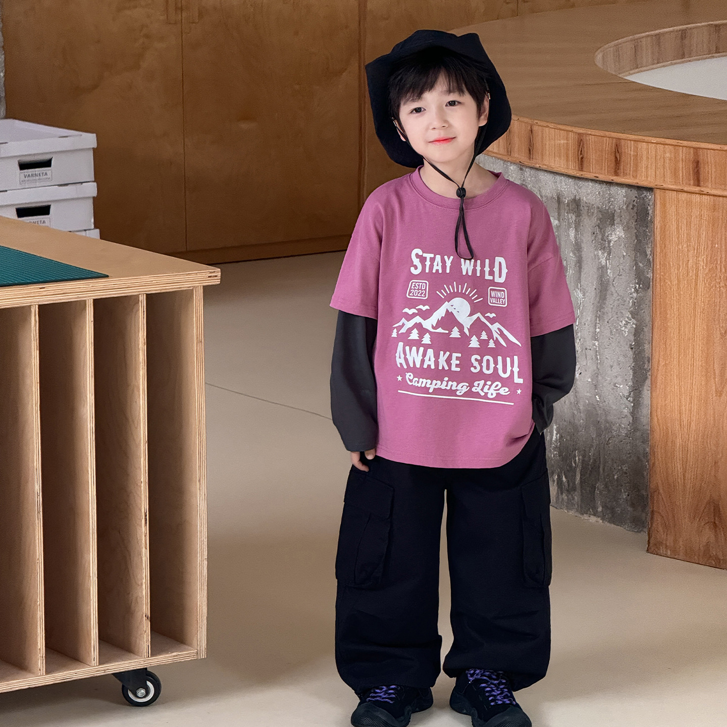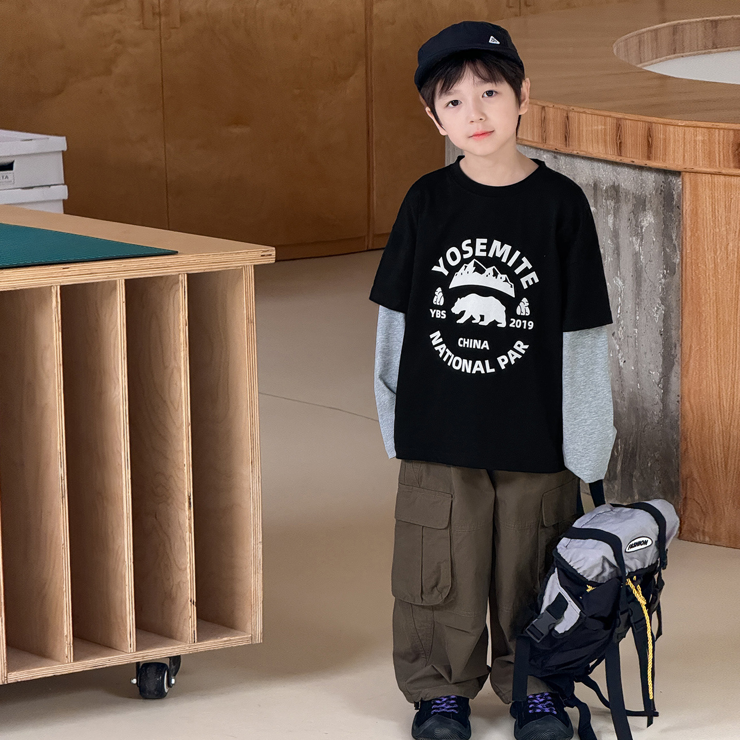 Tongku 2025 봄 신작 Huzhou Zhili 아동복 한국 스타일 소년 가짜 투피스 마운틴 스타일 프린트 아동 티셔츠 트렌드스토어 가기