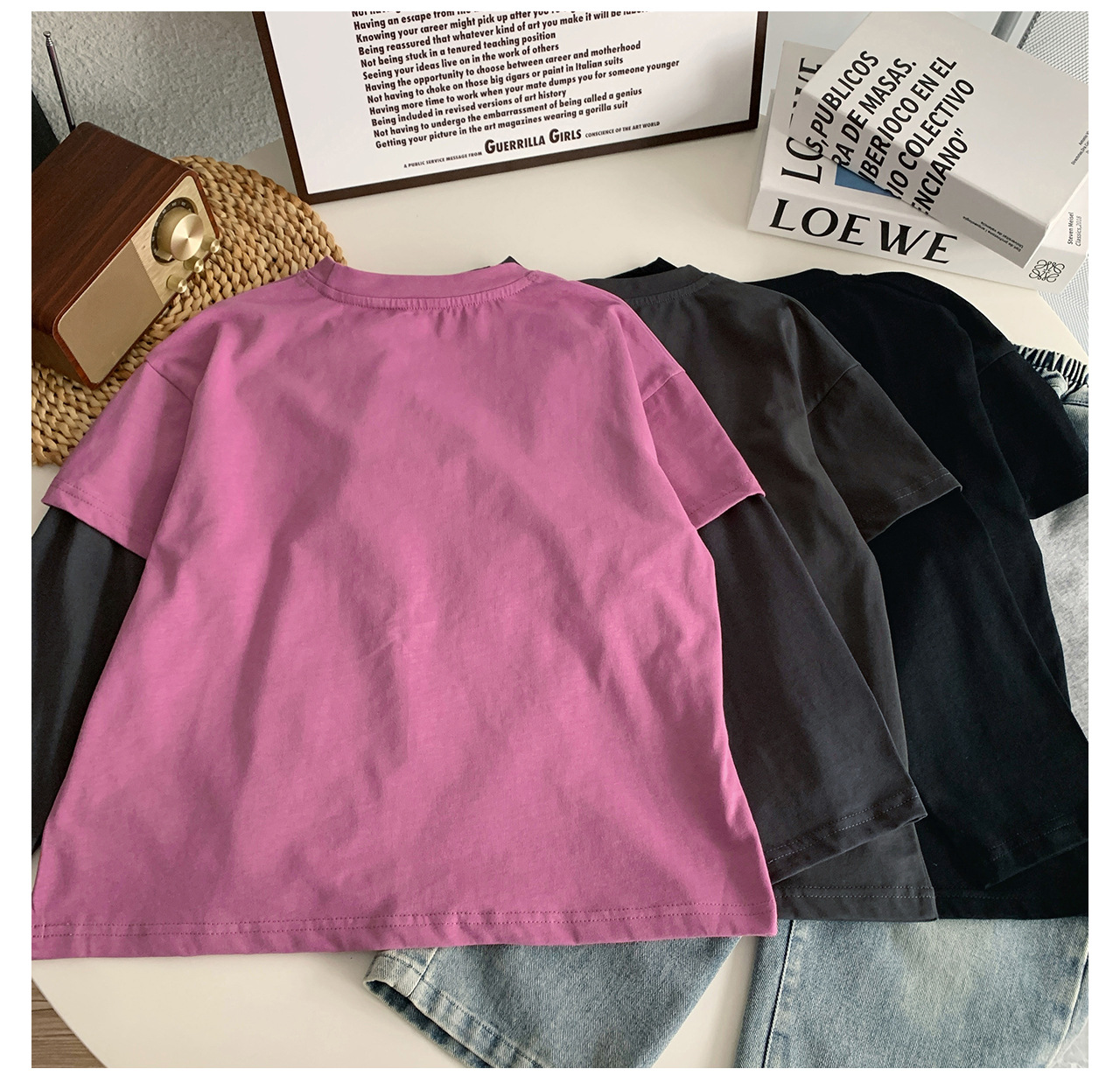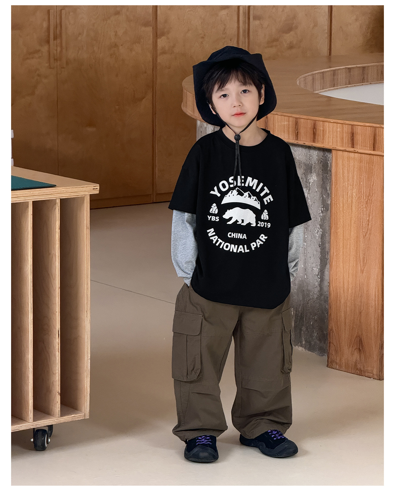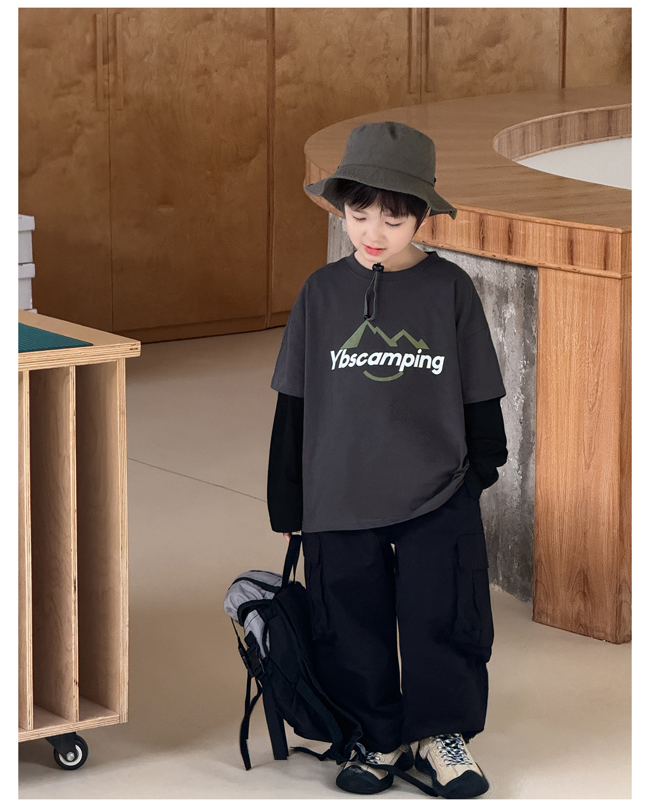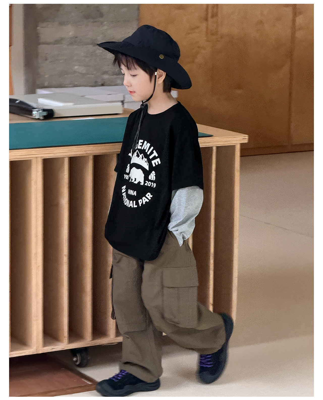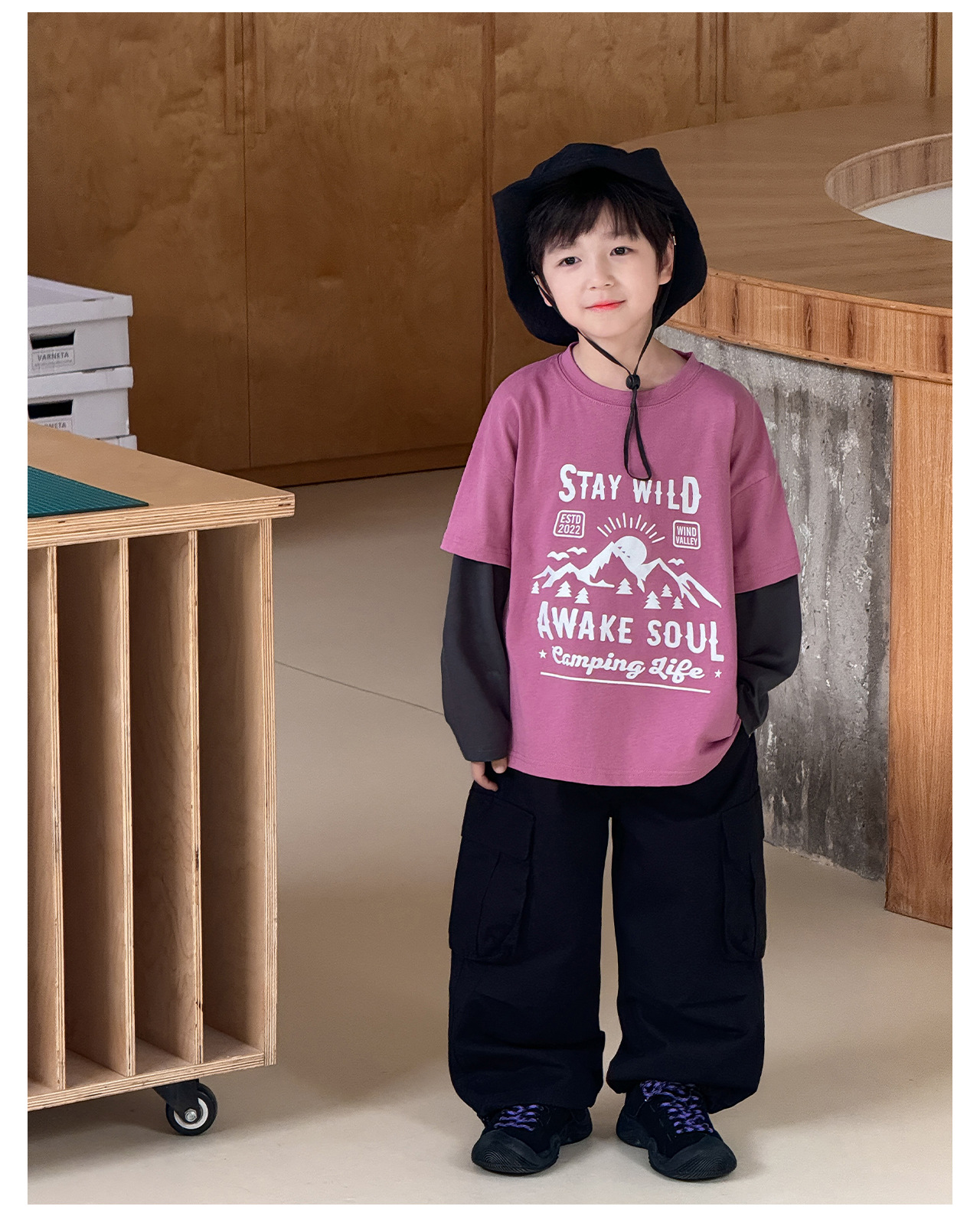 Tongku 2025 봄 신작 Huzhou Zhili 아동복 한국 스타일 소년 가짜 투피스 마운틴 스타일 프린트 아동 티셔츠 트렌드스토어 가기