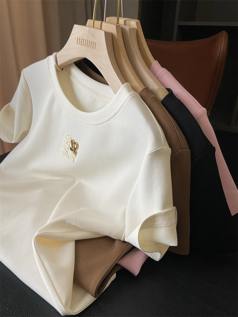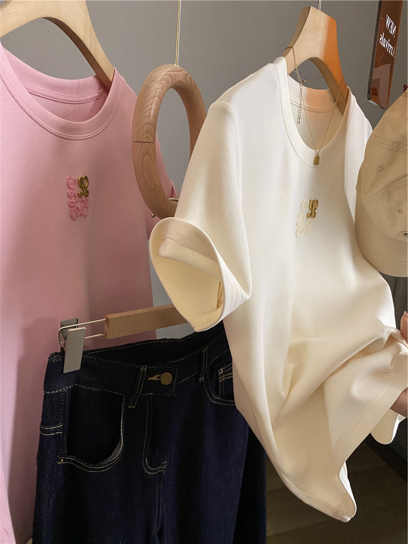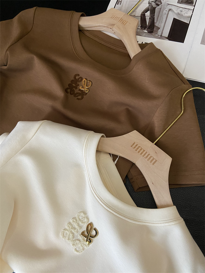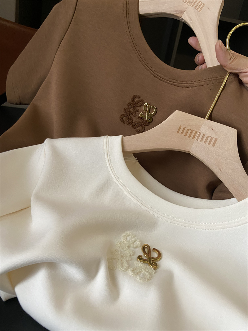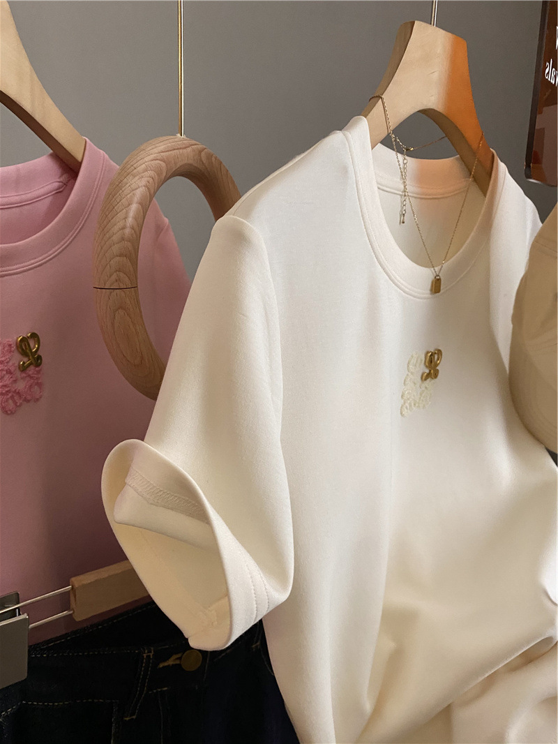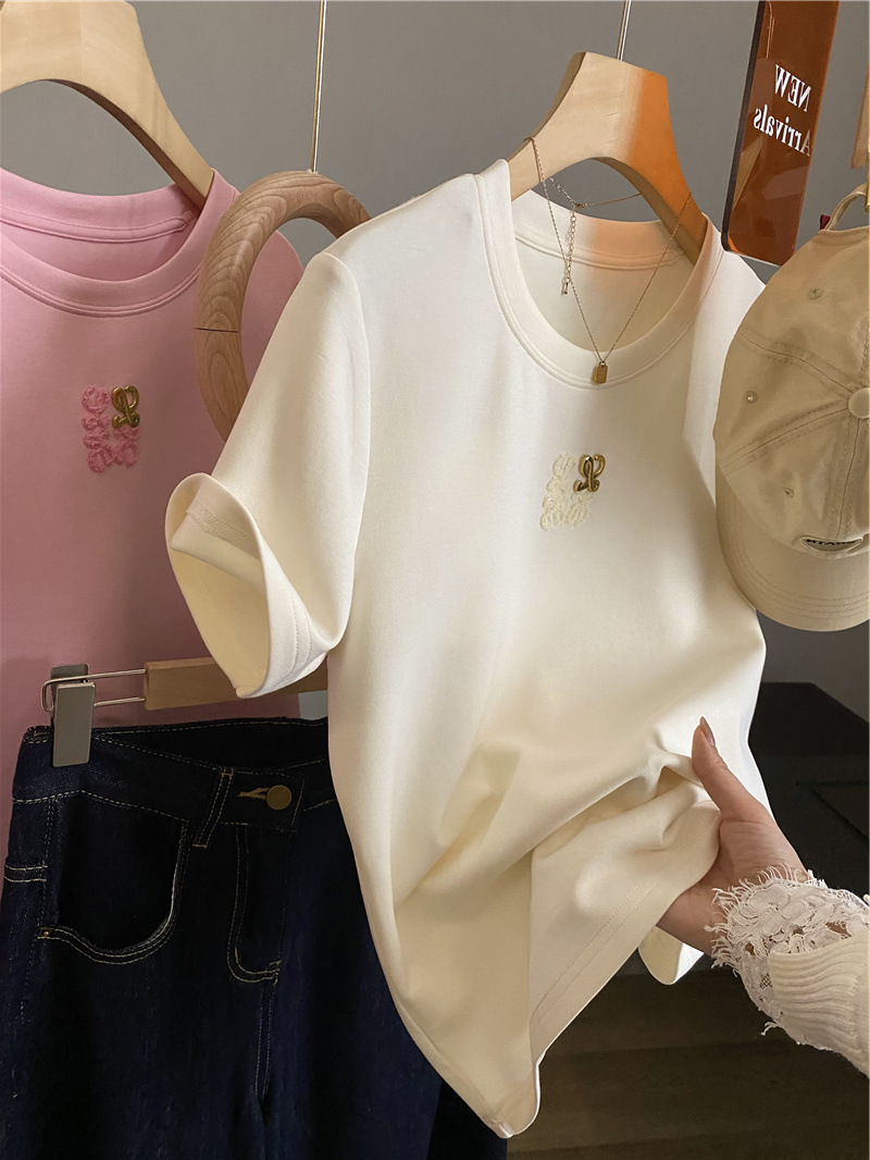 Moneka 중공업 타월 자수 캐주얼 크루 넥 반팔 티셔츠 여성의 2024 년 새 여름 느슨한 반소매 탑 Ins스토어 가기