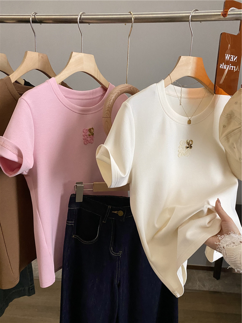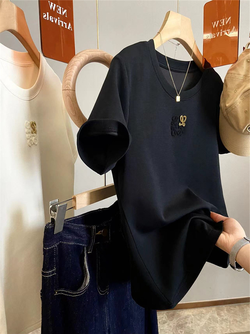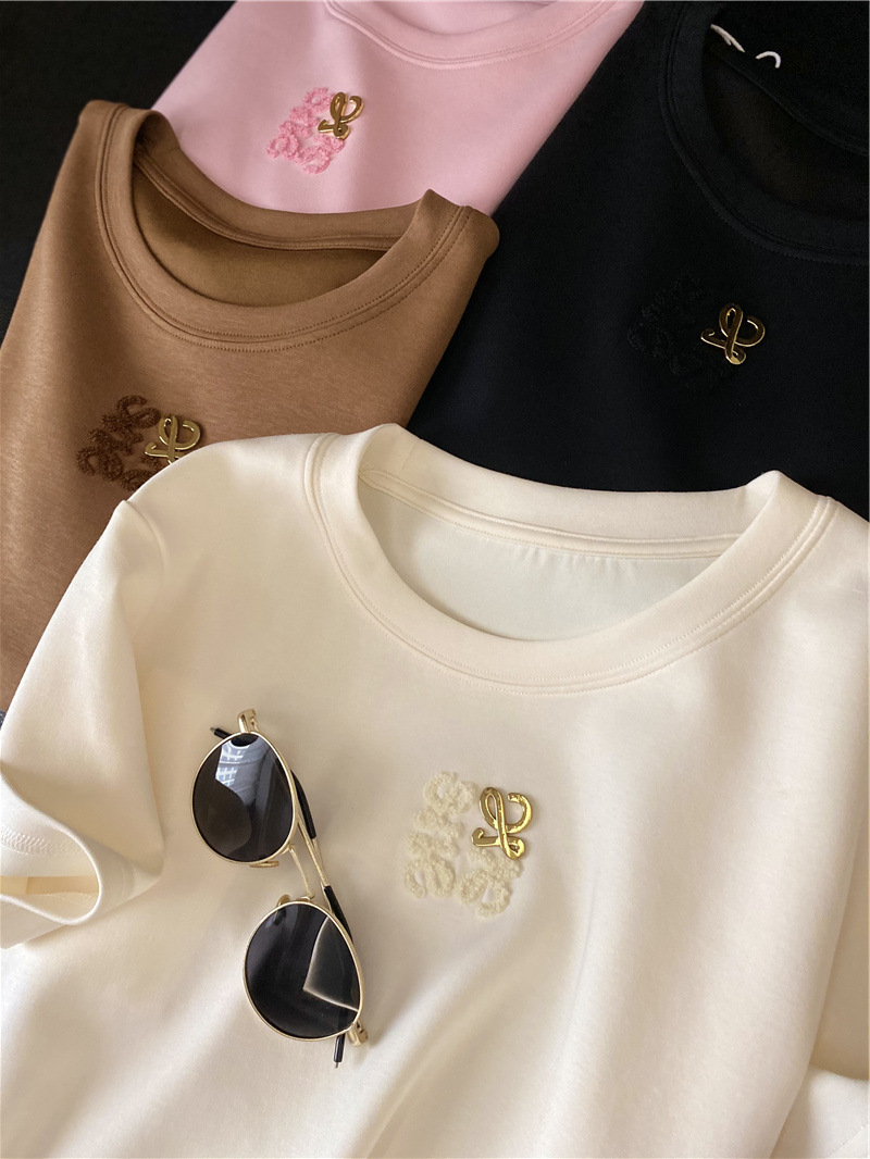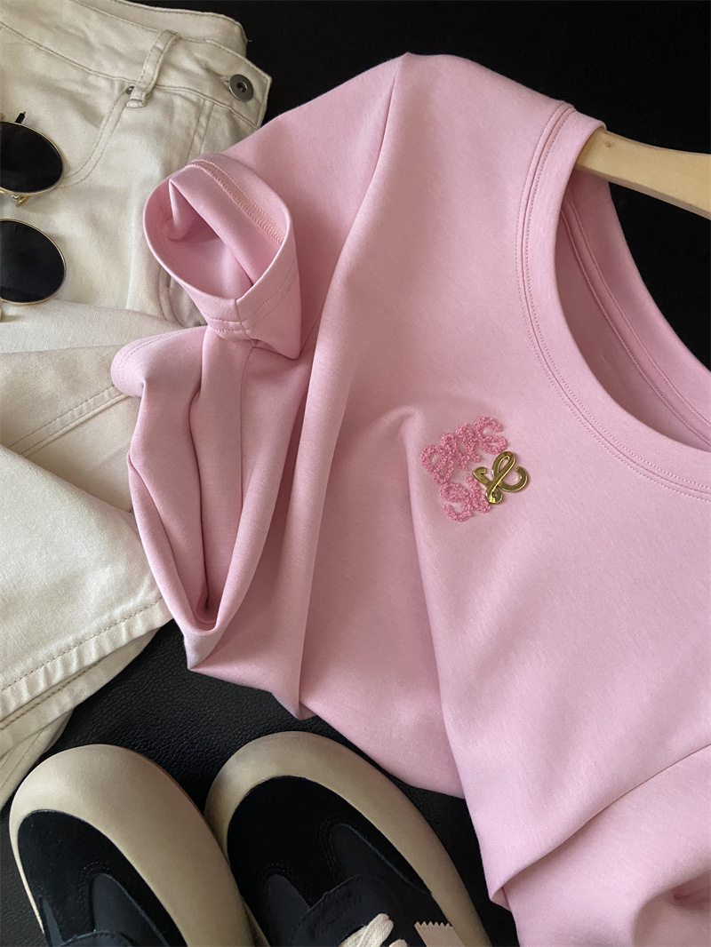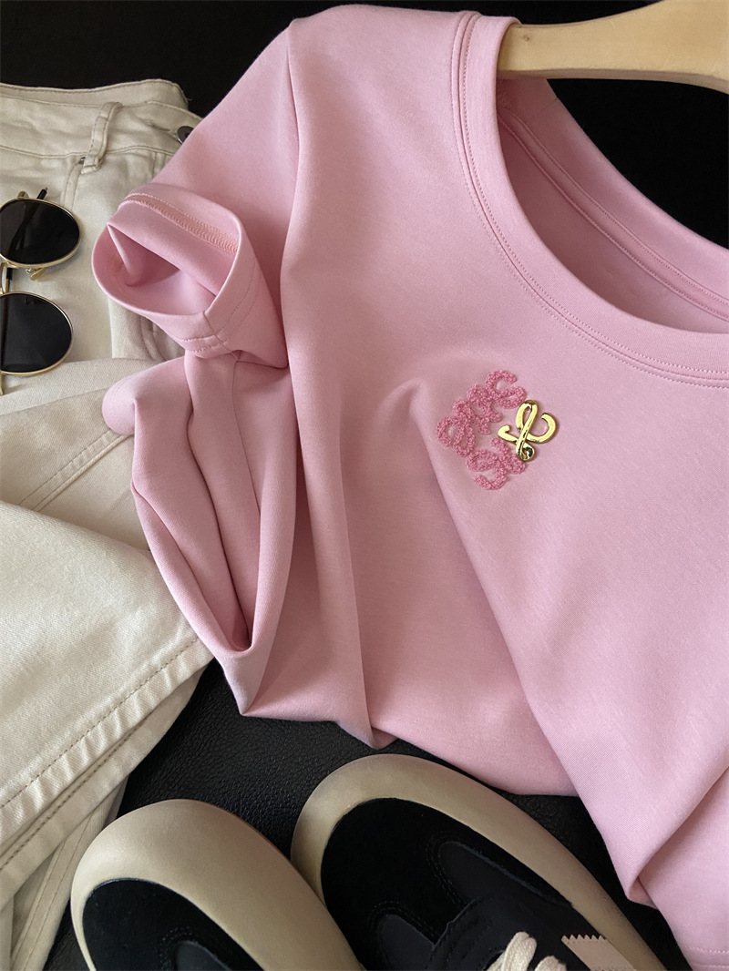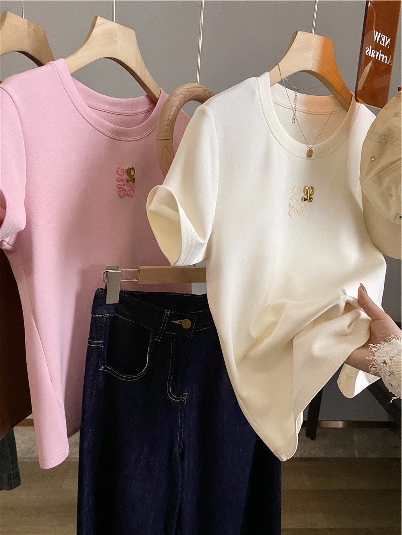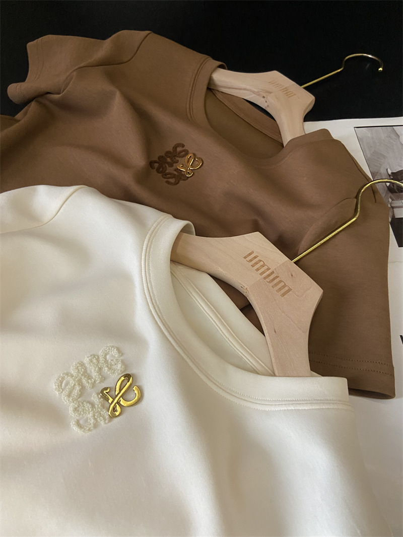 Moneka 중공업 타월 자수 캐주얼 크루 넥 반팔 티셔츠 여성의 2024 년 새 여름 느슨한 반소매 탑 Ins스토어 가기