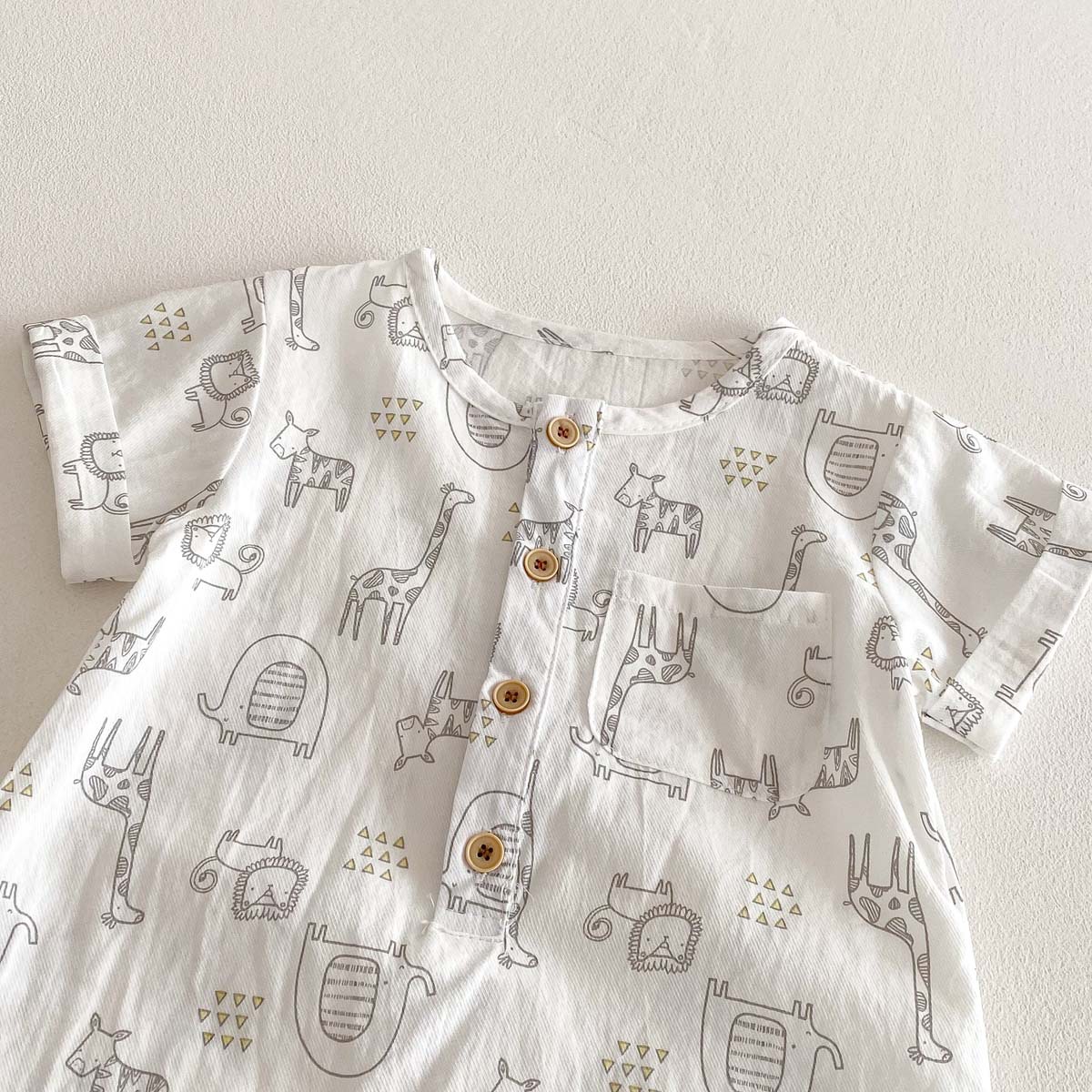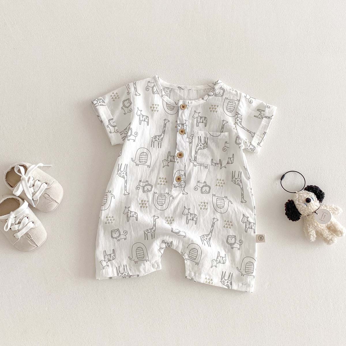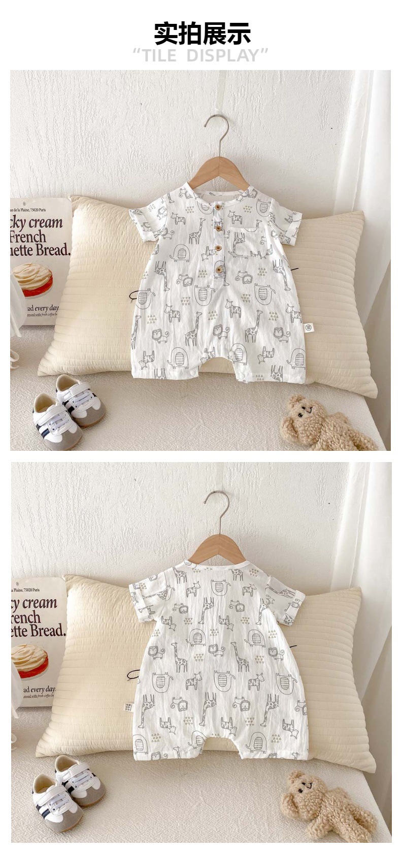 남자들의 여름 2025 새로운 도착 등반 세트 귀여운 만화 인쇄 반팔 면화 아기 옷 얇은