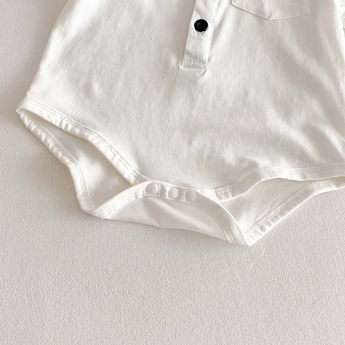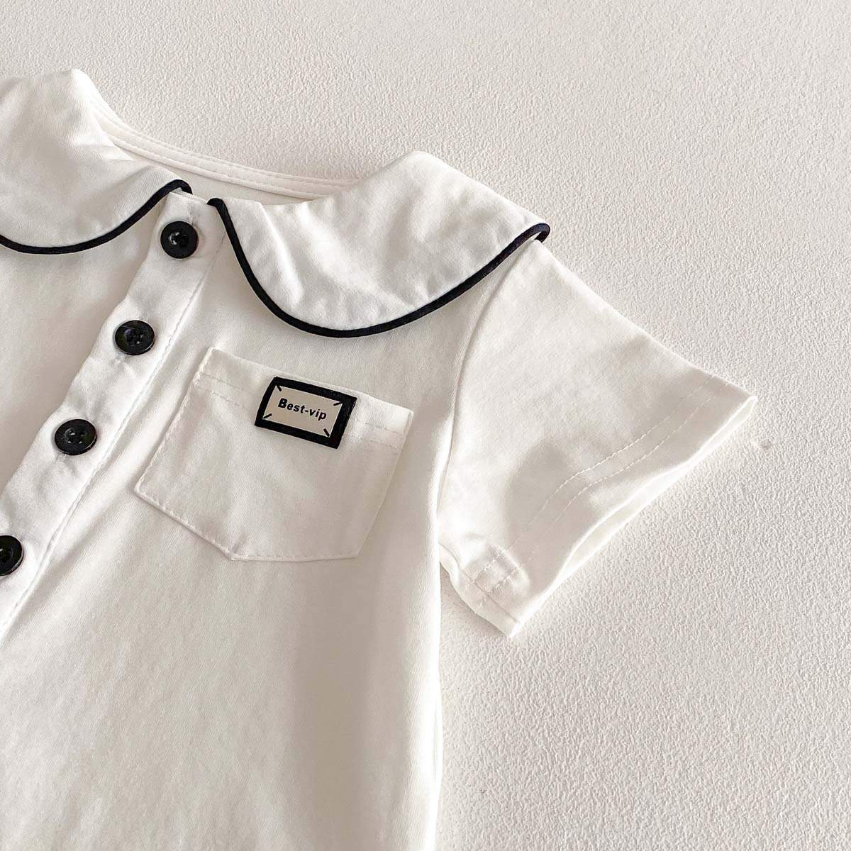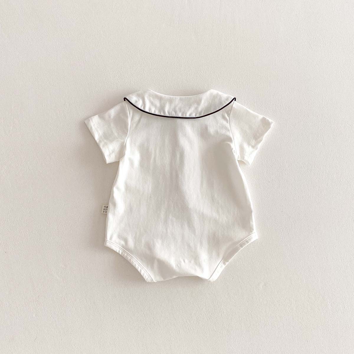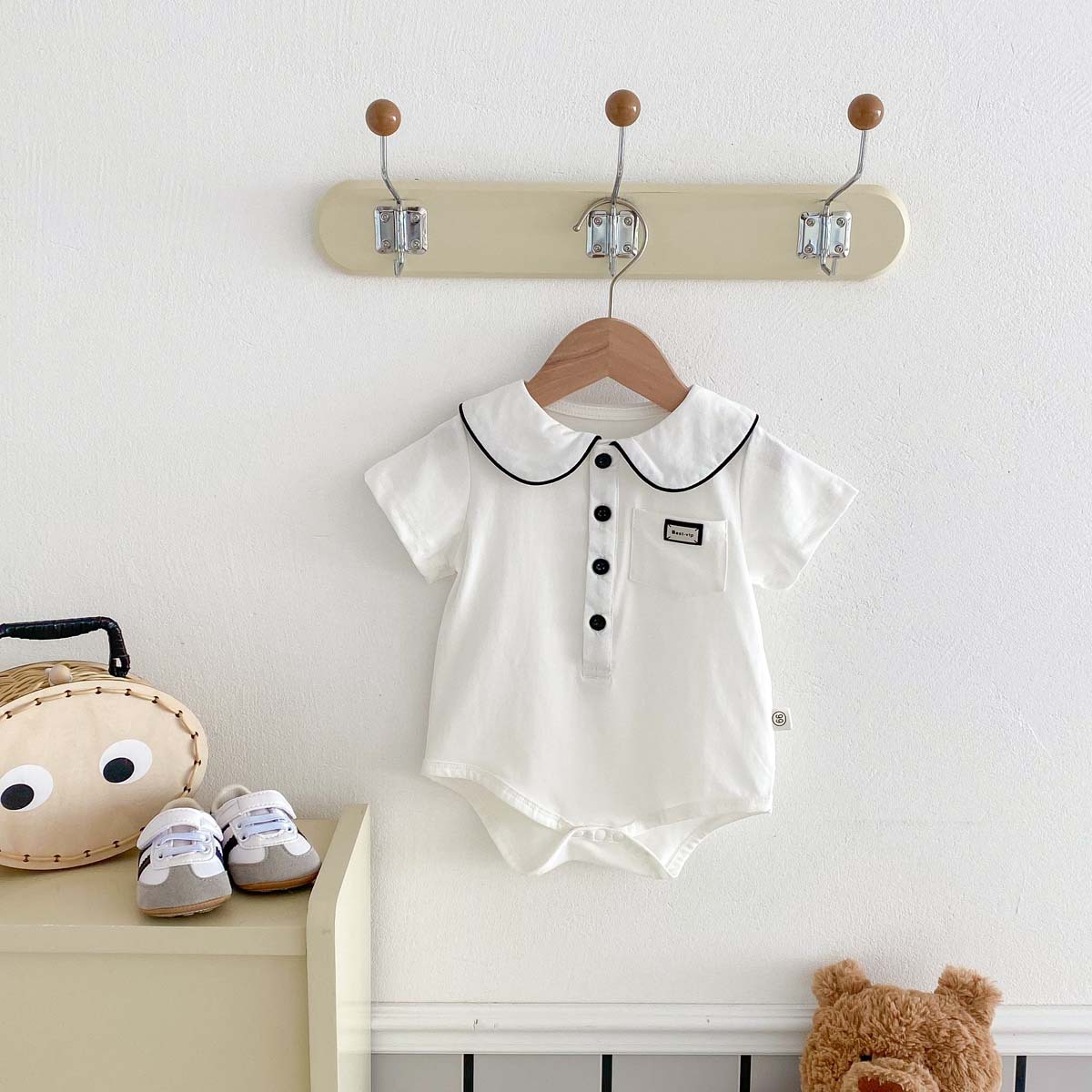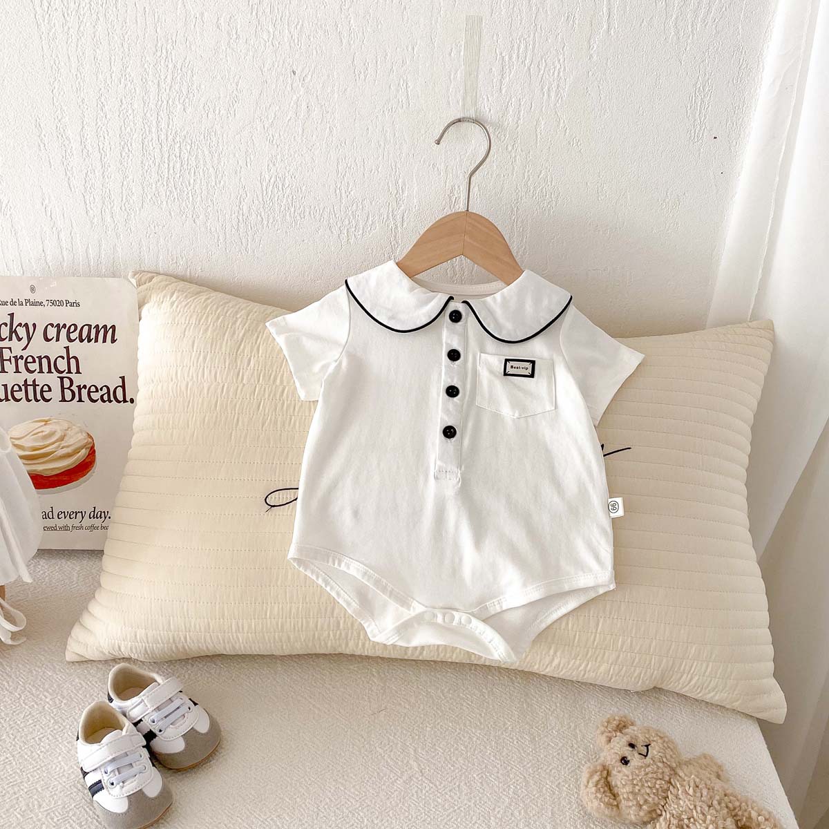 소년 소녀 아기를위한 여름 얇은 점프 수트 새로운 2025 아기 귀여운 인형 칼라 보름달 백일 짧은 소매 옷