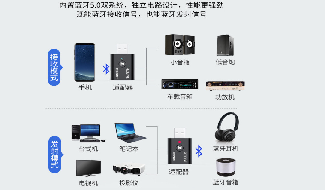 V5.0 블루투스 송신기 수신기 2-in -1 빌트인 마이크 수신 전화 핸즈프리 자동차 스피커 컴퓨터 범용스토어 가기