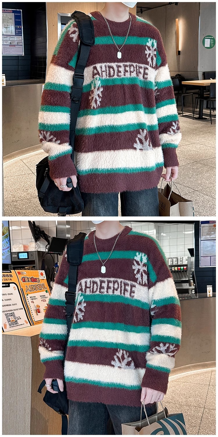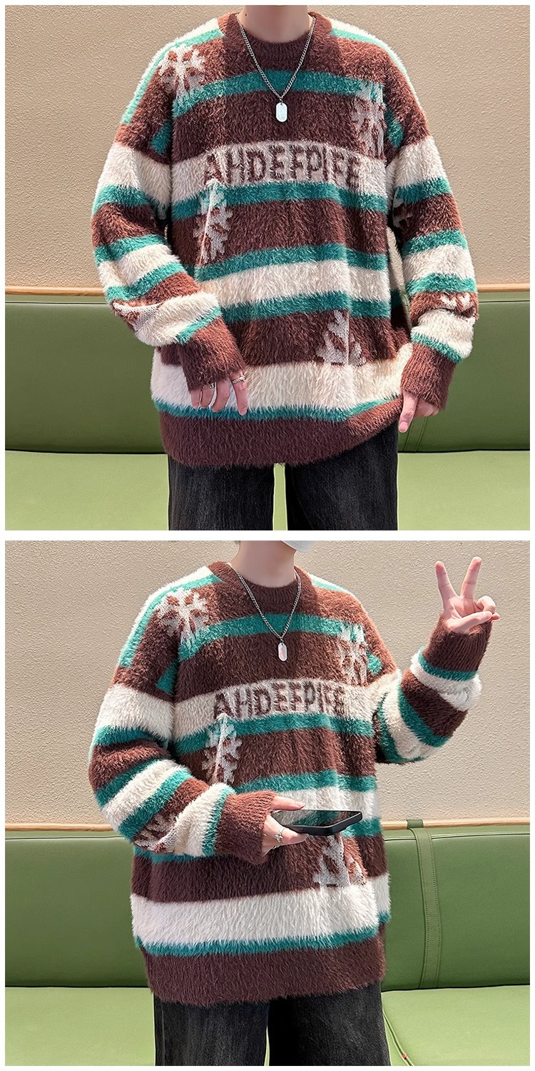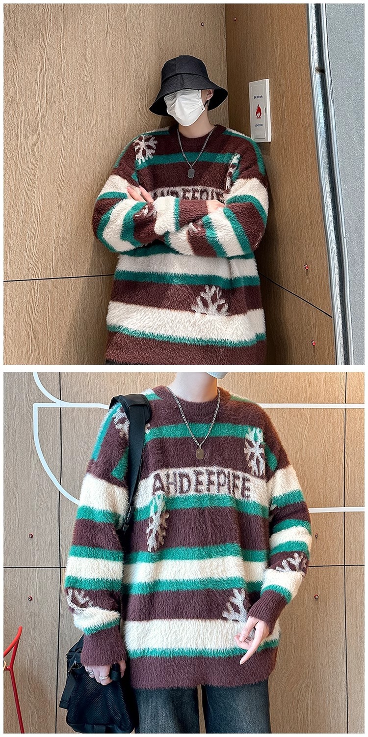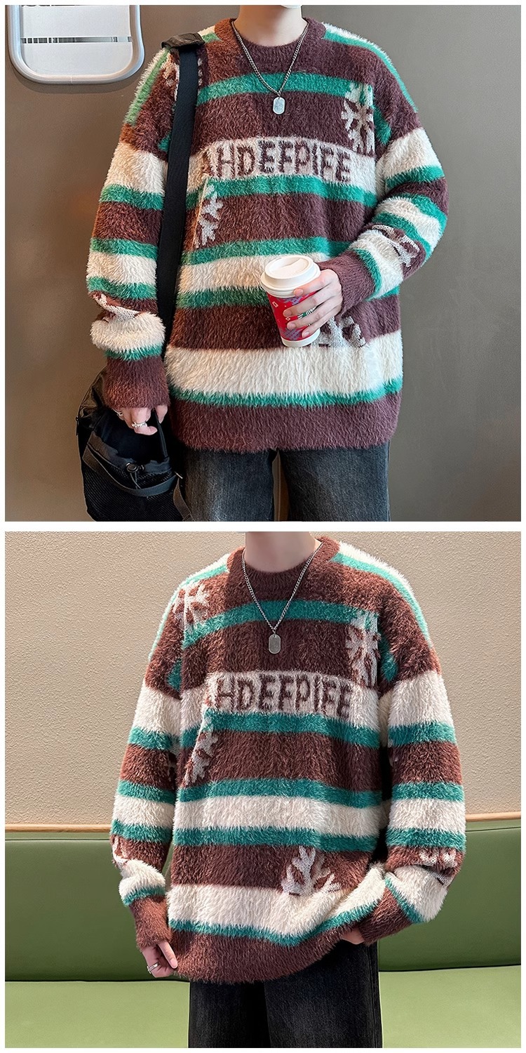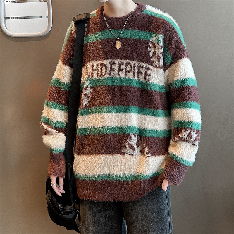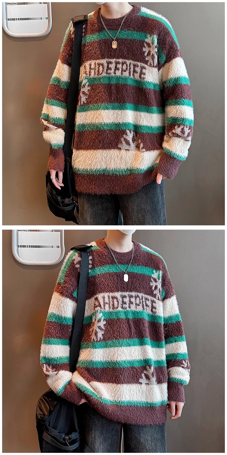 아메리칸 스타일 레트로 트렌디 한 브랜드 스트라이프 밍크 스웨터 남성의 2024 년 새로운 가을과 겨울 게으른 탑 커플 국경 공급스토어 가기