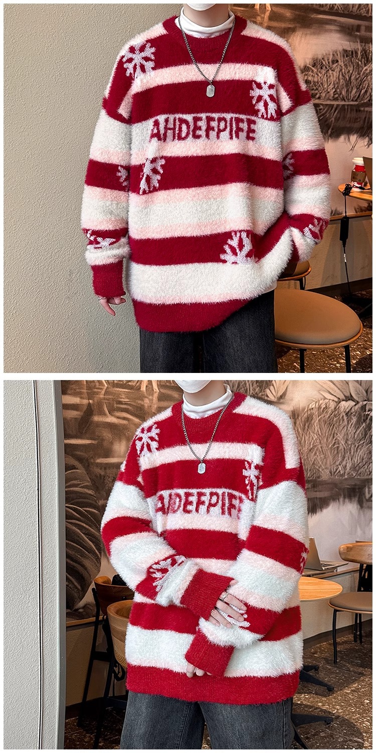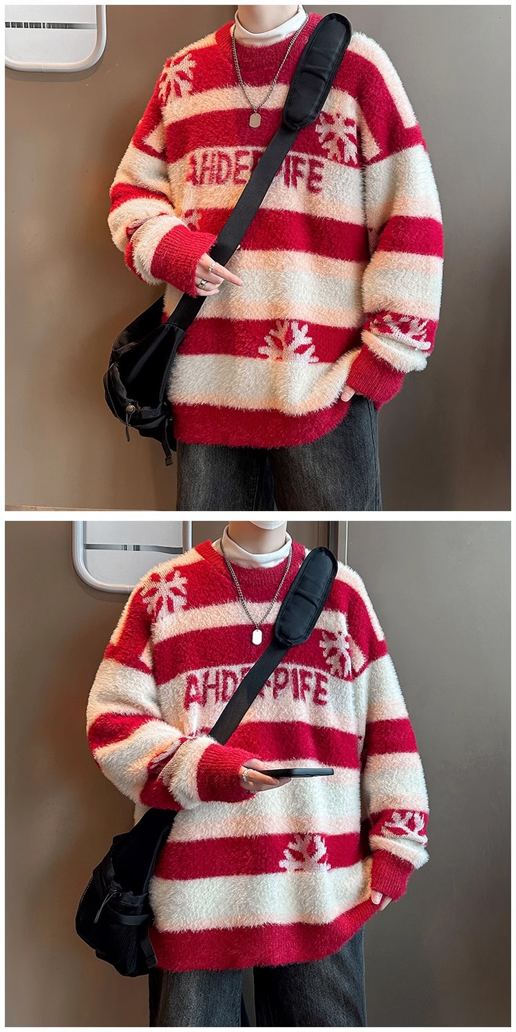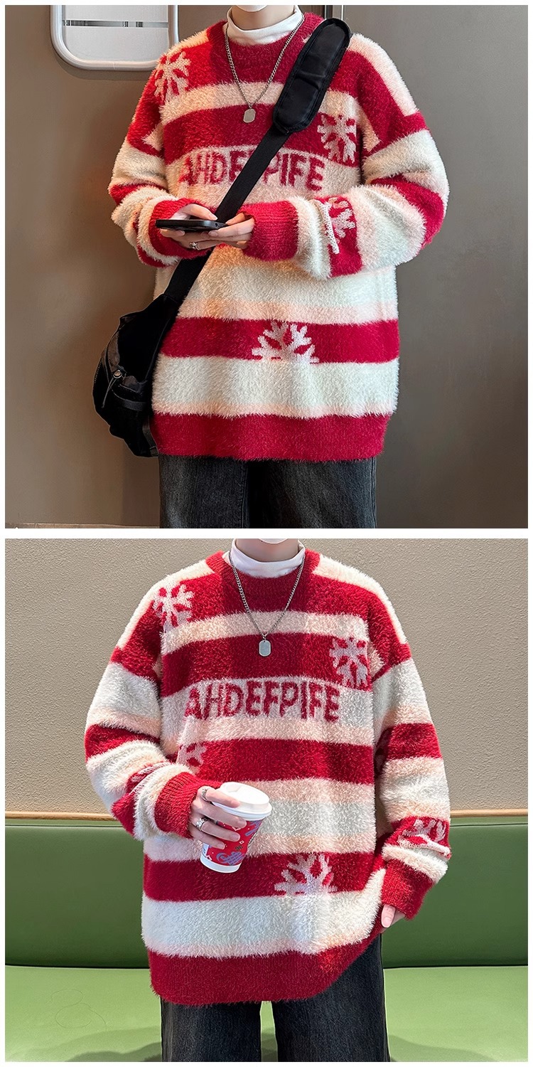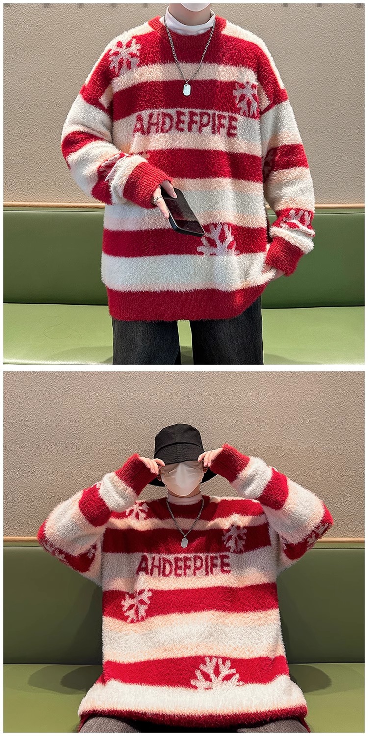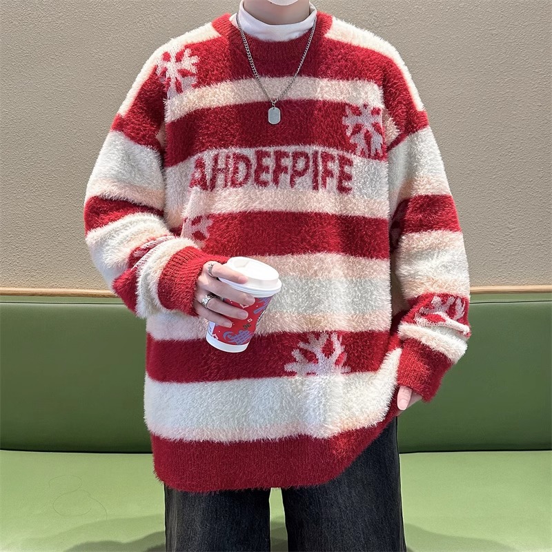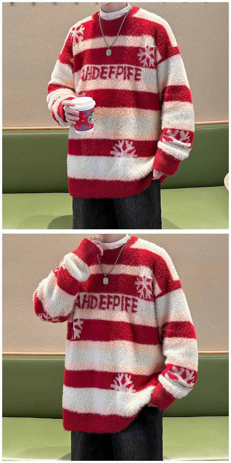 아메리칸 스타일 레트로 트렌디 한 브랜드 스트라이프 밍크 스웨터 남성의 2024 년 새로운 가을과 겨울 게으른 탑 커플 국경 공급스토어 가기