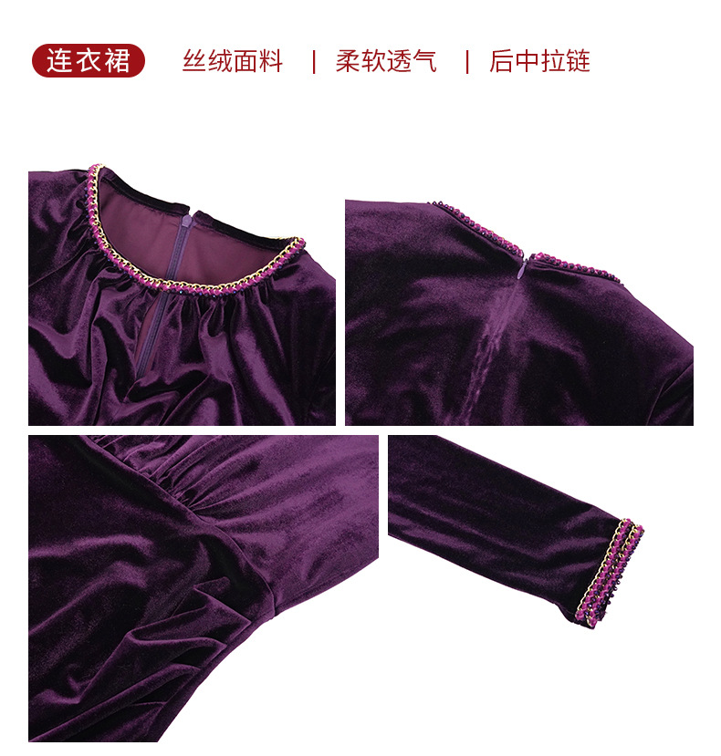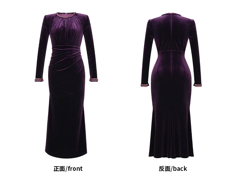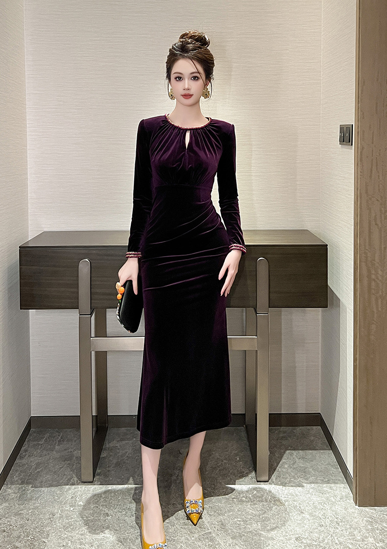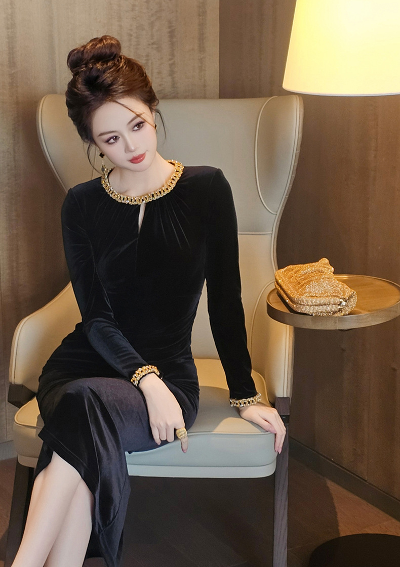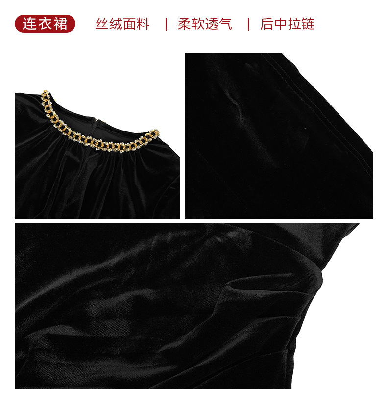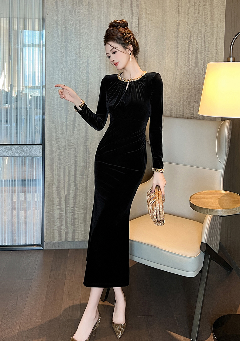 2025 가을 신상 여성복 프렌치 스타일 고급스러운 라운드넥 다이아몬드 장식 슬림핏 벨벳 힙라인 원피스 21579
