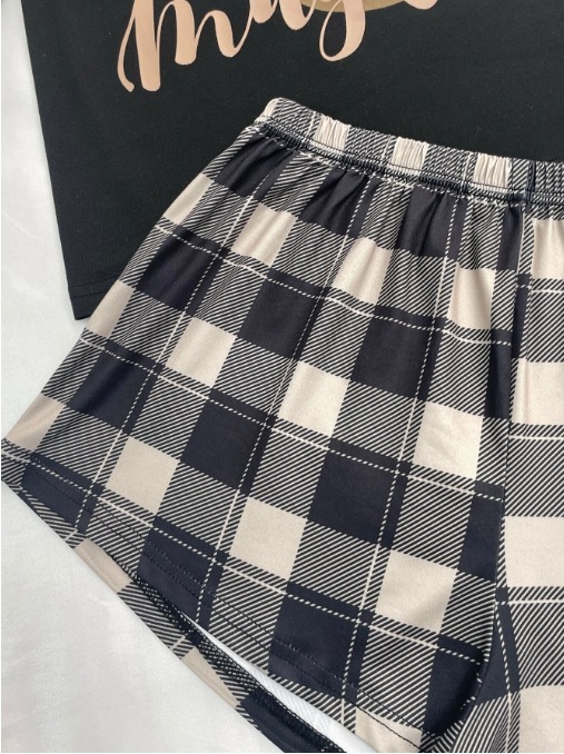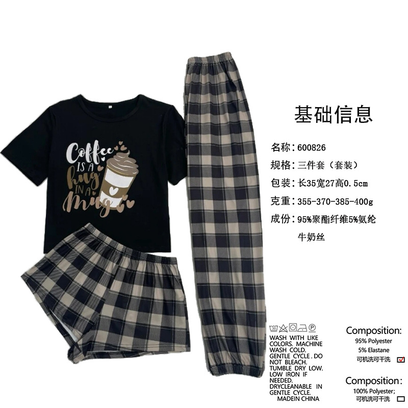 유럽과 미국 스타일의 여성용 3피스 잠옷 세트, 만화 캐릭터 체크무늬 반바지와 긴바지, 밀크 실크 홈웨어, 얇은 소재의 해외 무역 상품