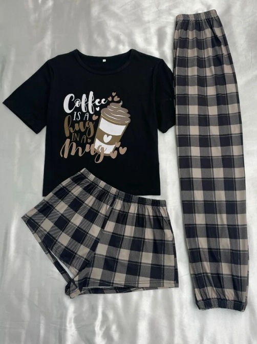 유럽과 미국 스타일의 여성용 3피스 잠옷 세트, 만화 캐릭터 체크무늬 반바지와 긴바지, 밀크 실크 홈웨어, 얇은 소재의 해외 무역 상품스토어 가기