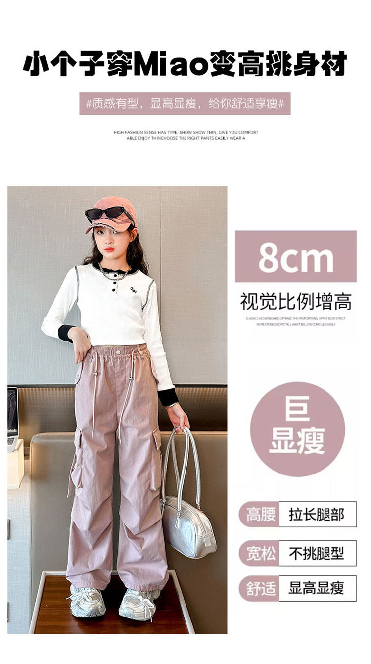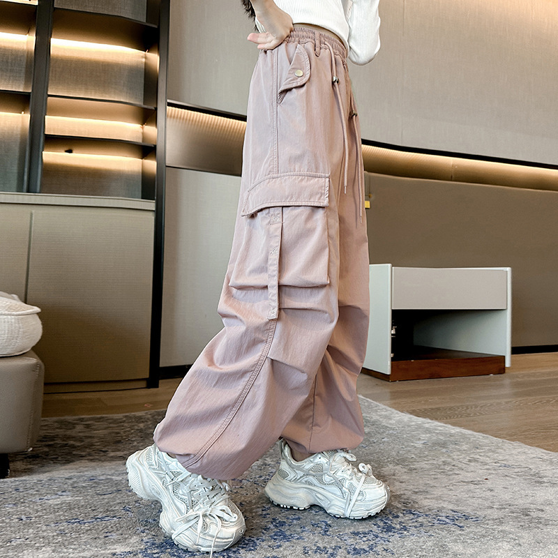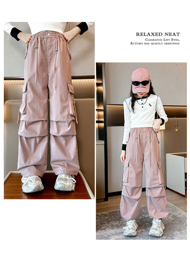 2025 새로운 어린이 봄 10-12 세 소녀 뜨거운 소녀 느슨한 바지 디자인 감각 사이드 가방 바지 봄 옷