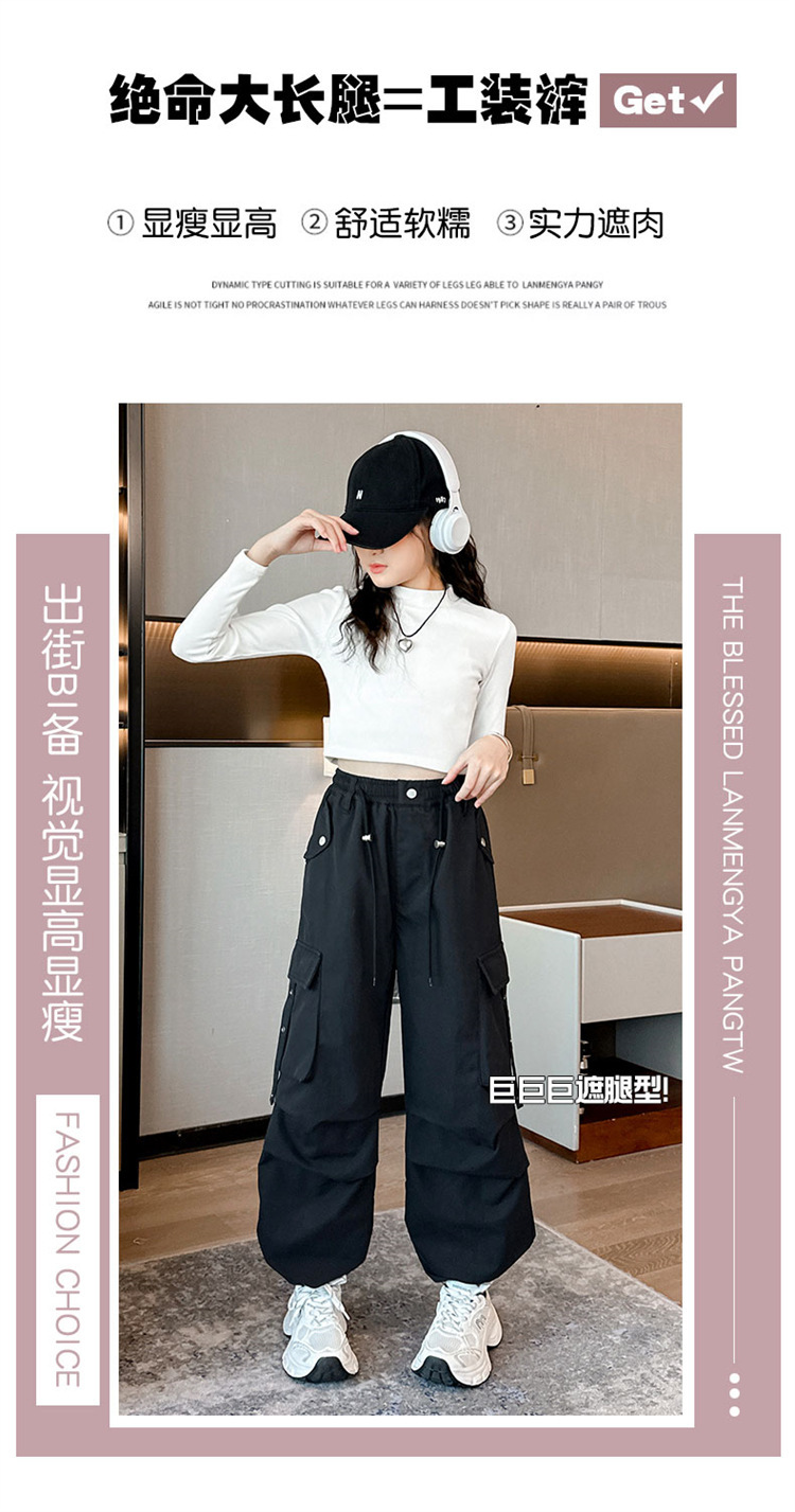 2025 새로운 어린이 봄 10-12 세 소녀 뜨거운 소녀 느슨한 바지 디자인 감각 사이드 가방 바지 봄 옷스토어 가기