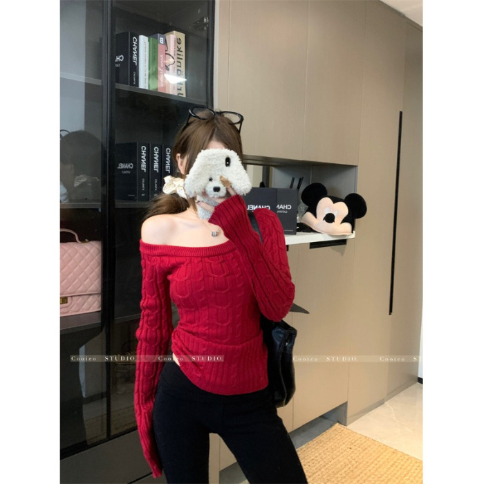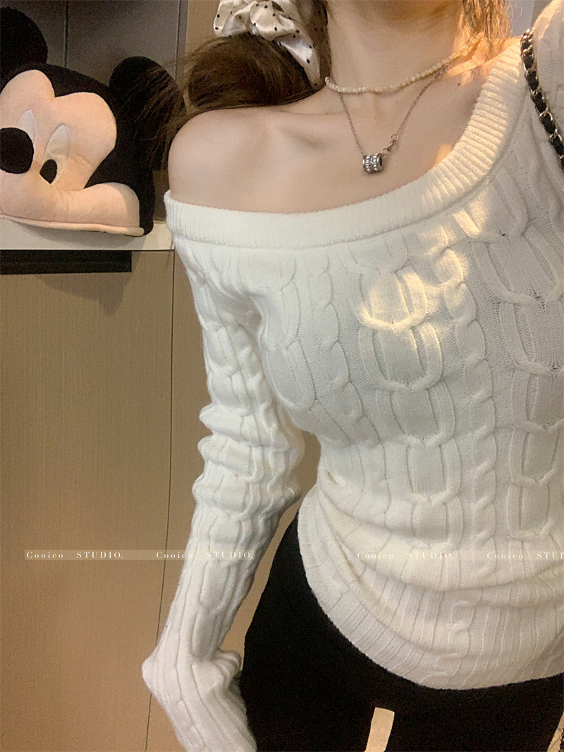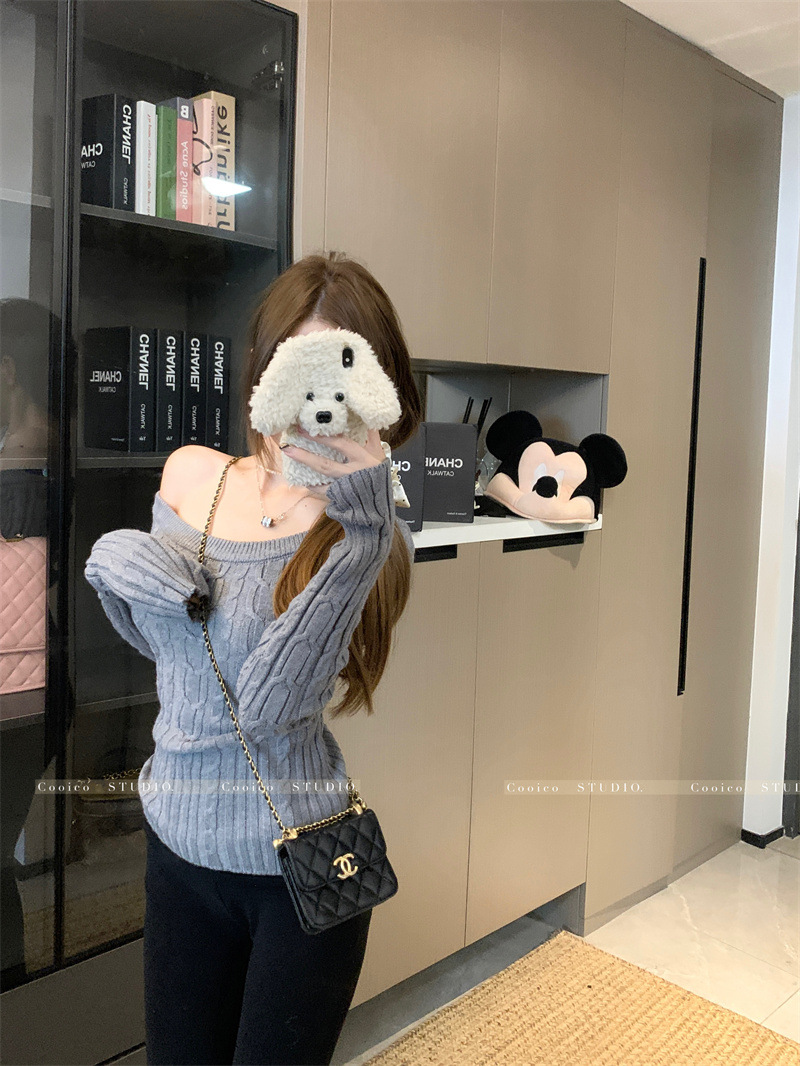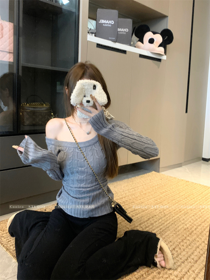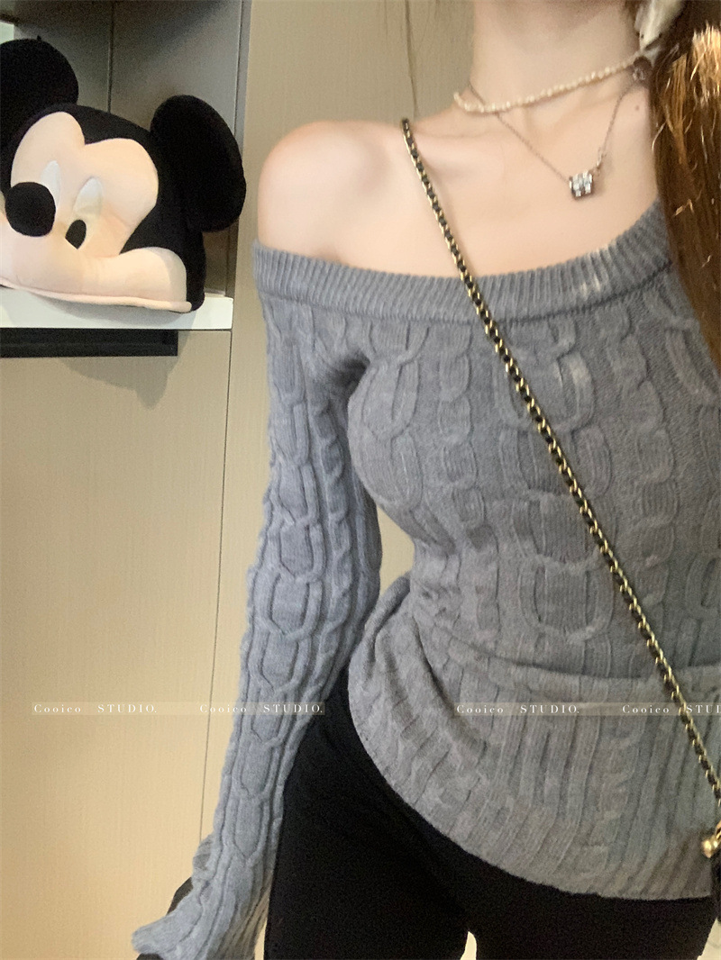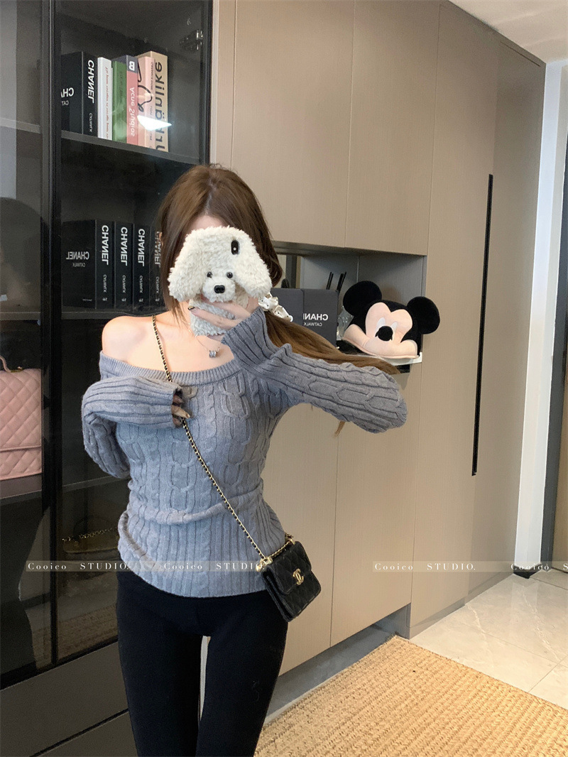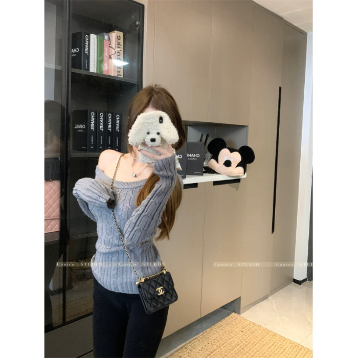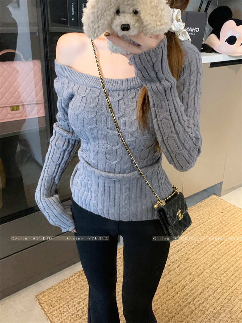 스파이스 걸스 그레이 슬란 트 숄더 스웨터 여성용 겨울 틈새 빈티지 트위스트 스웨터 슬림 핏 숄더베이스 탑 트렌디스토어 가기
