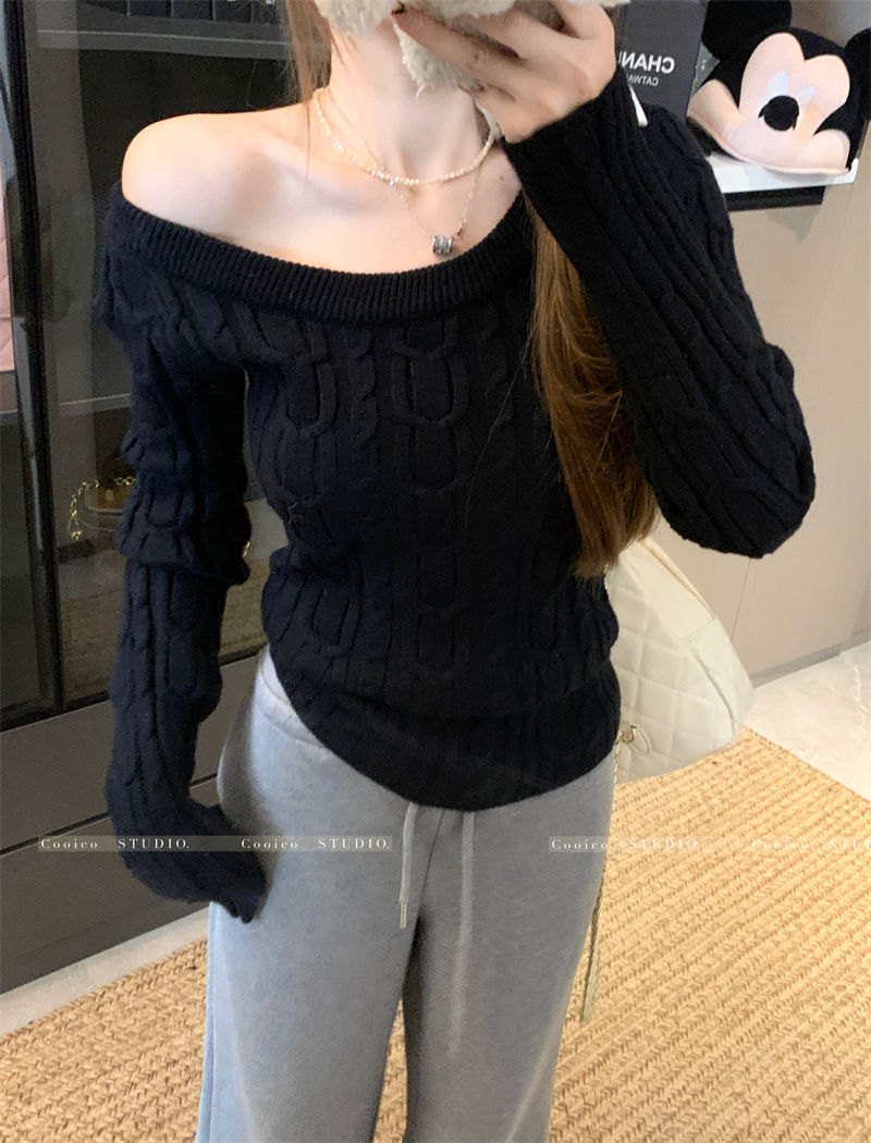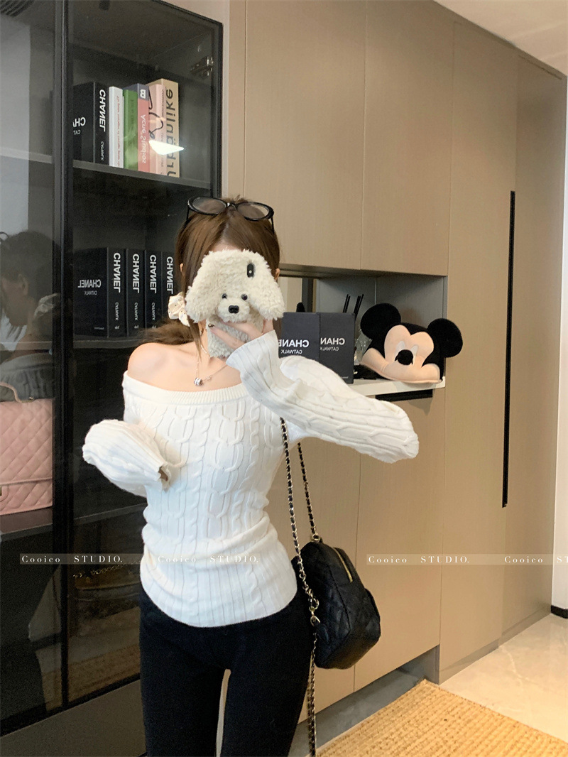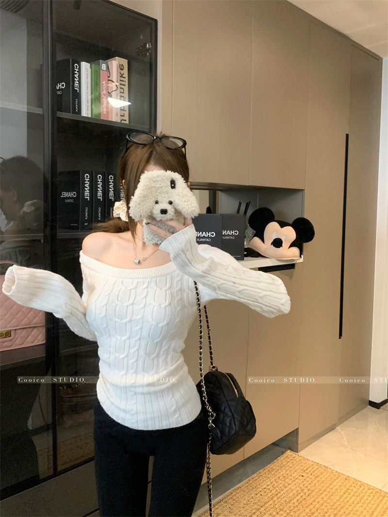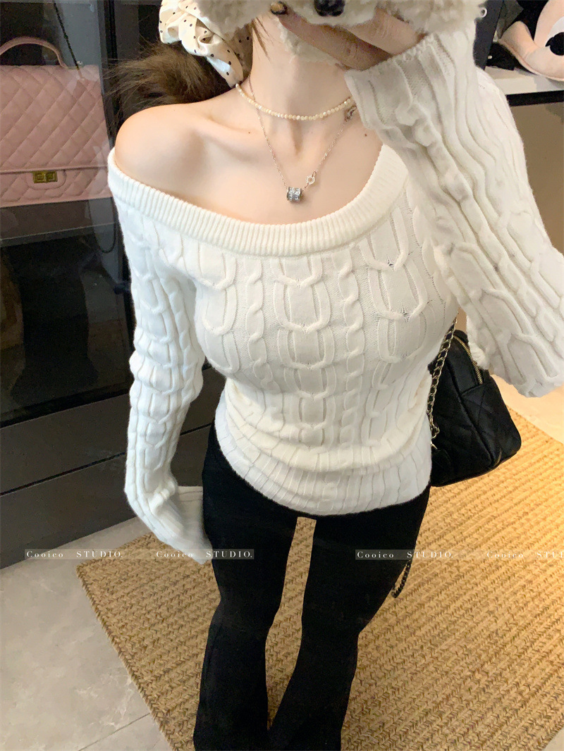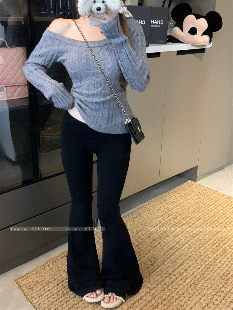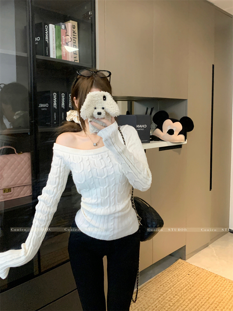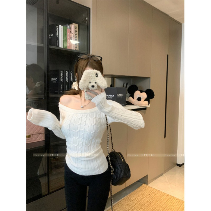 스파이스 걸스 그레이 슬란 트 숄더 스웨터 여성용 겨울 틈새 빈티지 트위스트 스웨터 슬림 핏 숄더베이스 탑 트렌디스토어 가기