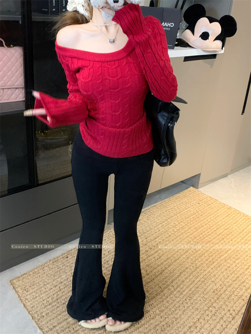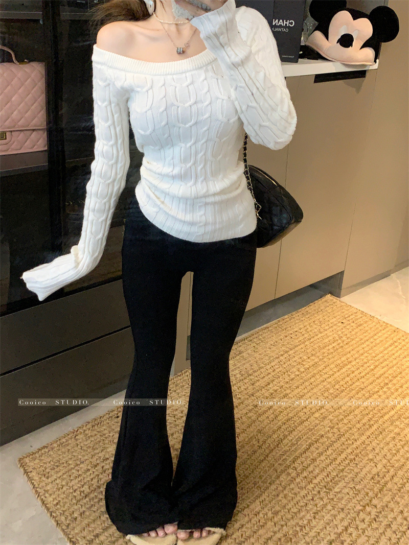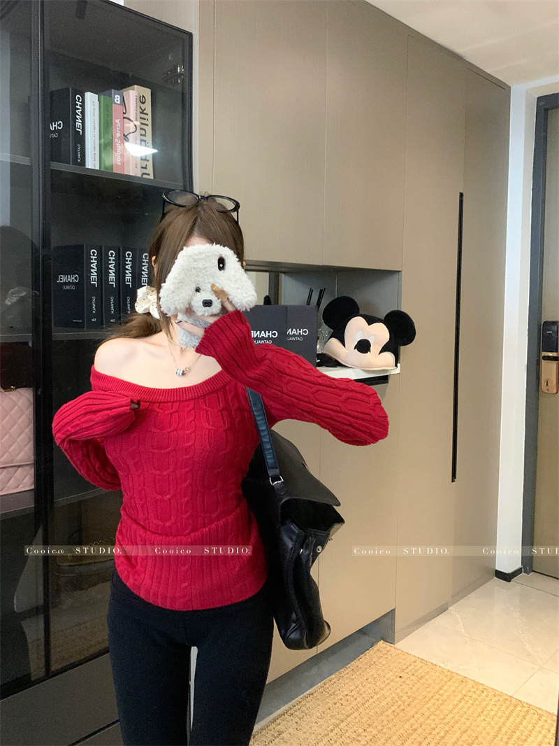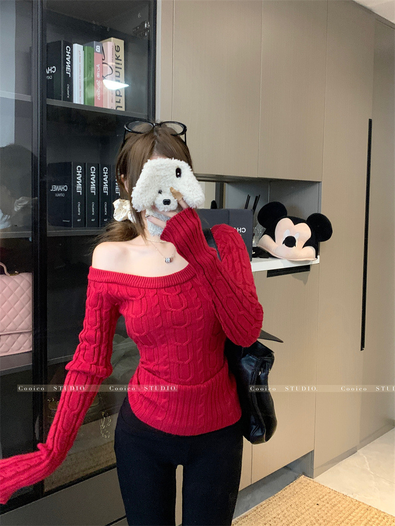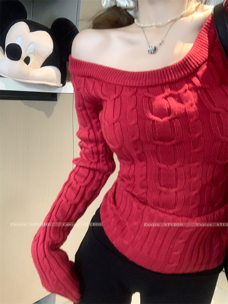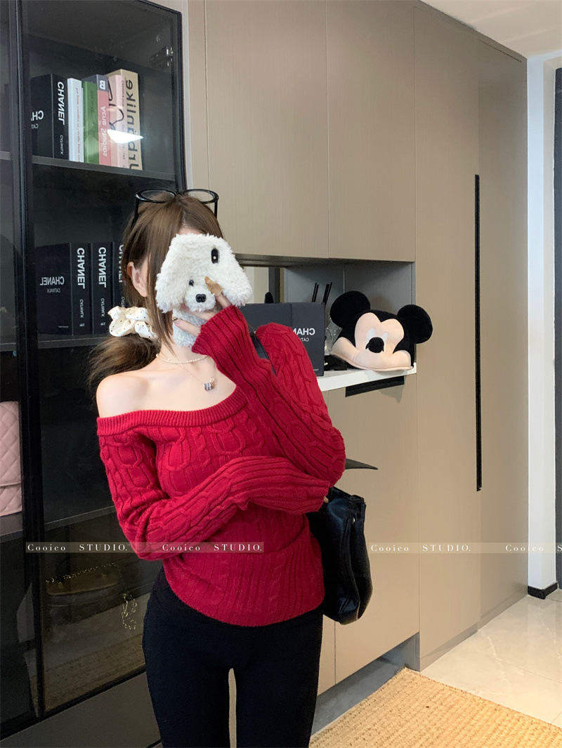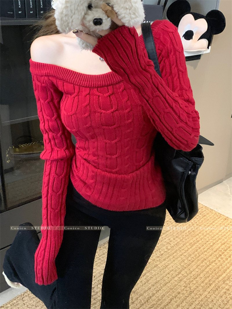 스파이스 걸스 그레이 슬란 트 숄더 스웨터 여성용 겨울 틈새 빈티지 트위스트 스웨터 슬림 핏 숄더베이스 탑 트렌디스토어 가기