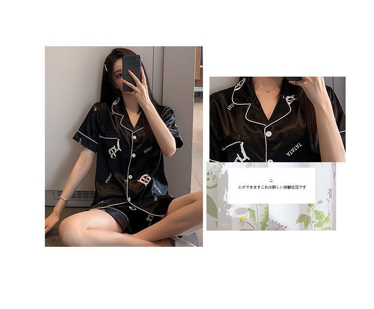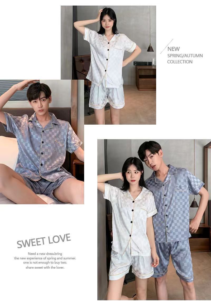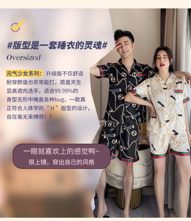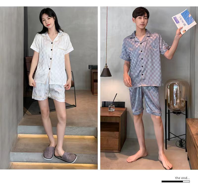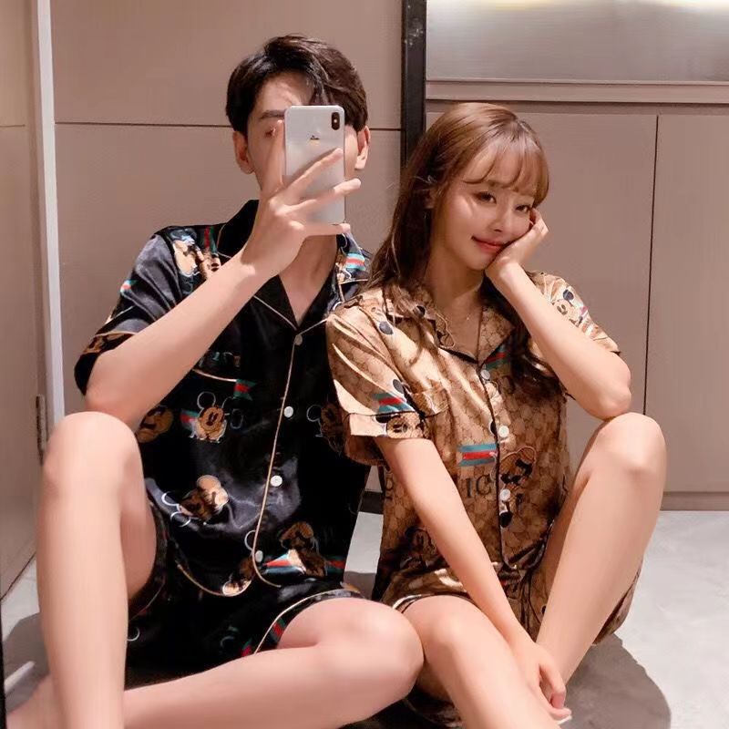 국경 간 여름 커플 여성 아이스 실크 파자마 남자 반팔 카디건 얇은 모조 실크 홈 의류 만화 세트