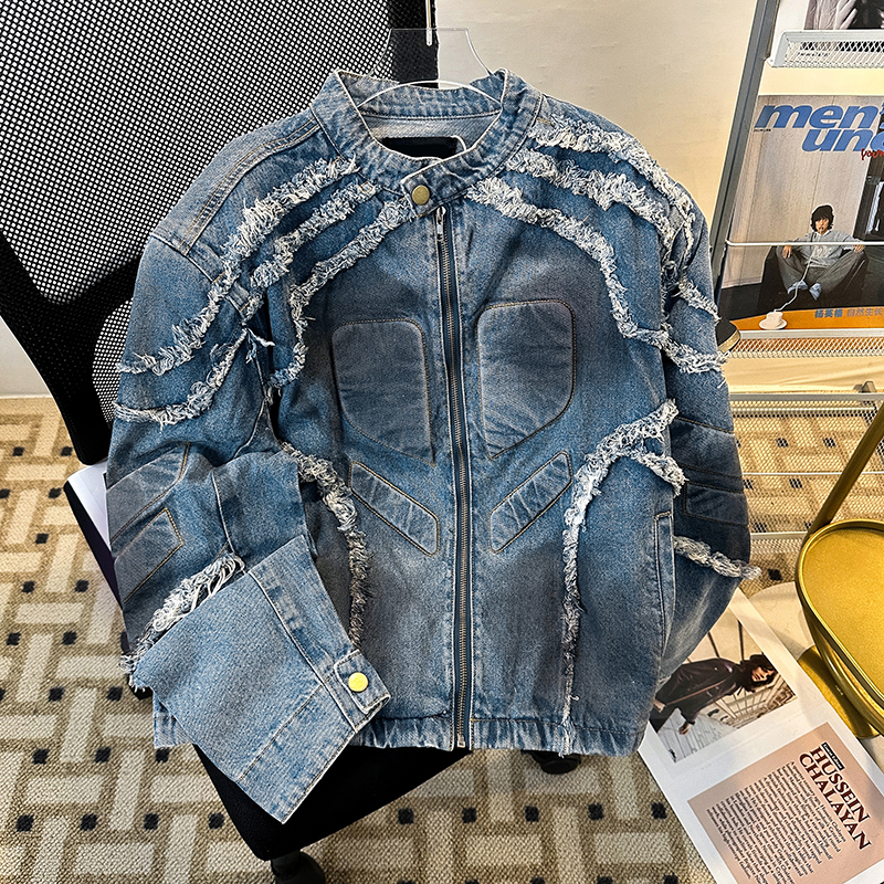 양각 된 거친 가장자리 어깨 패드 데님 코트 남성 가을과 겨울 복고풍 미국 스타일 ruffian 잘 생긴 스탠드 칼라 오토바이 디자인 하이 스트리트 재킷스토어 가기