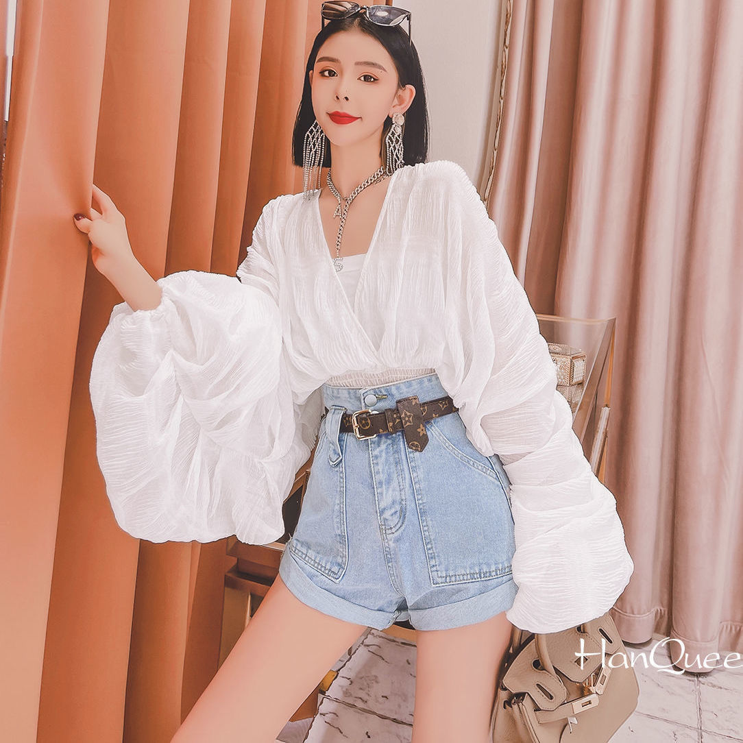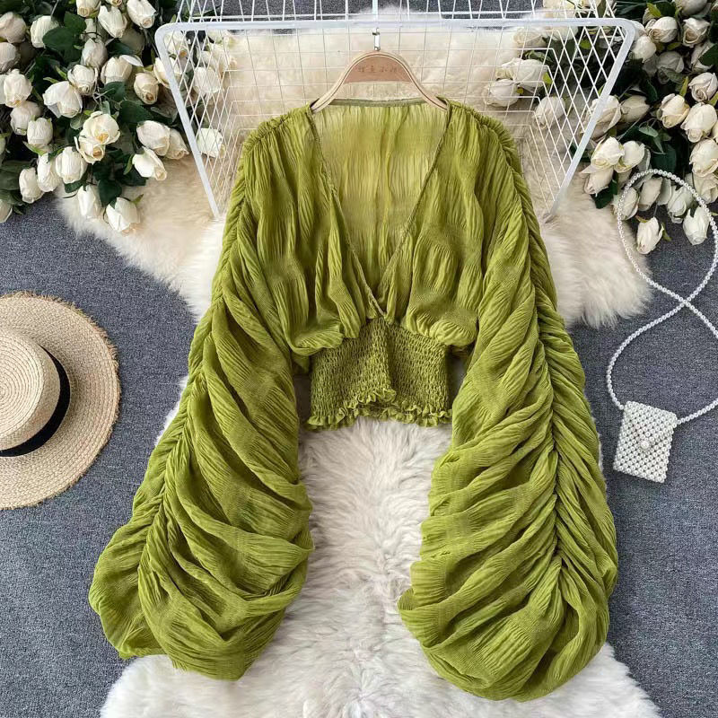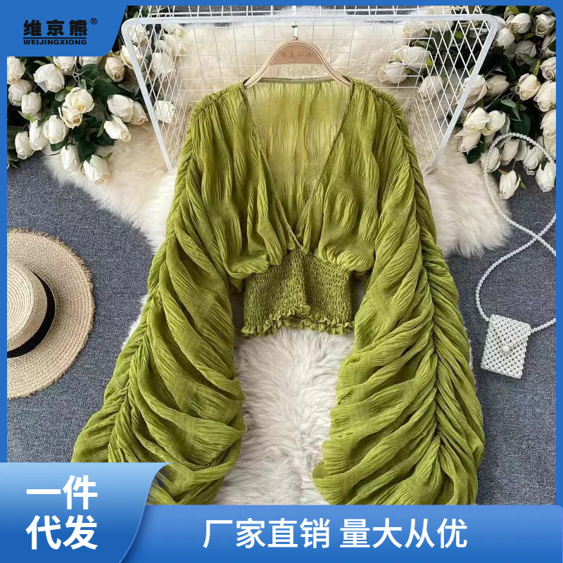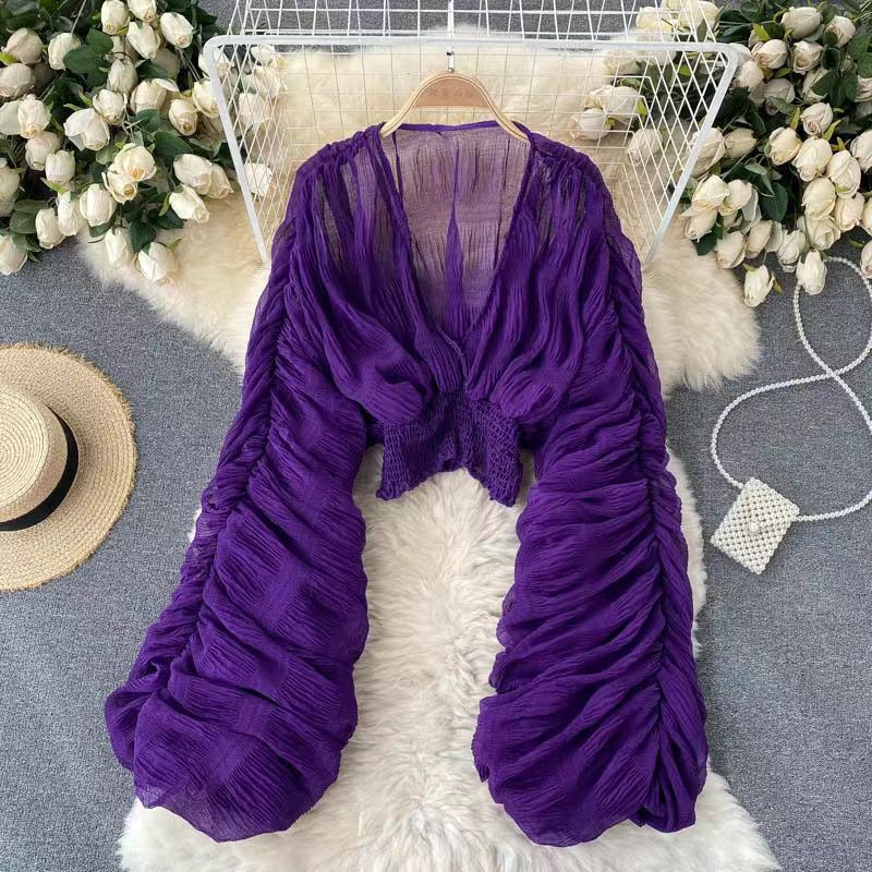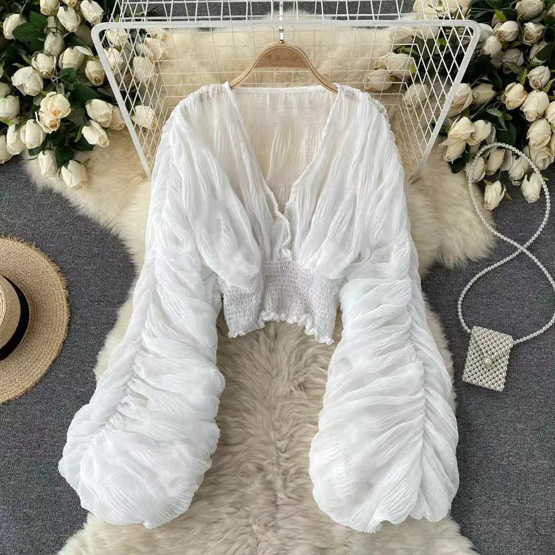 Ying 2022 새로운 한국 스타일 주름 짧은 퍼프 소매 쉬폰 셔츠 가을 올 매치 아우터웨어 V 넥 우아한 짧은 잉큐