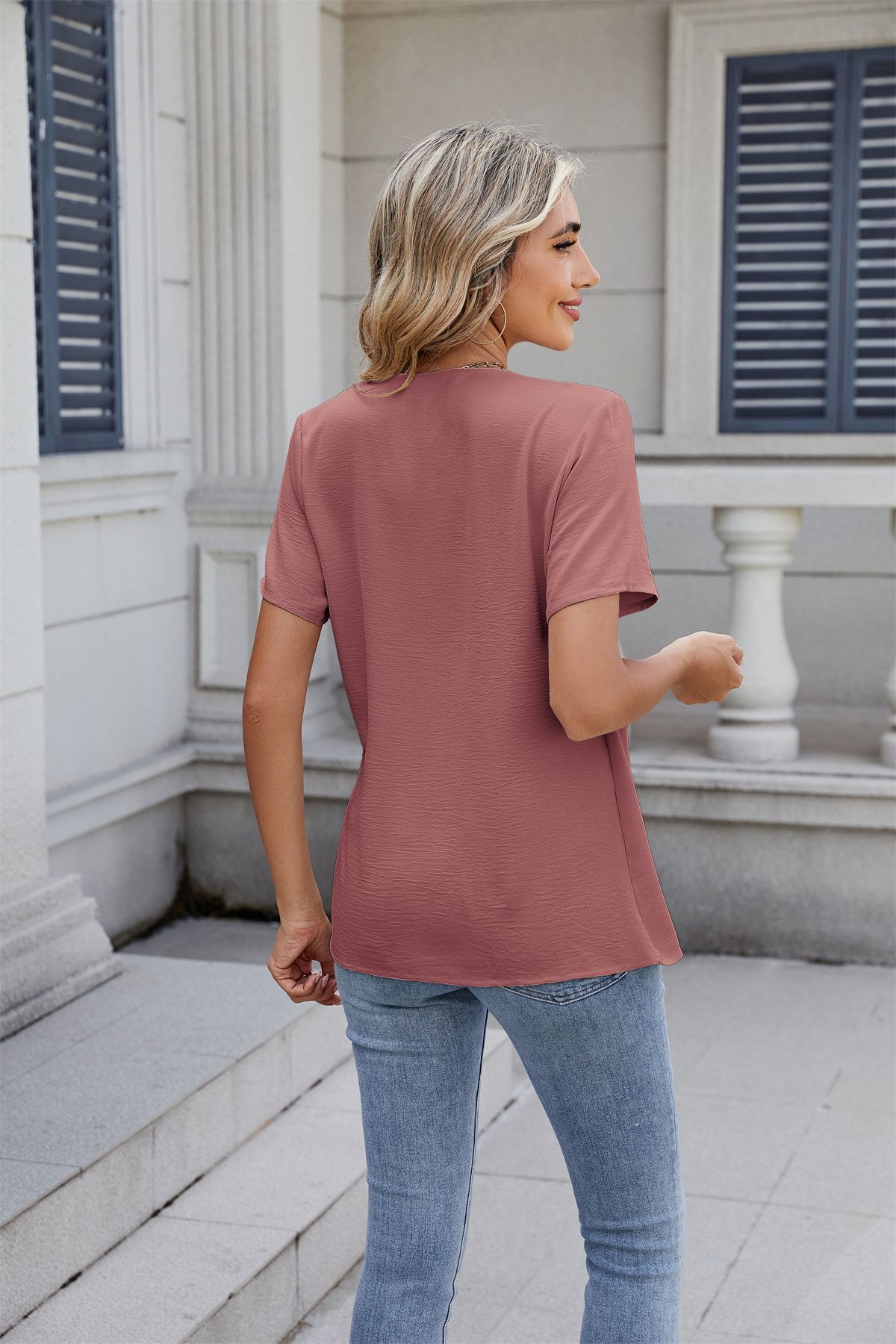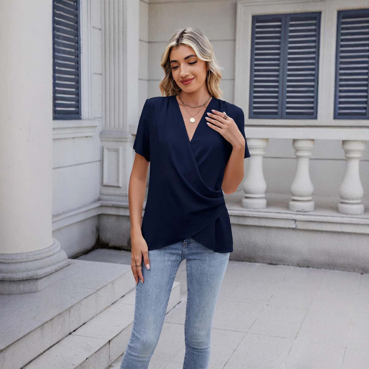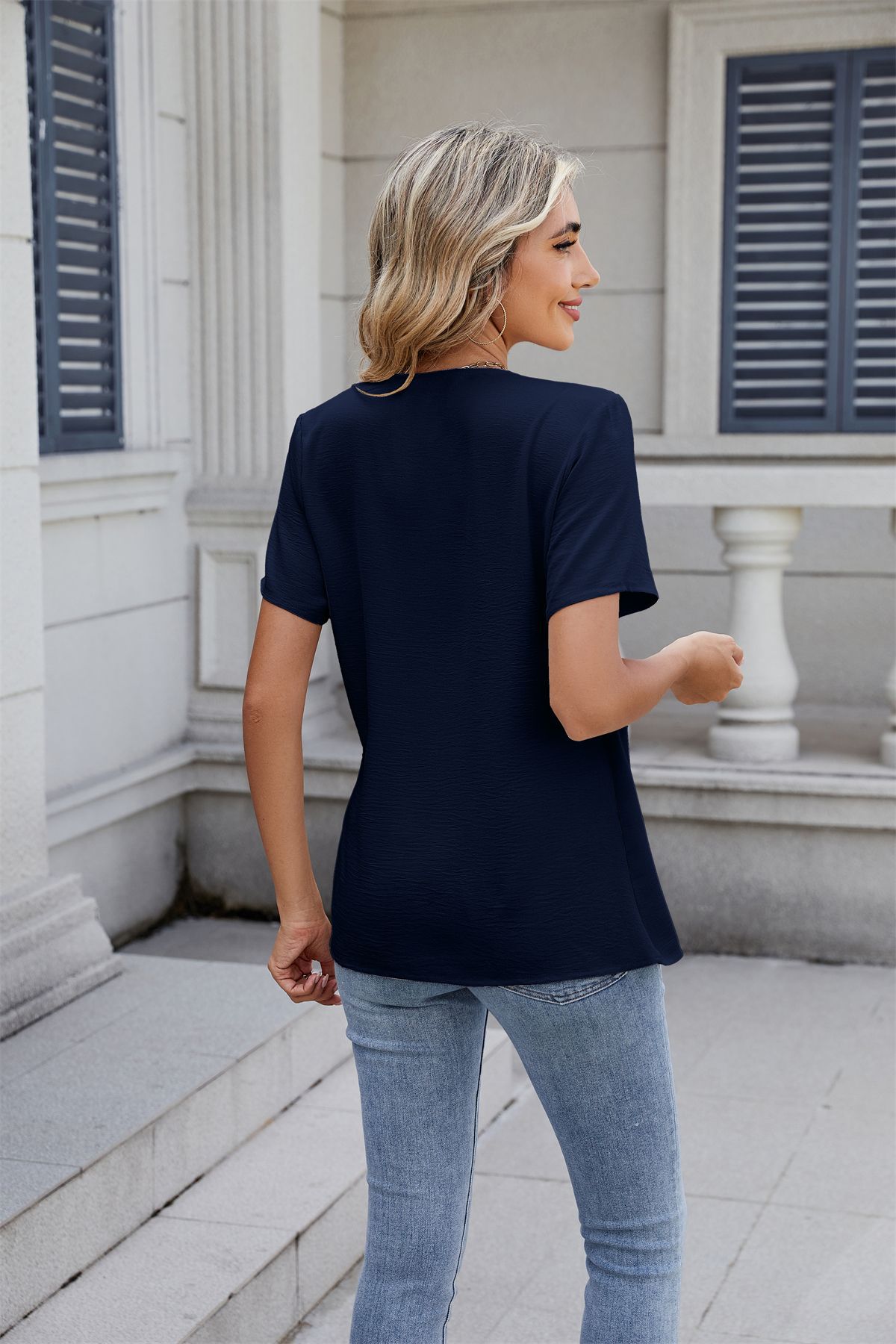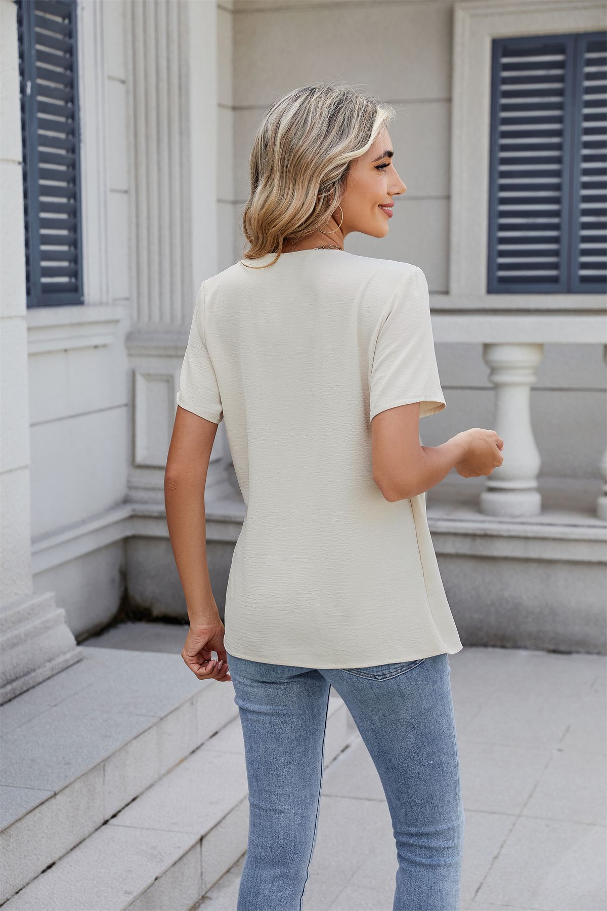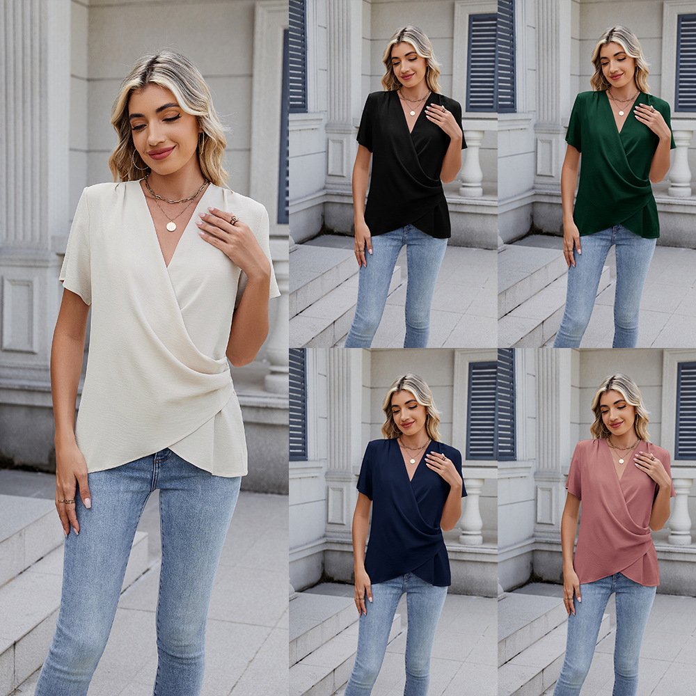 아마존 국경 유럽 및 미국 대외 무역 2025 봄과 여름 새로운 패션 v-neck 여성 풀오버 캐주얼 단색 티셔츠 여성스토어 가기