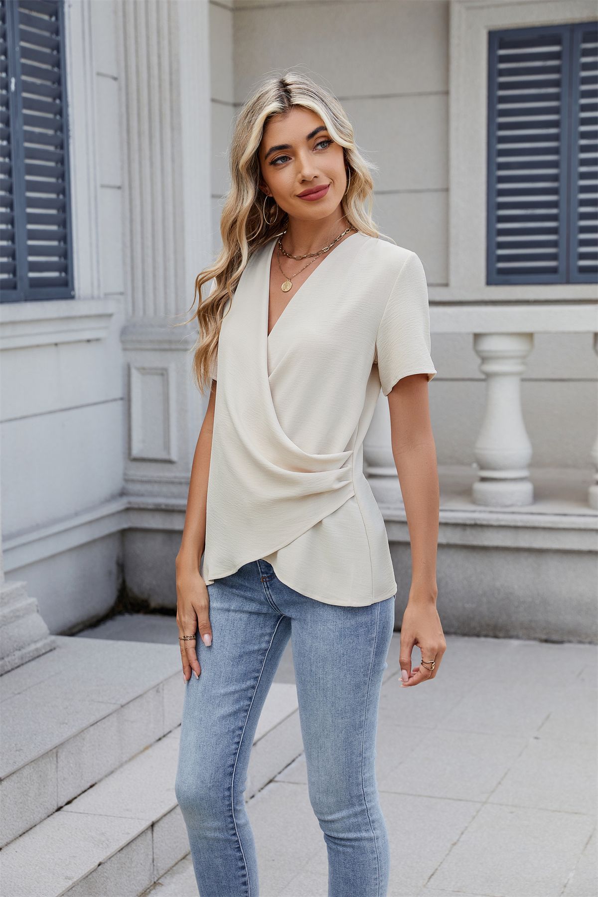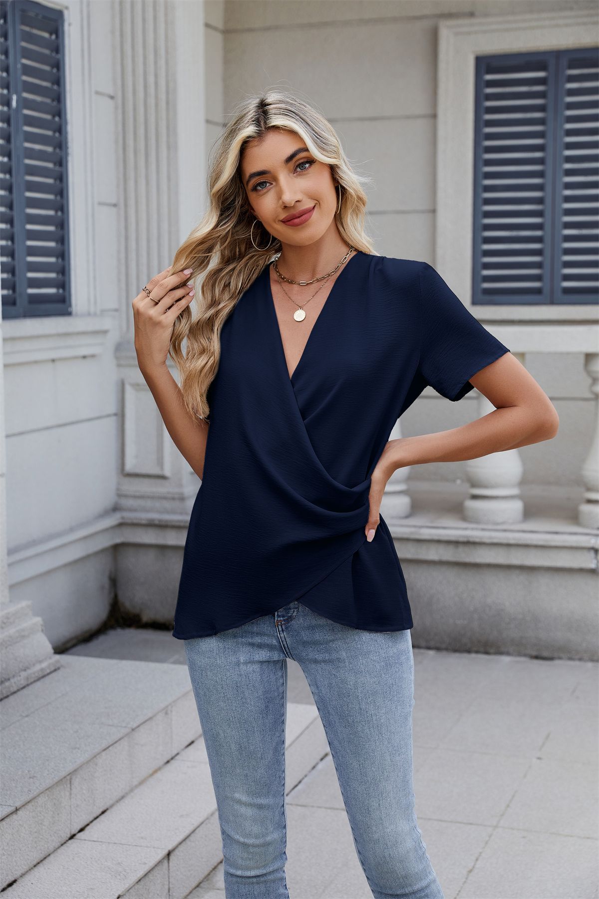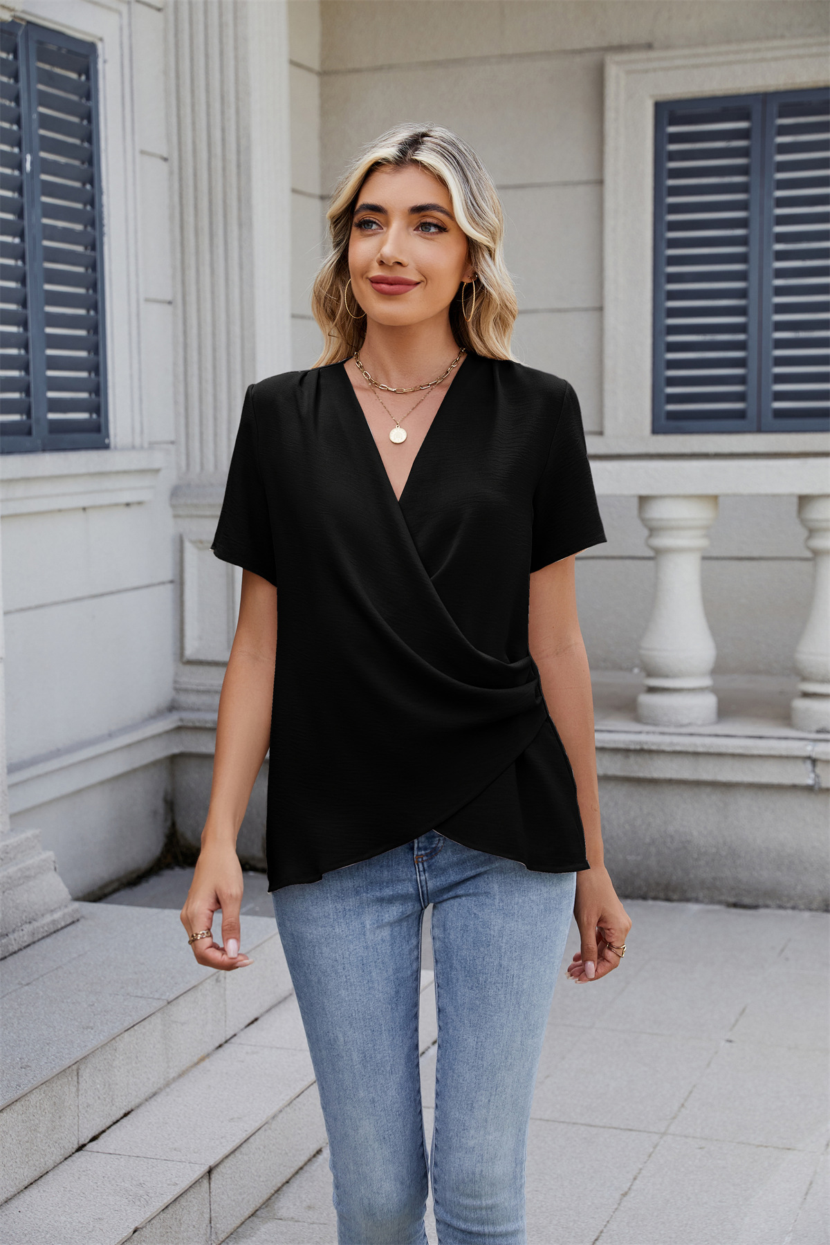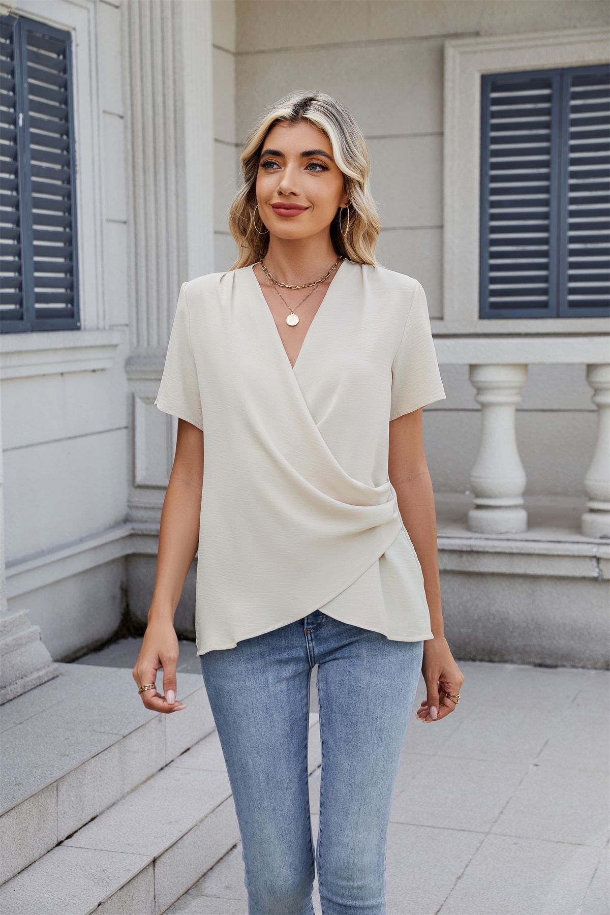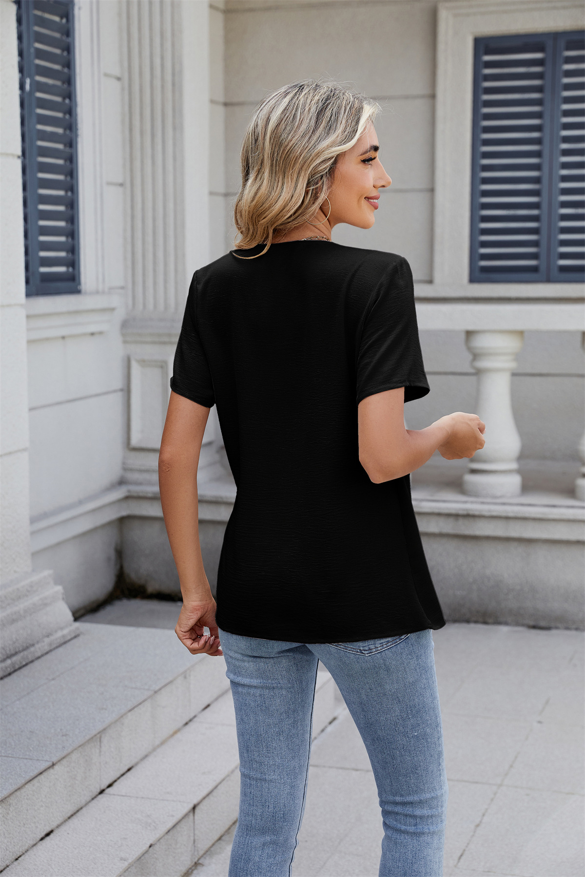 아마존 국경 유럽 및 미국 대외 무역 2025 봄과 여름 새로운 패션 v-neck 여성 풀오버 캐주얼 단색 티셔츠 여성스토어 가기