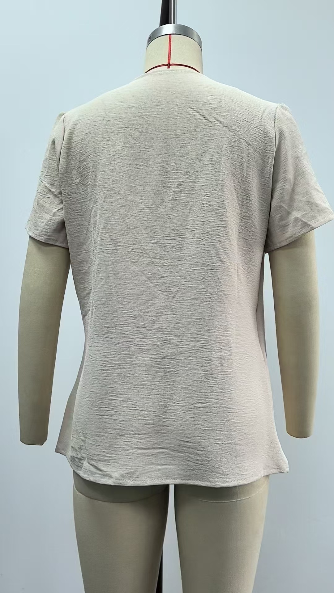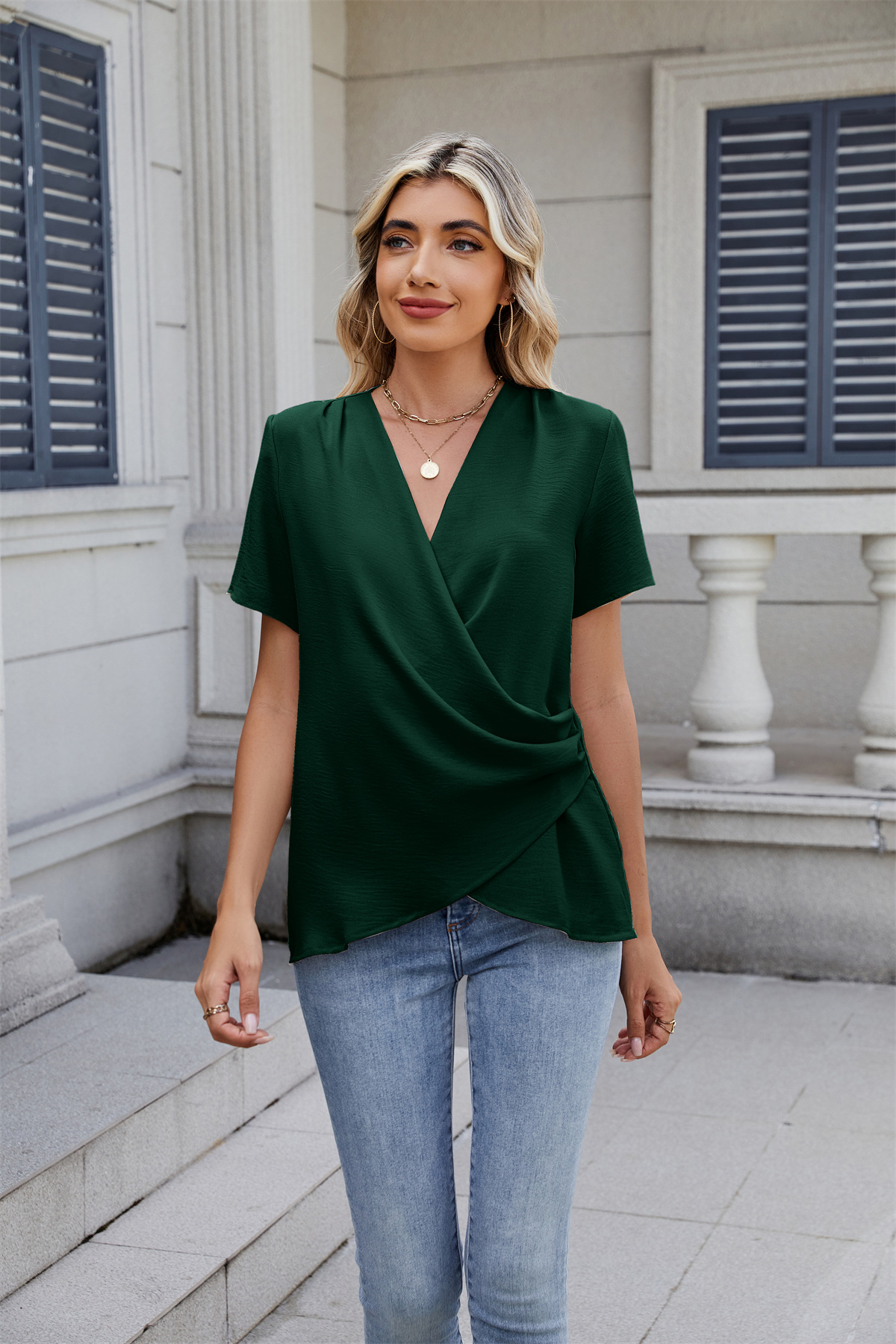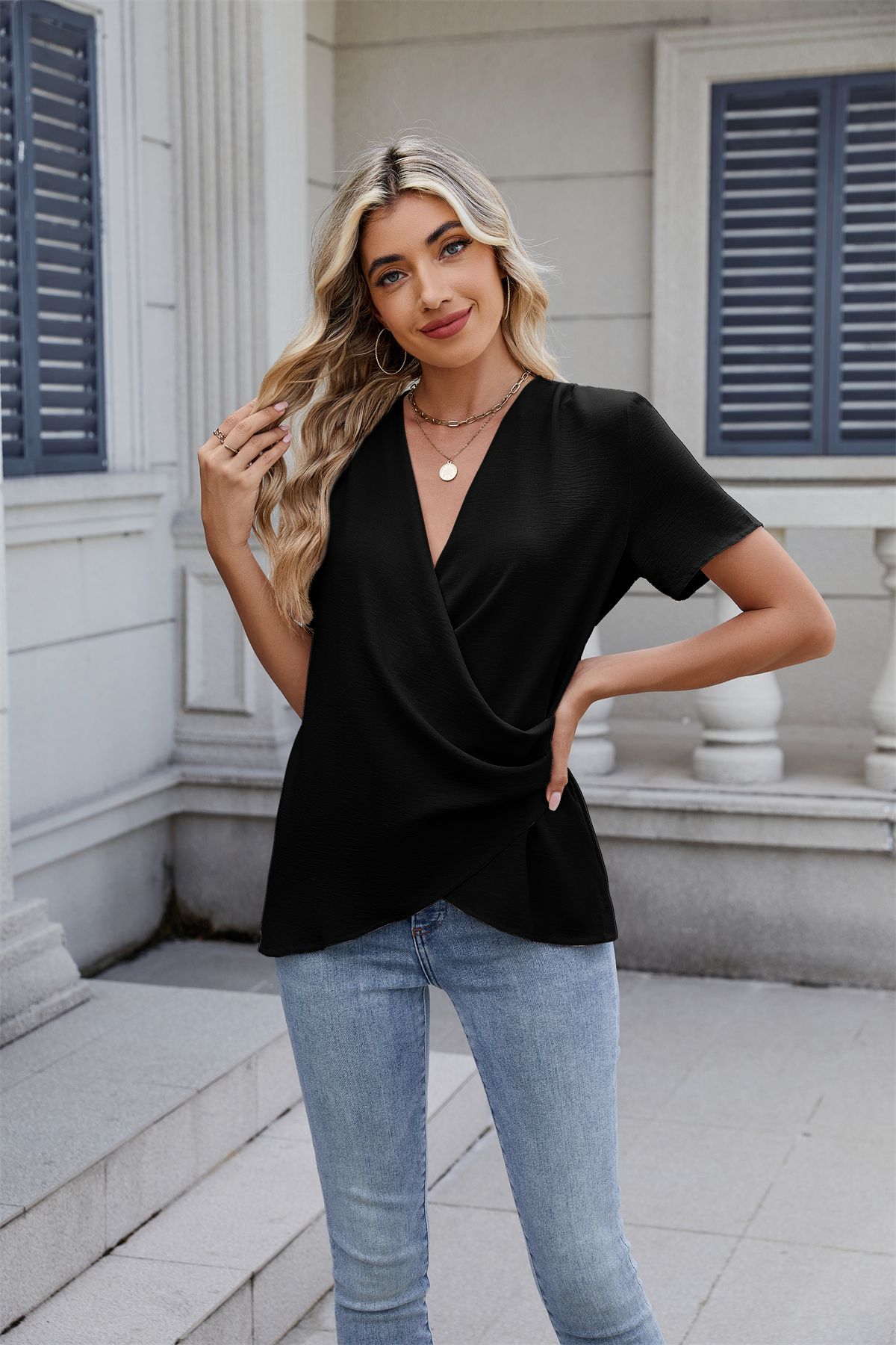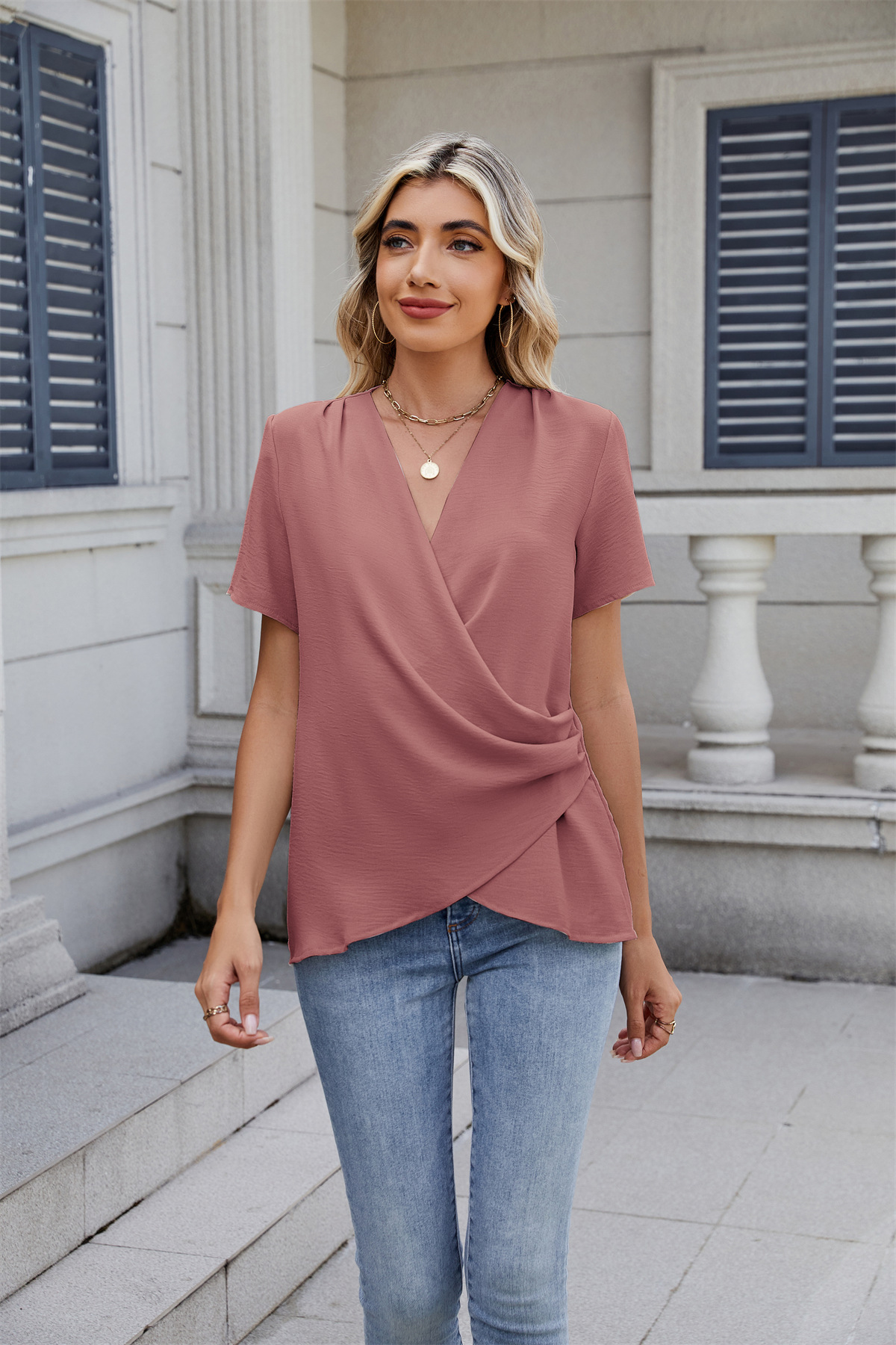 아마존 국경 유럽 및 미국 대외 무역 2025 봄과 여름 새로운 패션 v-neck 여성 풀오버 캐주얼 단색 티셔츠 여성스토어 가기