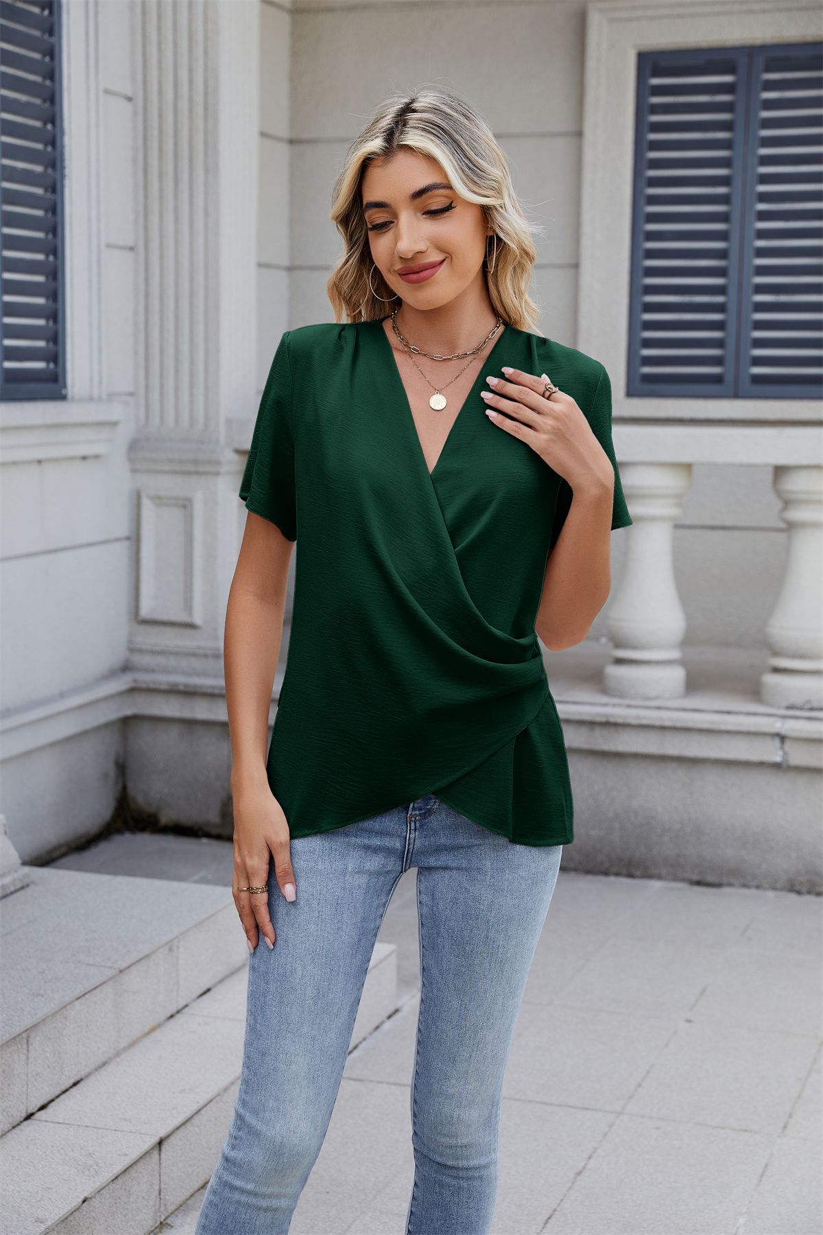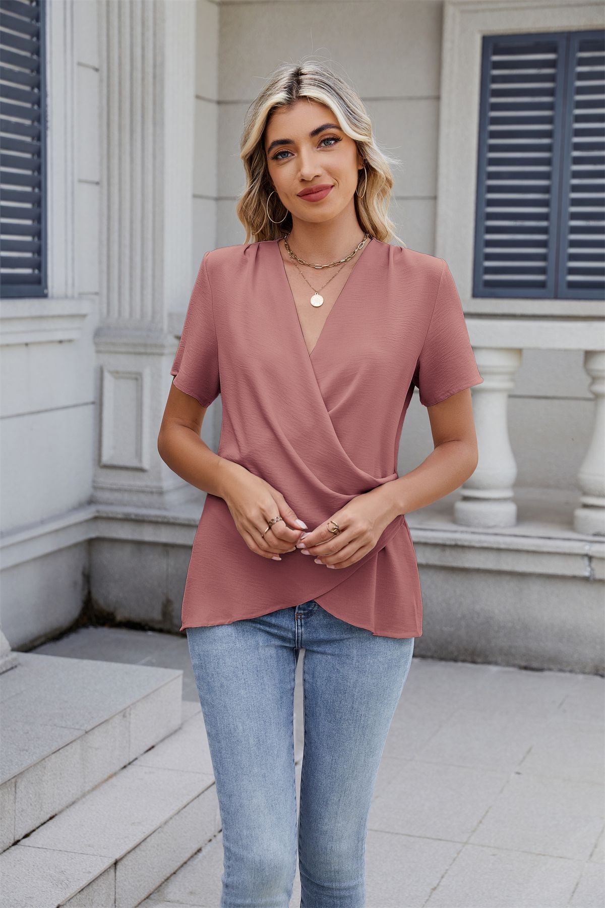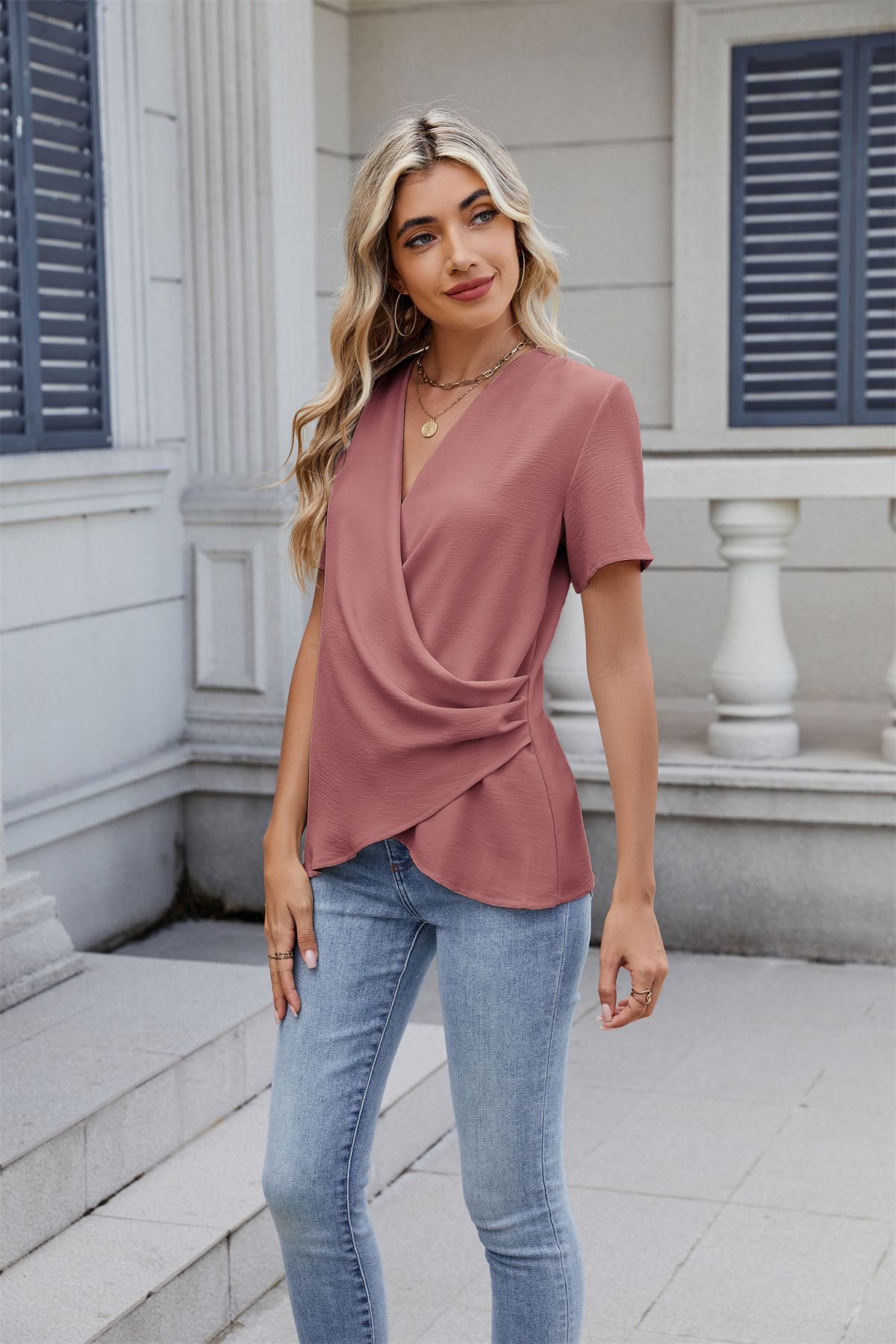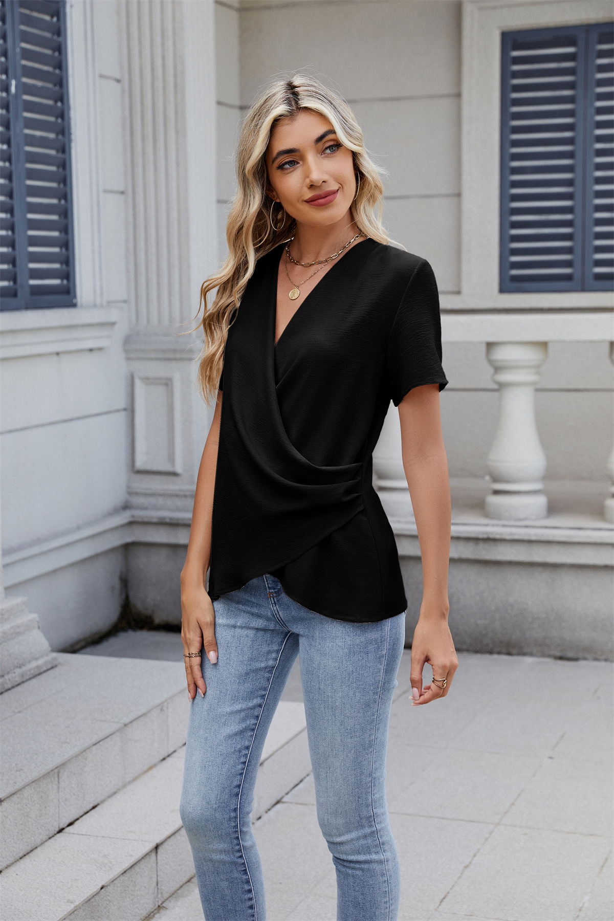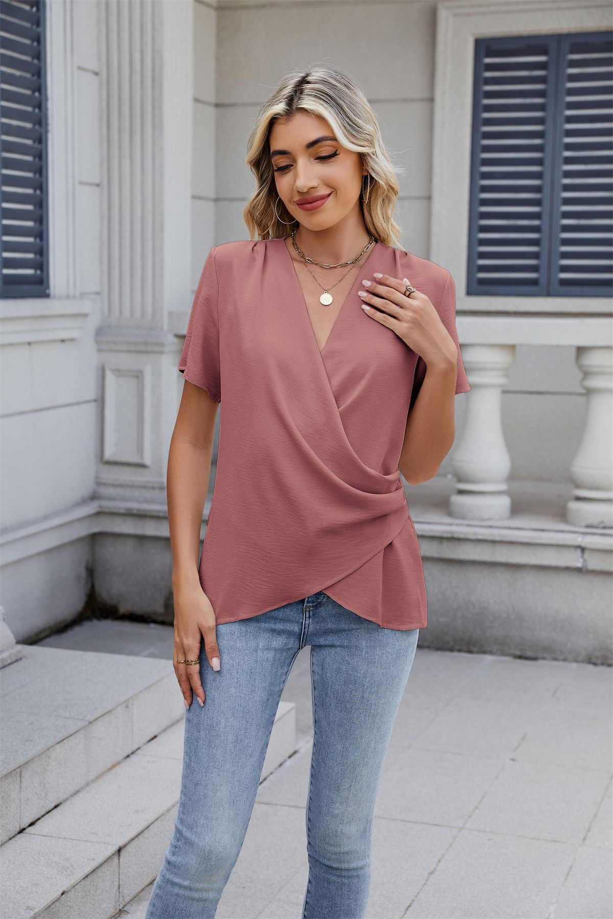 아마존 국경 유럽 및 미국 대외 무역 2025 봄과 여름 새로운 패션 v-neck 여성 풀오버 캐주얼 단색 티셔츠 여성스토어 가기