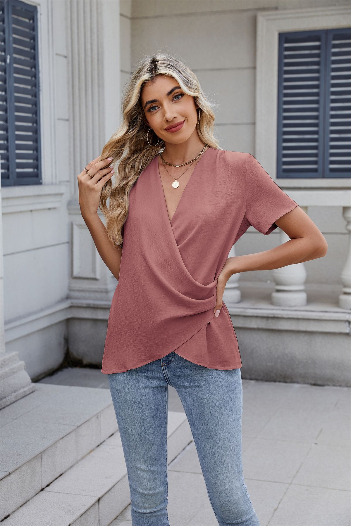아마존 국경 유럽 및 미국 대외 무역 2025 봄과 여름 새로운 패션 v-neck 여성 풀오버 캐주얼 단색 티셔츠 여성