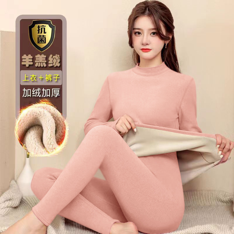 양고기 벨벳 열 속옷 두꺼운 기모 벨벳베이스 난방 중간 칼라 가을 옷과 바지 여성 세트 가을과 겨울