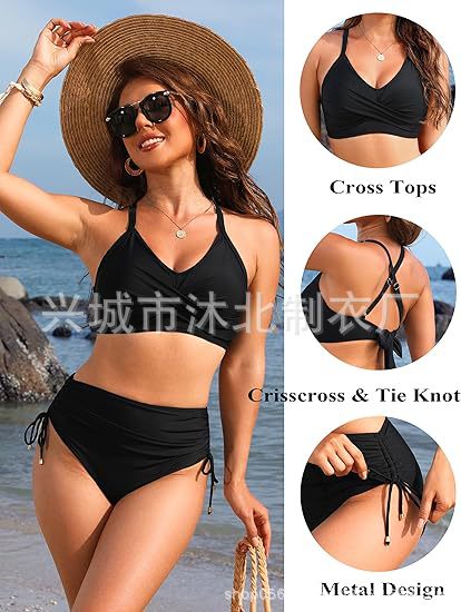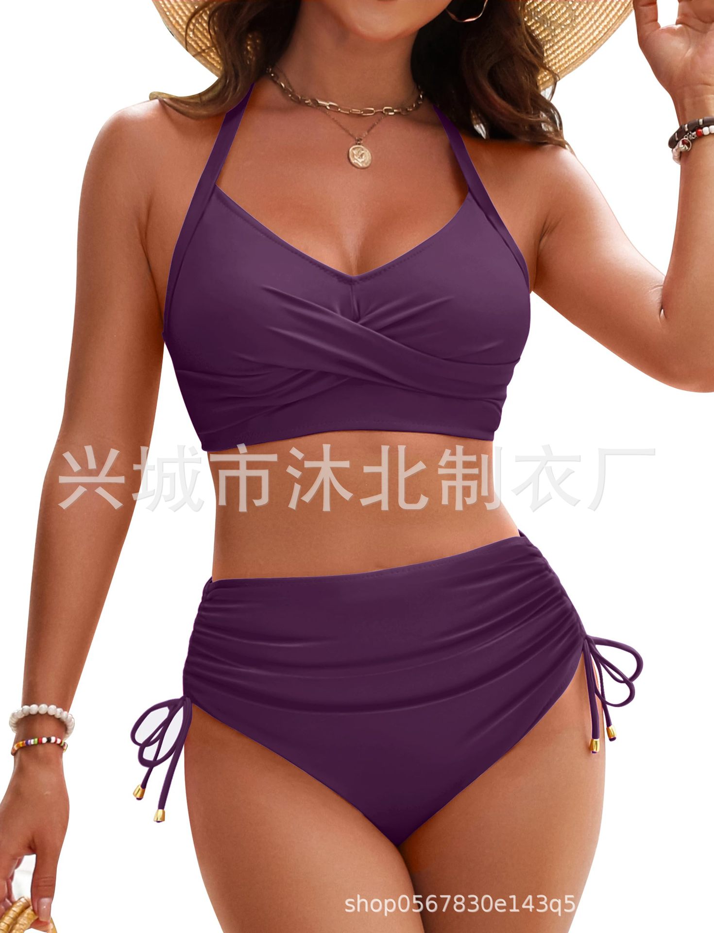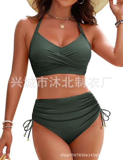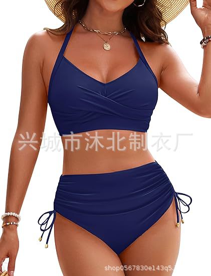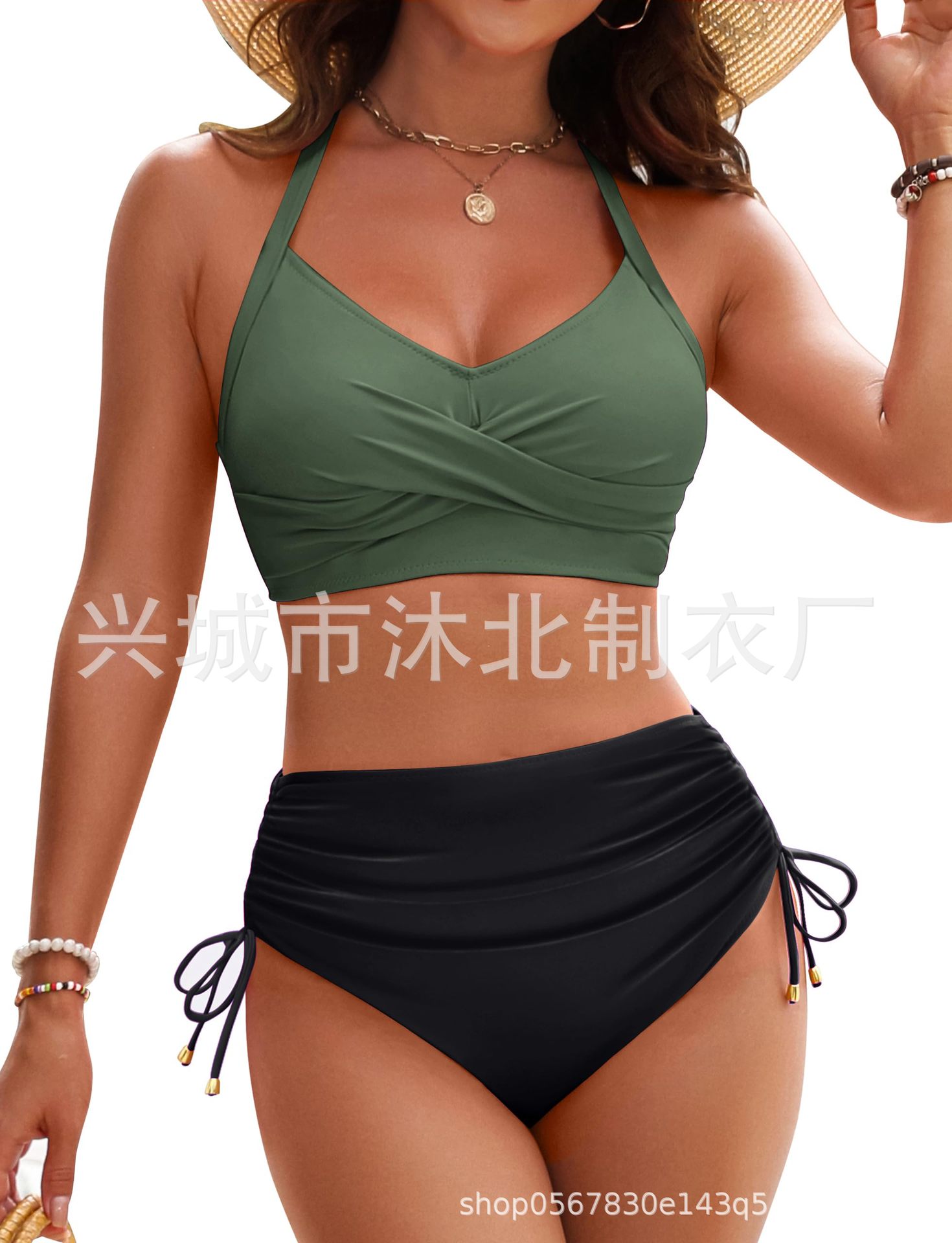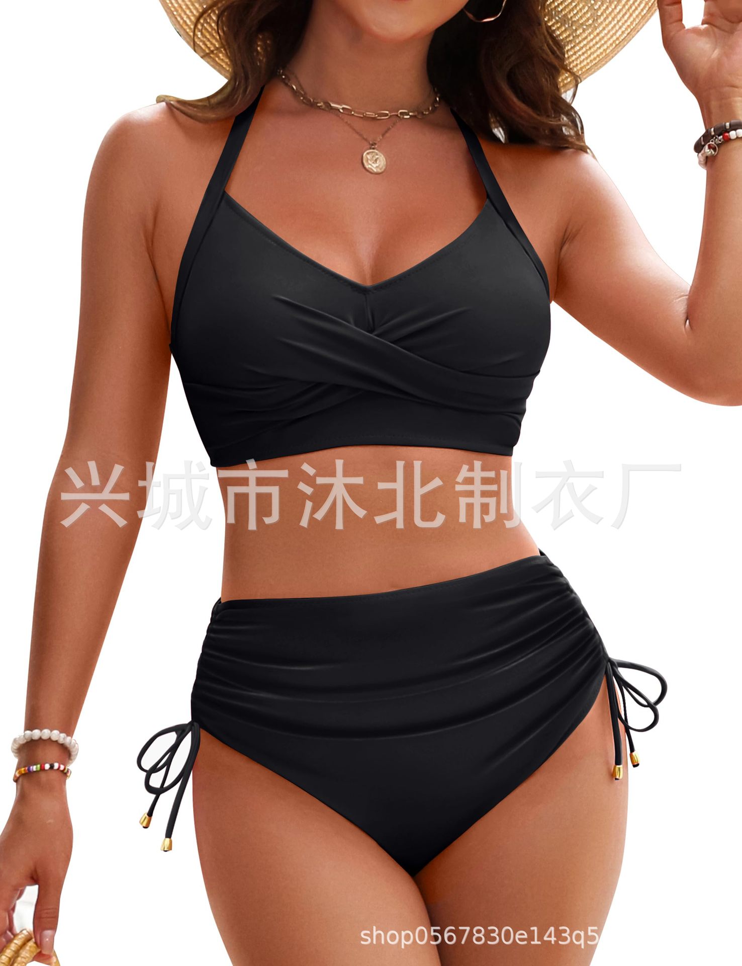 유럽과 미국 여성의 새로운 하이 웨이스트 비키니 세트, 조임끈이 있는 배 조절 수영복, 크로스 타이 수영복 2025