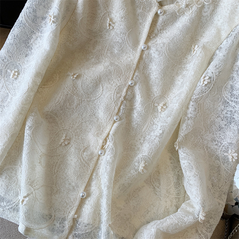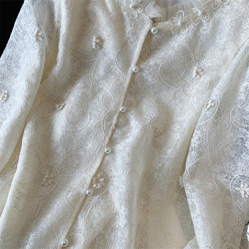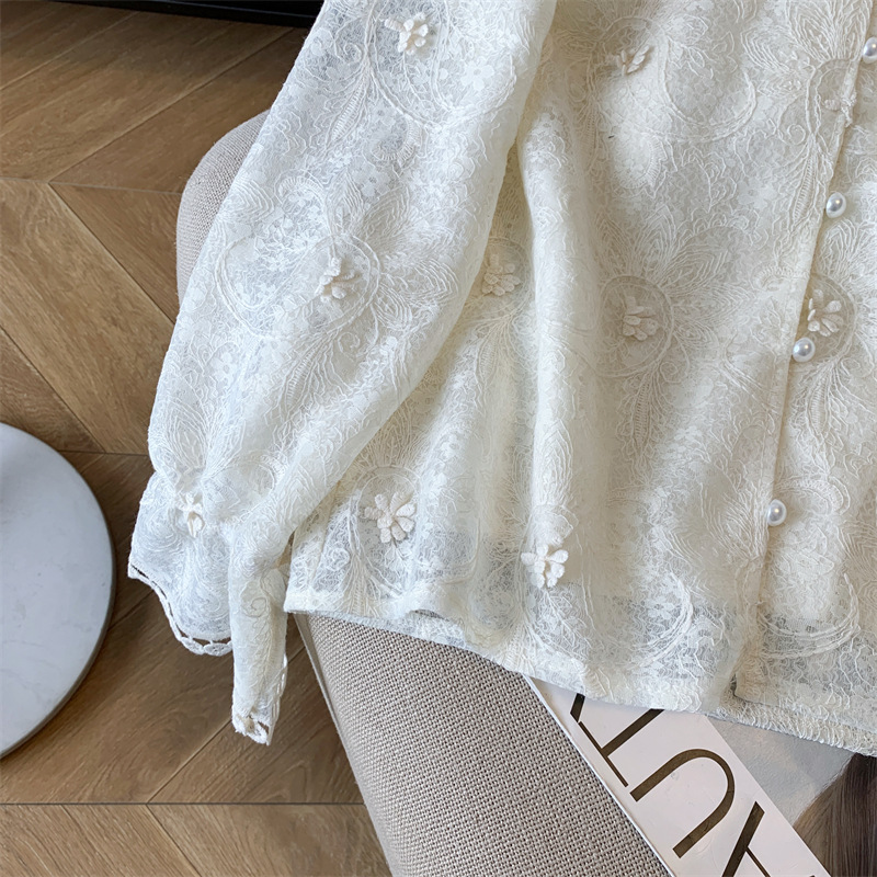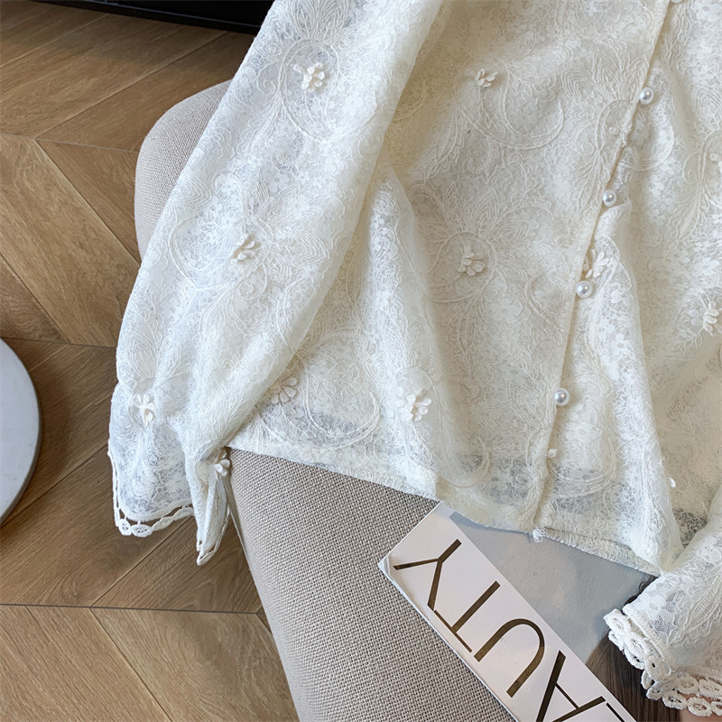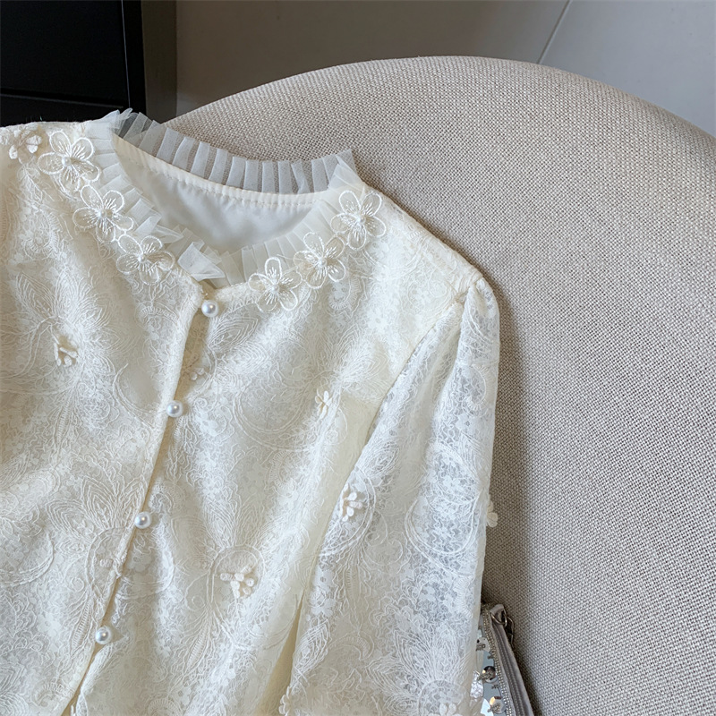 리얼 샷 연예인 스타일 레이스 칼라 꽃 자수 귀 레이스 쉬폰 셔츠 뿔 소매 크로 셰 셔츠