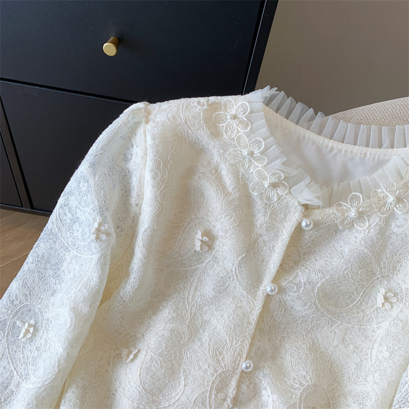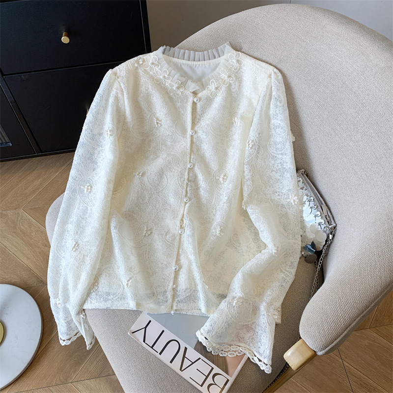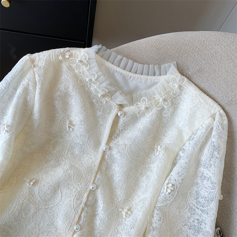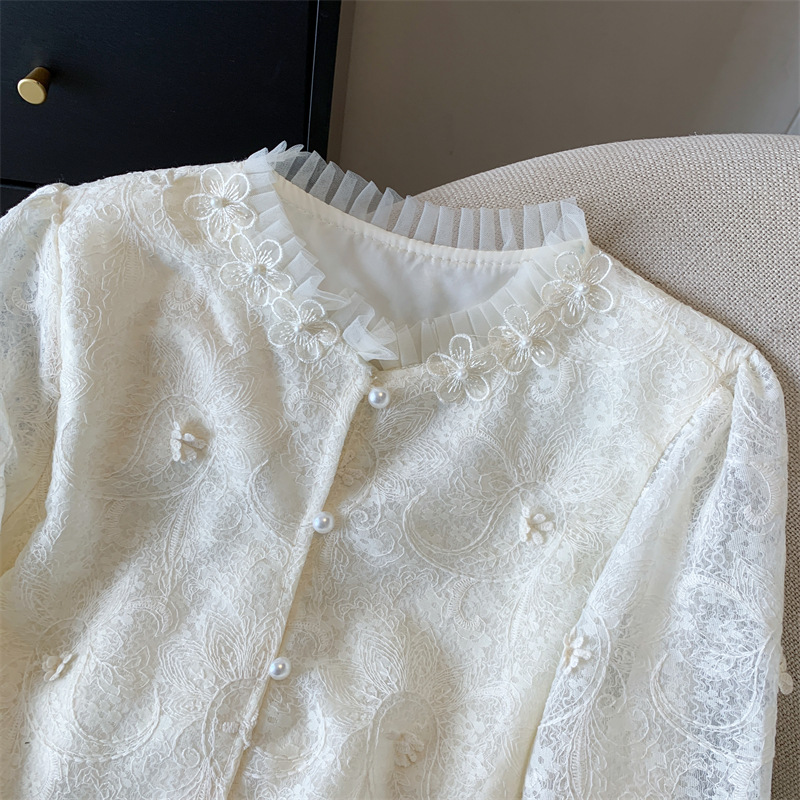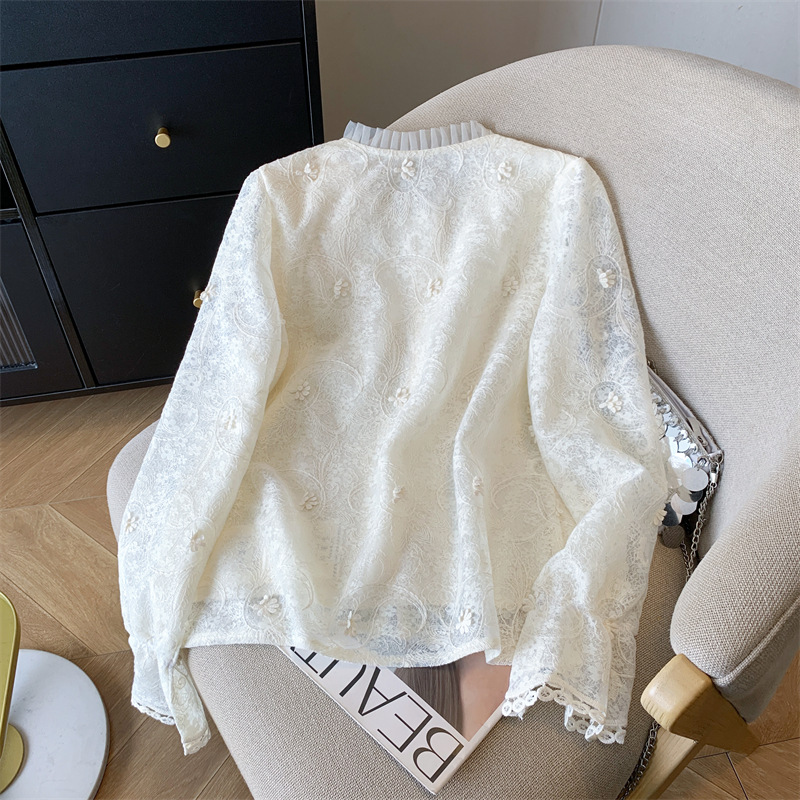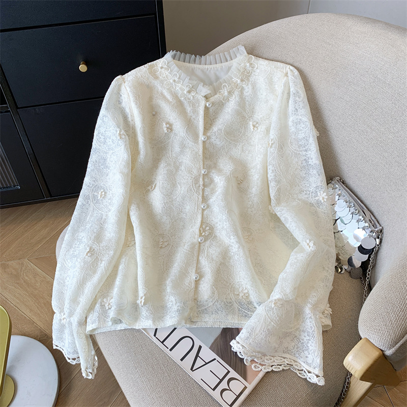 实拍 名媛风蕾丝立领花朵刺绣木耳边蕾丝雪纺衫喇叭袖钩花小衫