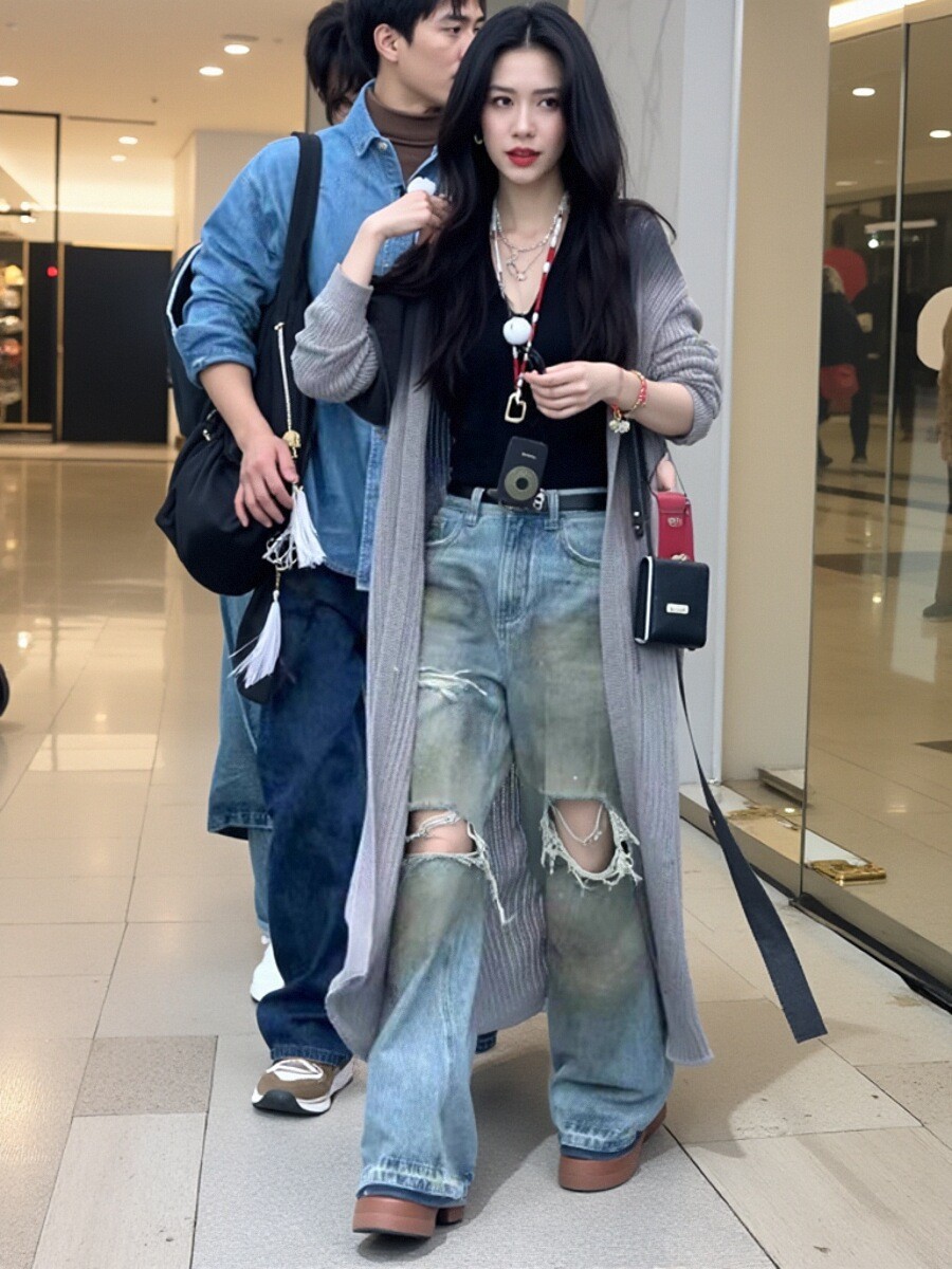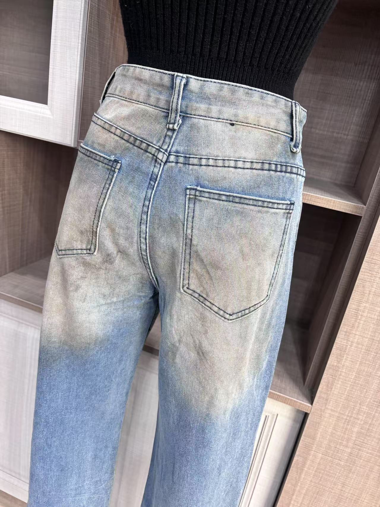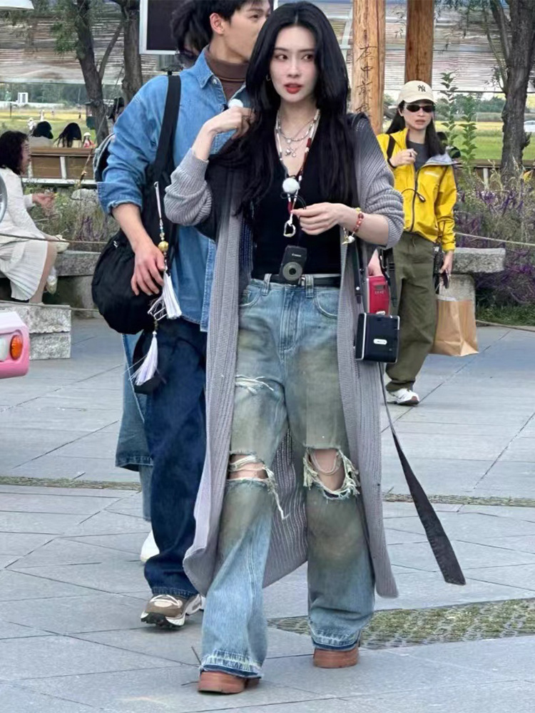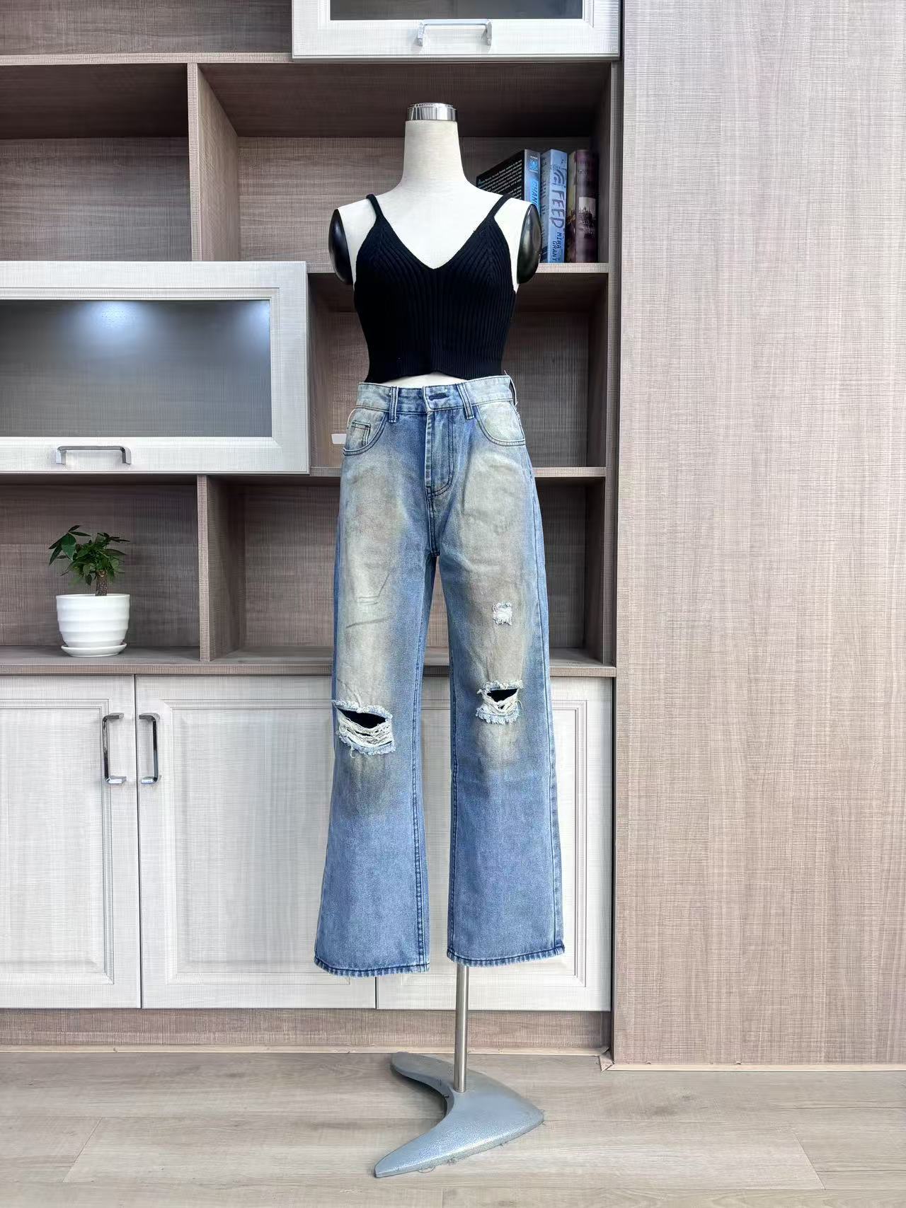 현물 판매 중인 맹자이와 동일한 스타일의 크로스보더 디자인의 찢어진 와이드 레그 청바지 여성용 2024 신상 디자인의 롱 팬츠 트렌디 여성용스토어 가기