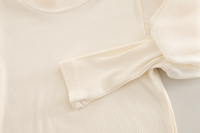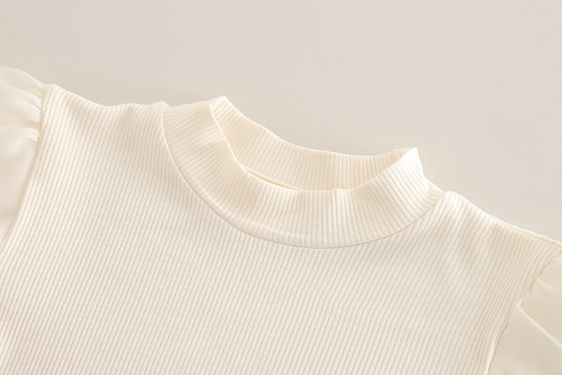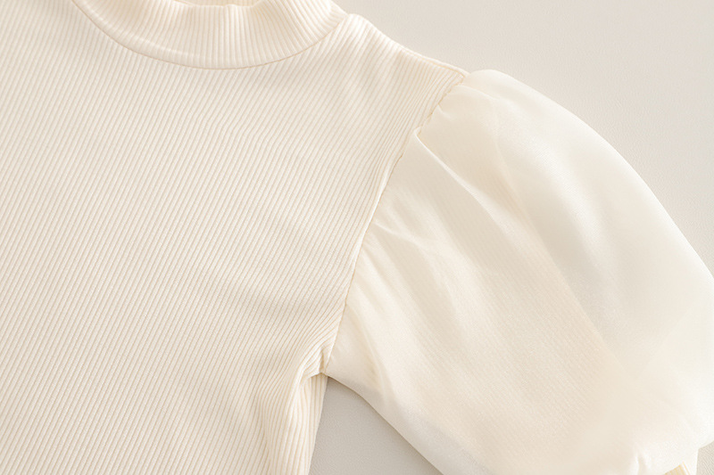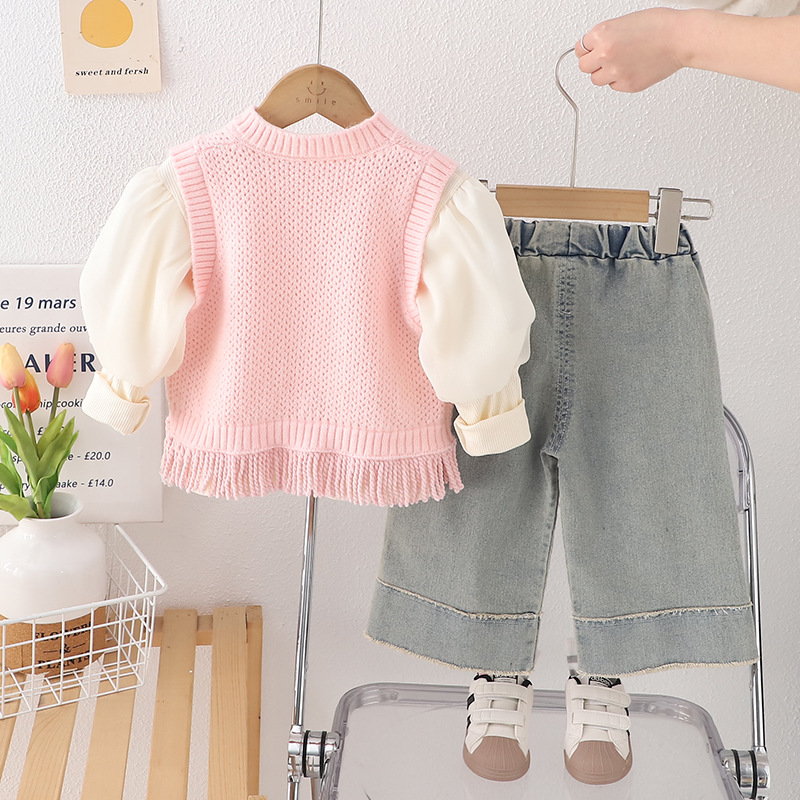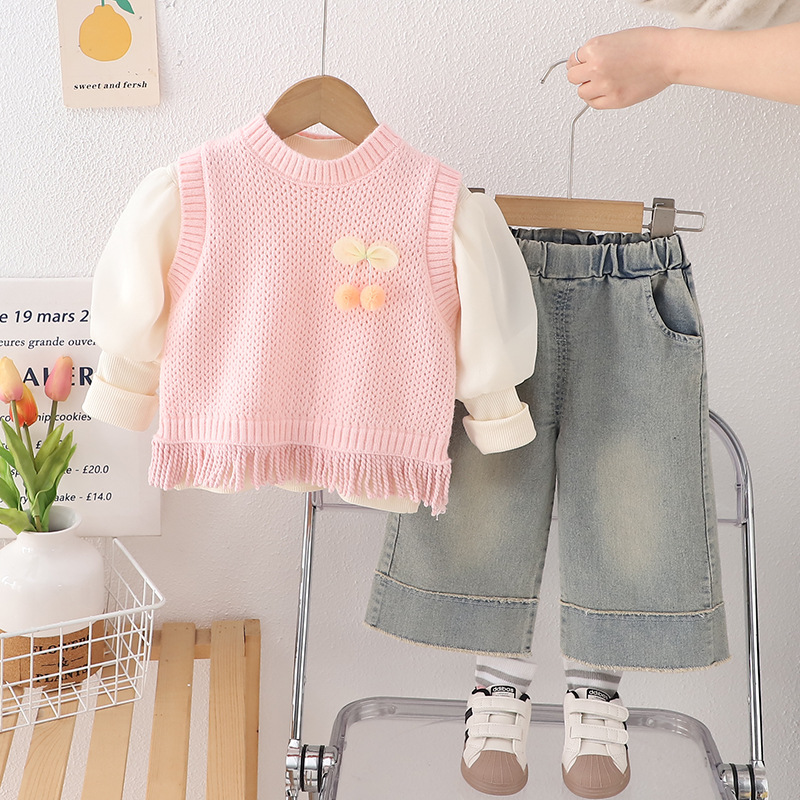 소녀 세트 2025 봄 새로운 니트 스웨터 조끼 체리 버블 슬리브 큰 발 청바지 어린이 3 피스 세트