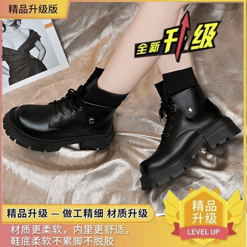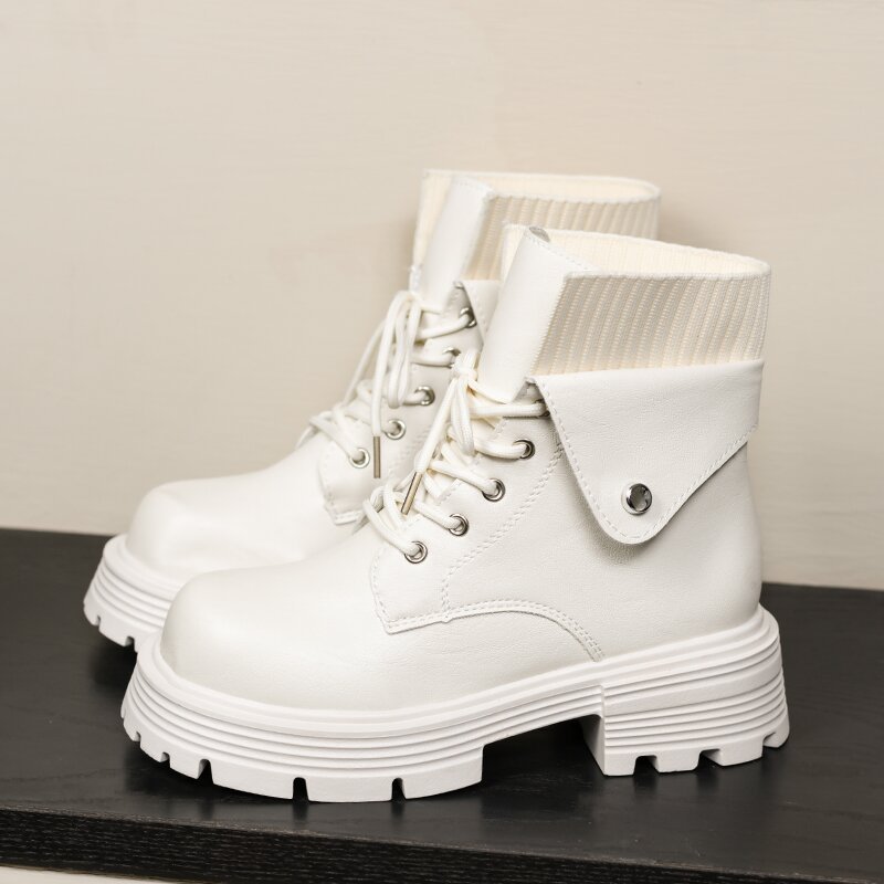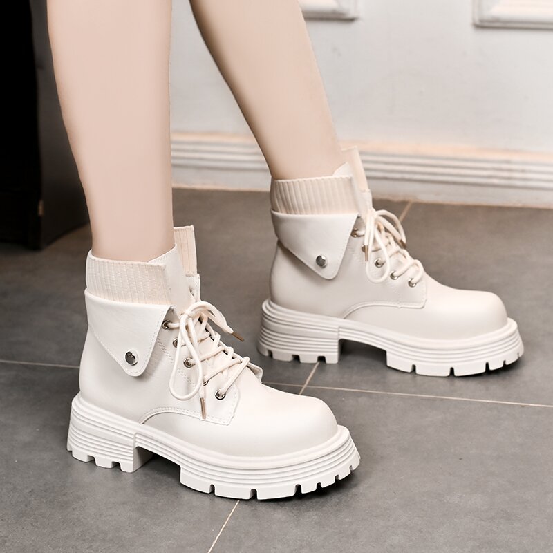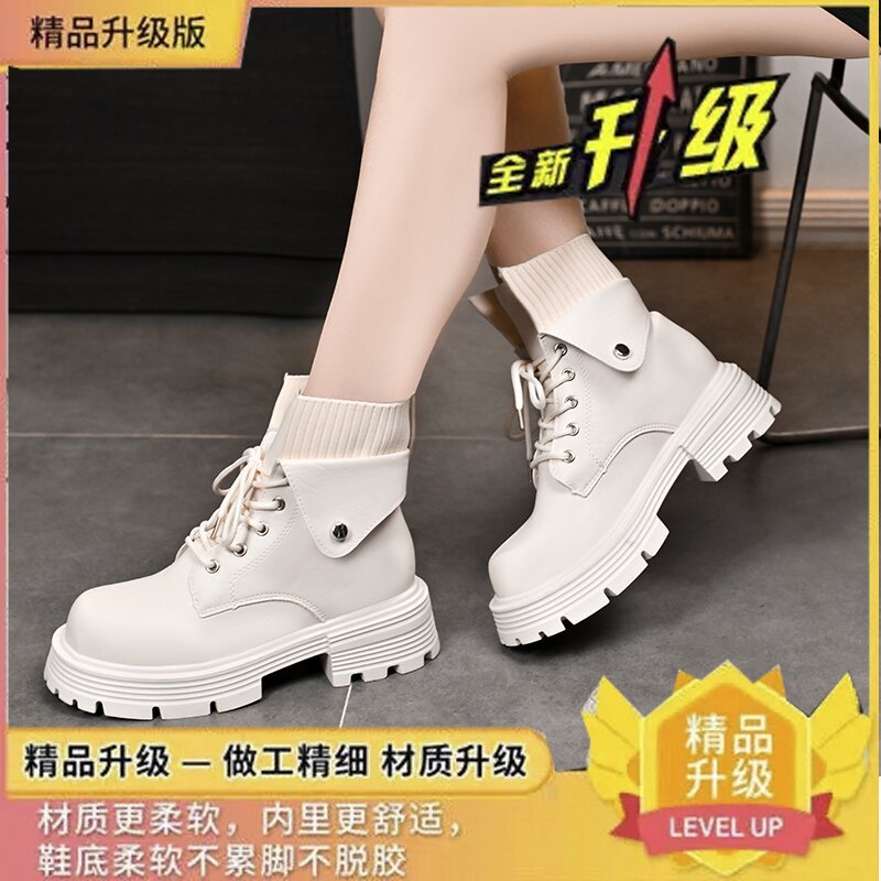 한국 버전의 흰색 턴 오버 양말 부츠 두꺼운 힐 작은 조커 마틴 2024 가을과 겨울 새로운 기모 가죽 부츠스토어 가기