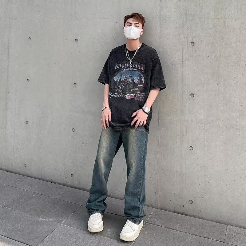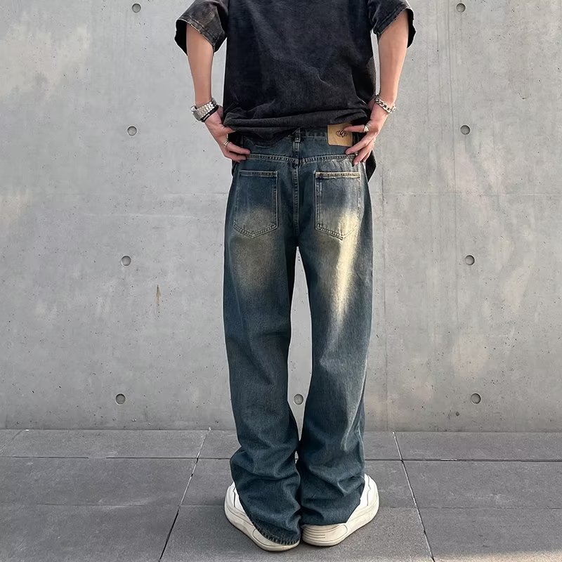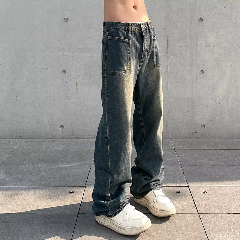 미국식 하이 스트리트 워시 빈티지 블루 올드 포켓 디자인 센스 툴링 청바지 남성용 트렌디 브랜드 스트레이트 슬리밍 바지스토어 가기