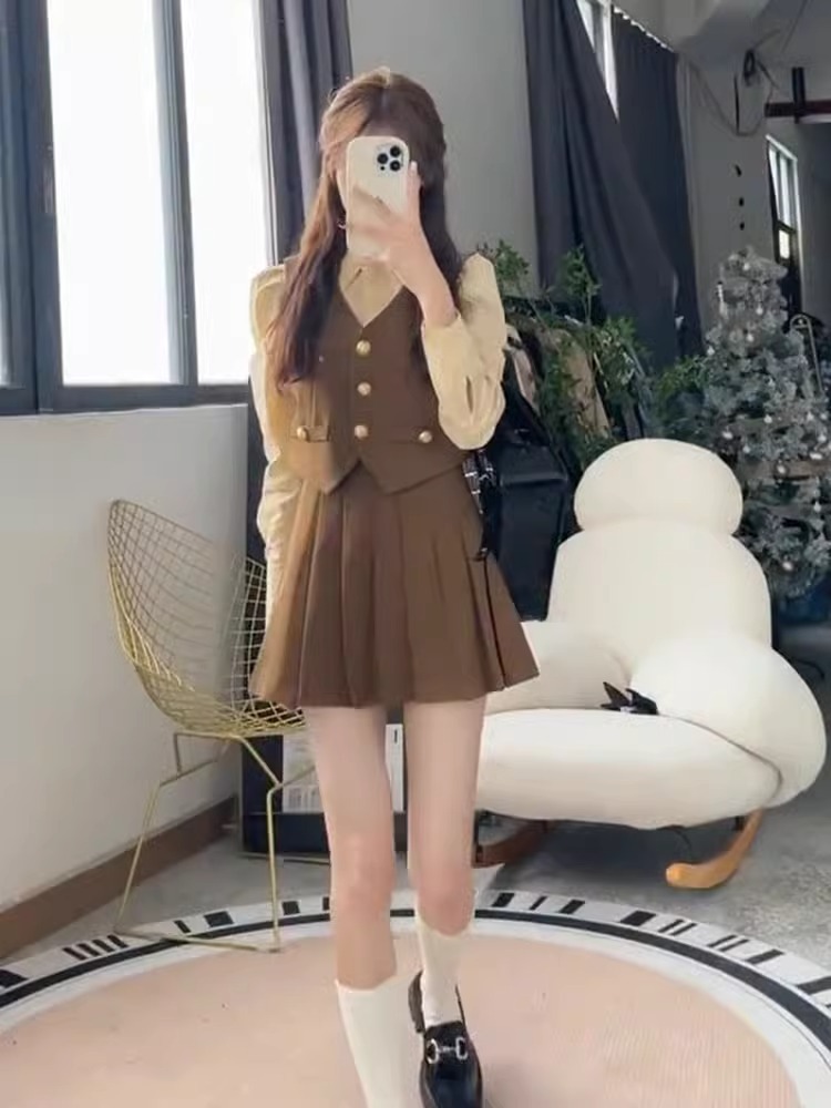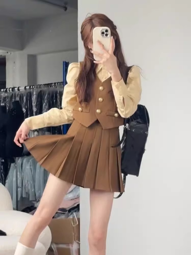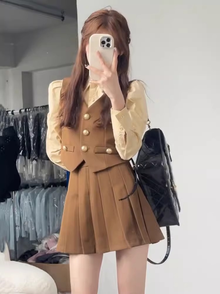영국 아카데미 스타일 원피스 여성의 가을 새로운 작은 세트 조끼 줄무늬 셔츠 긴 소매 주름 치마 3 종 세트스토어 가기