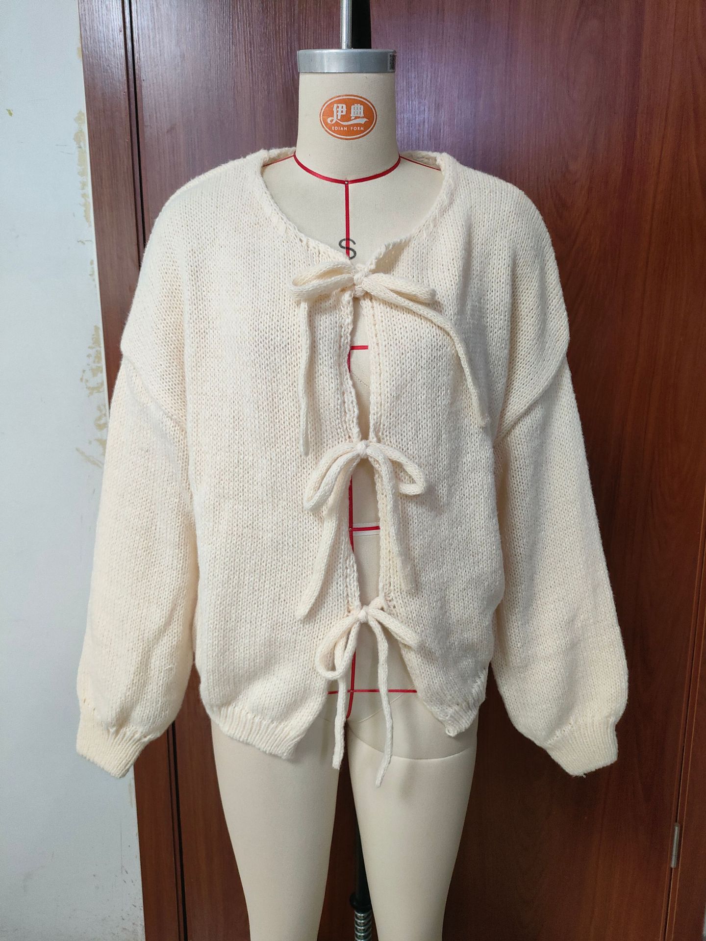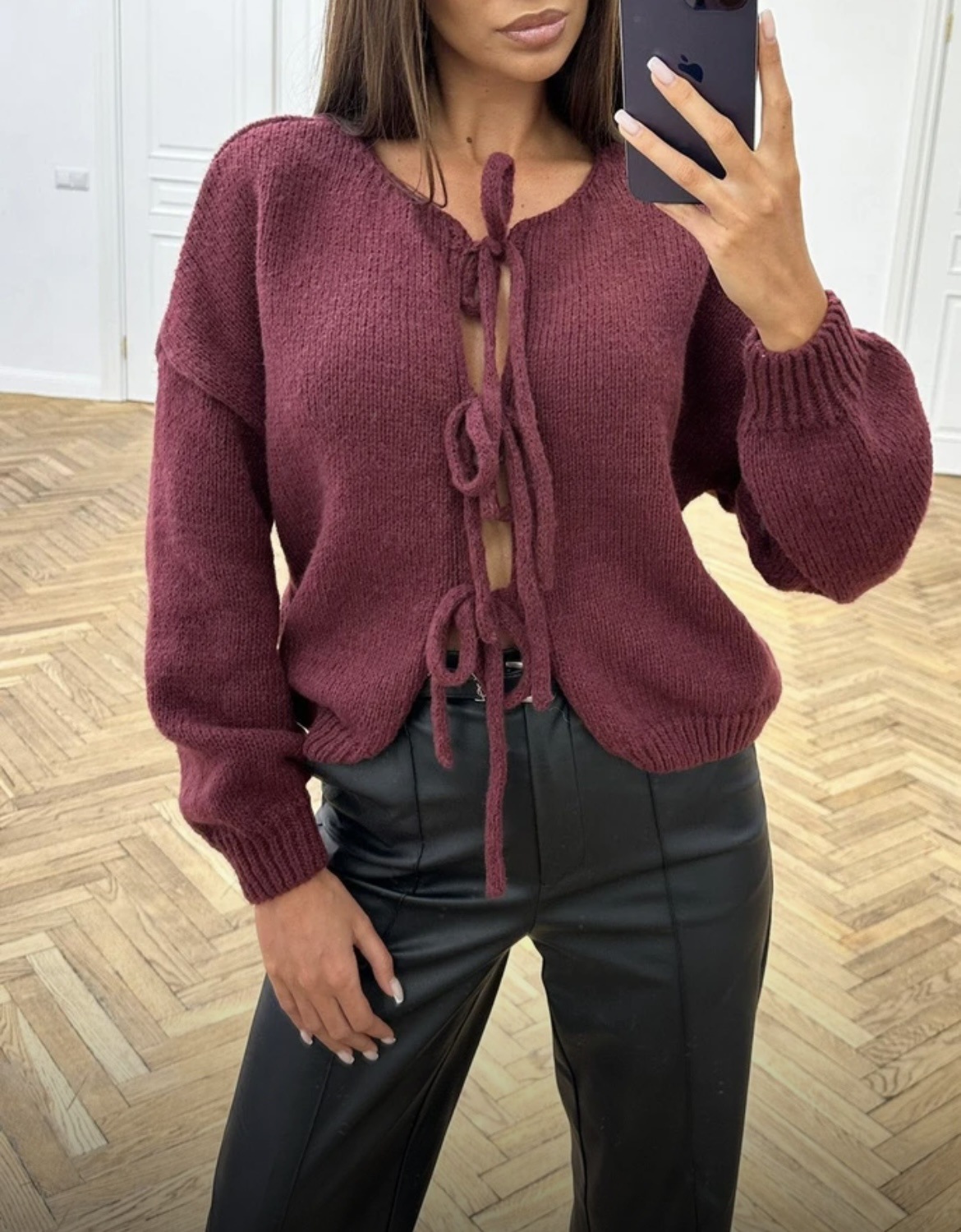 크루 넥 레이스 업 니트 카디건 재킷 2025 유럽 및 미국 국경 가을 및 겨울 새로운 단색 통근 여성을위한 간단한 스웨터