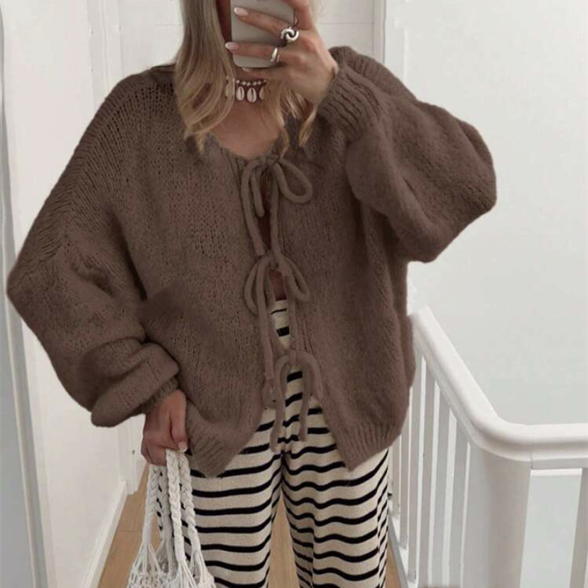 크루 넥 레이스 업 니트 카디건 재킷 2025 유럽 및 미국 국경 가을 및 겨울 새로운 단색 통근 여성을위한 간단한 스웨터스토어 가기