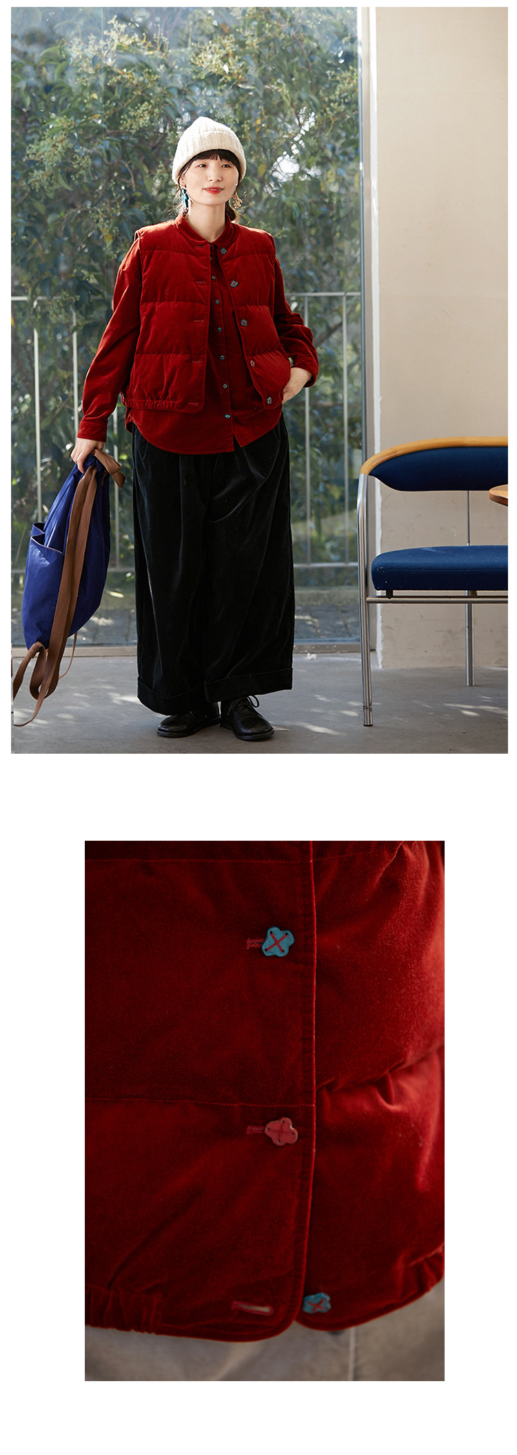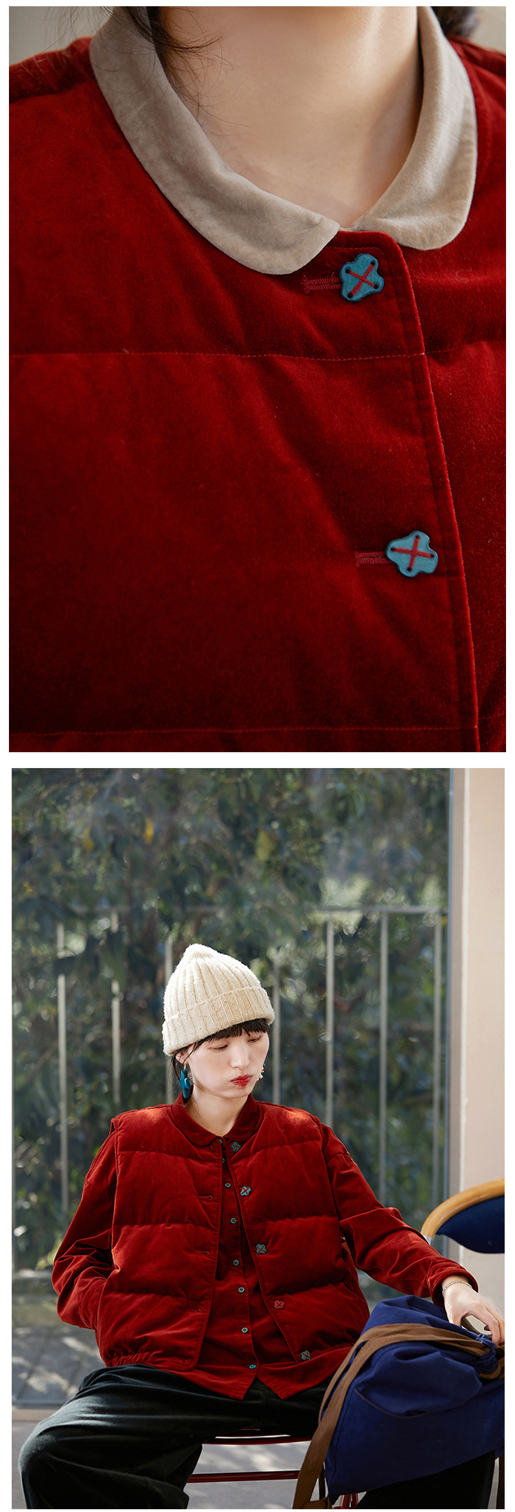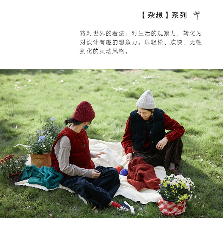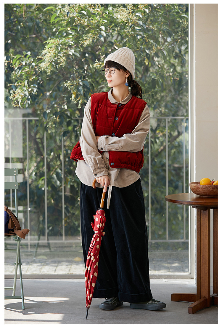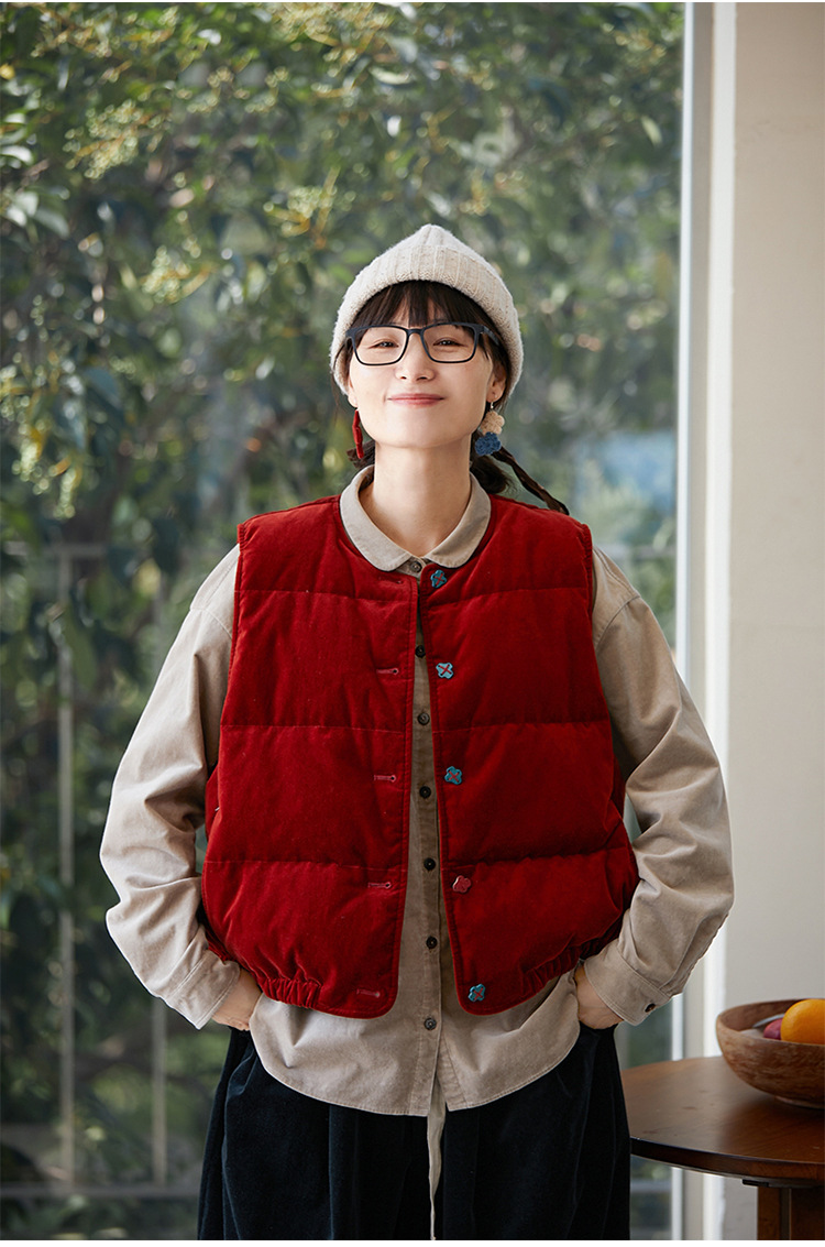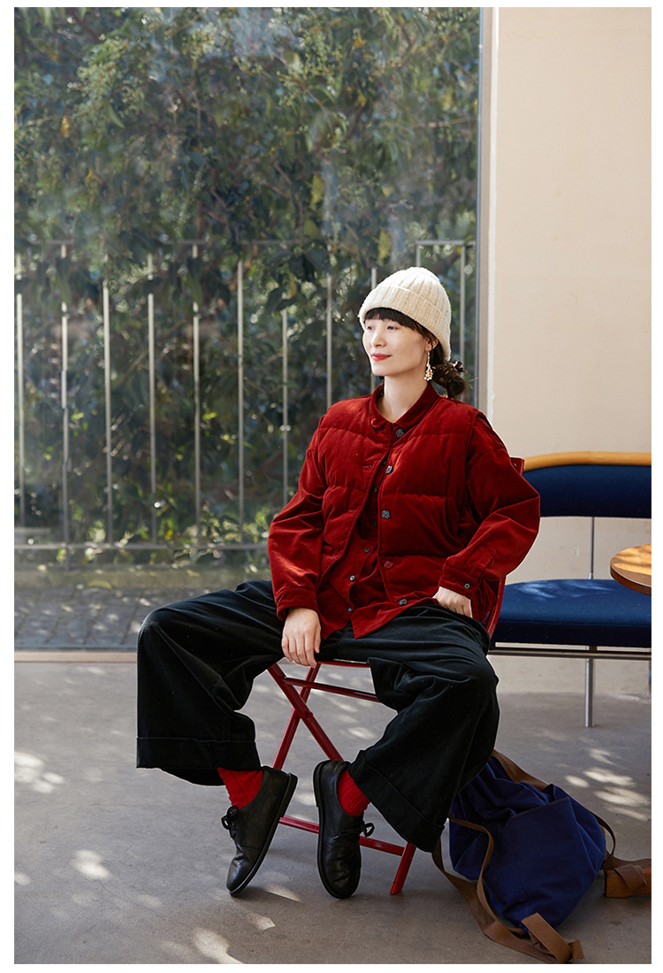 壹旧原著【杂想】冬款丝绒红平绒棉宽松保暖亲肤羽绒女马甲9292B