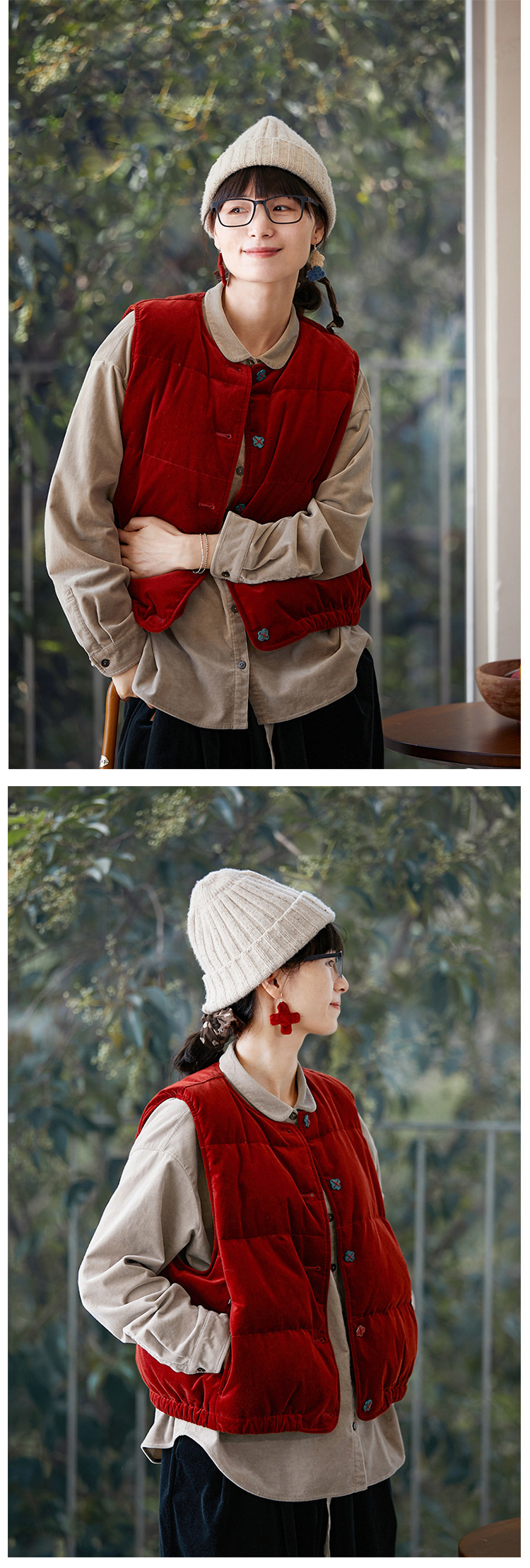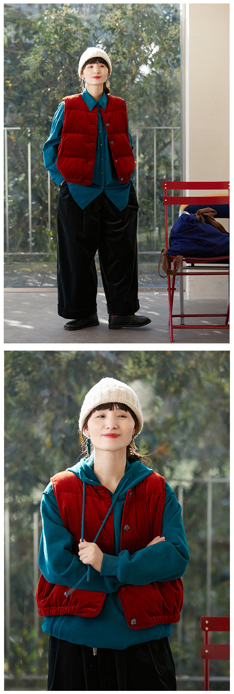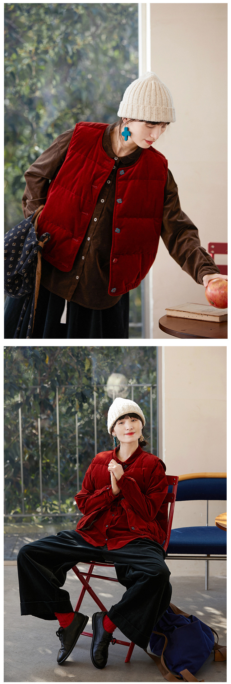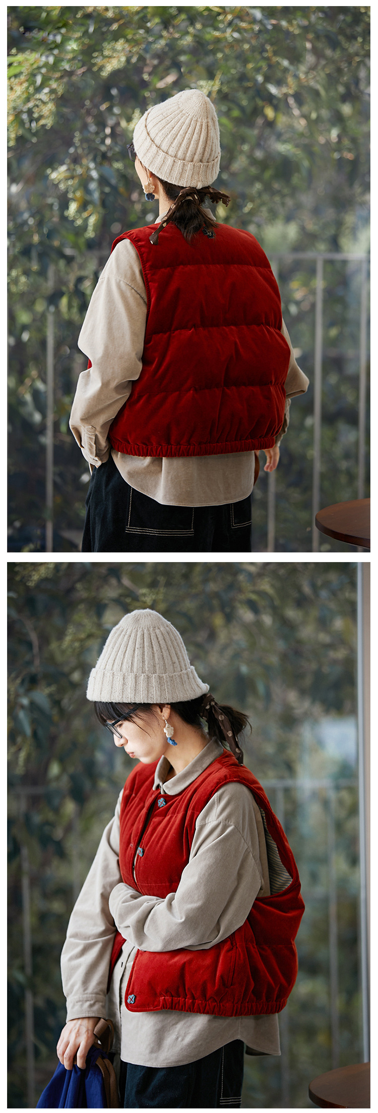 壹旧原著【杂想】冬款丝绒红平绒棉宽松保暖亲肤羽绒女马甲9292B